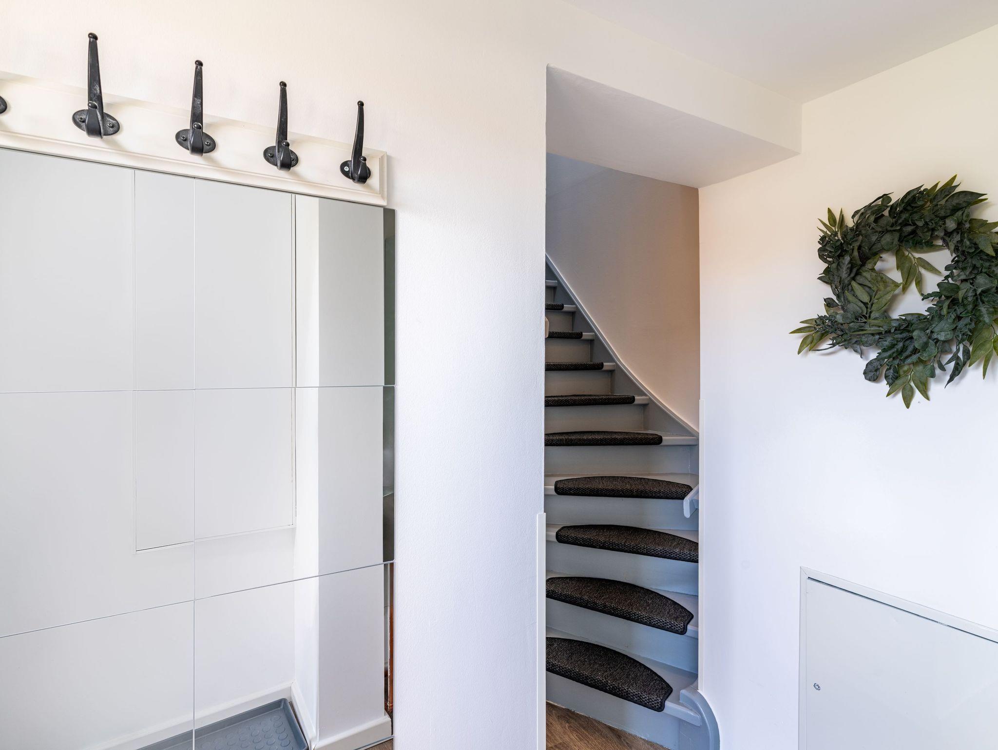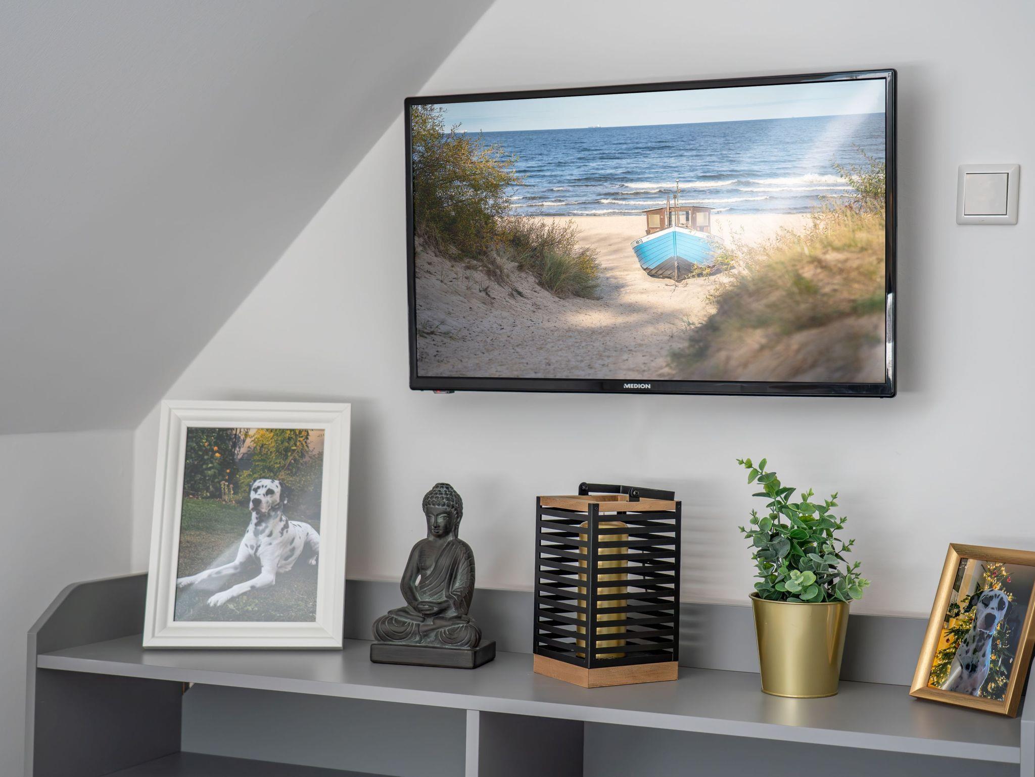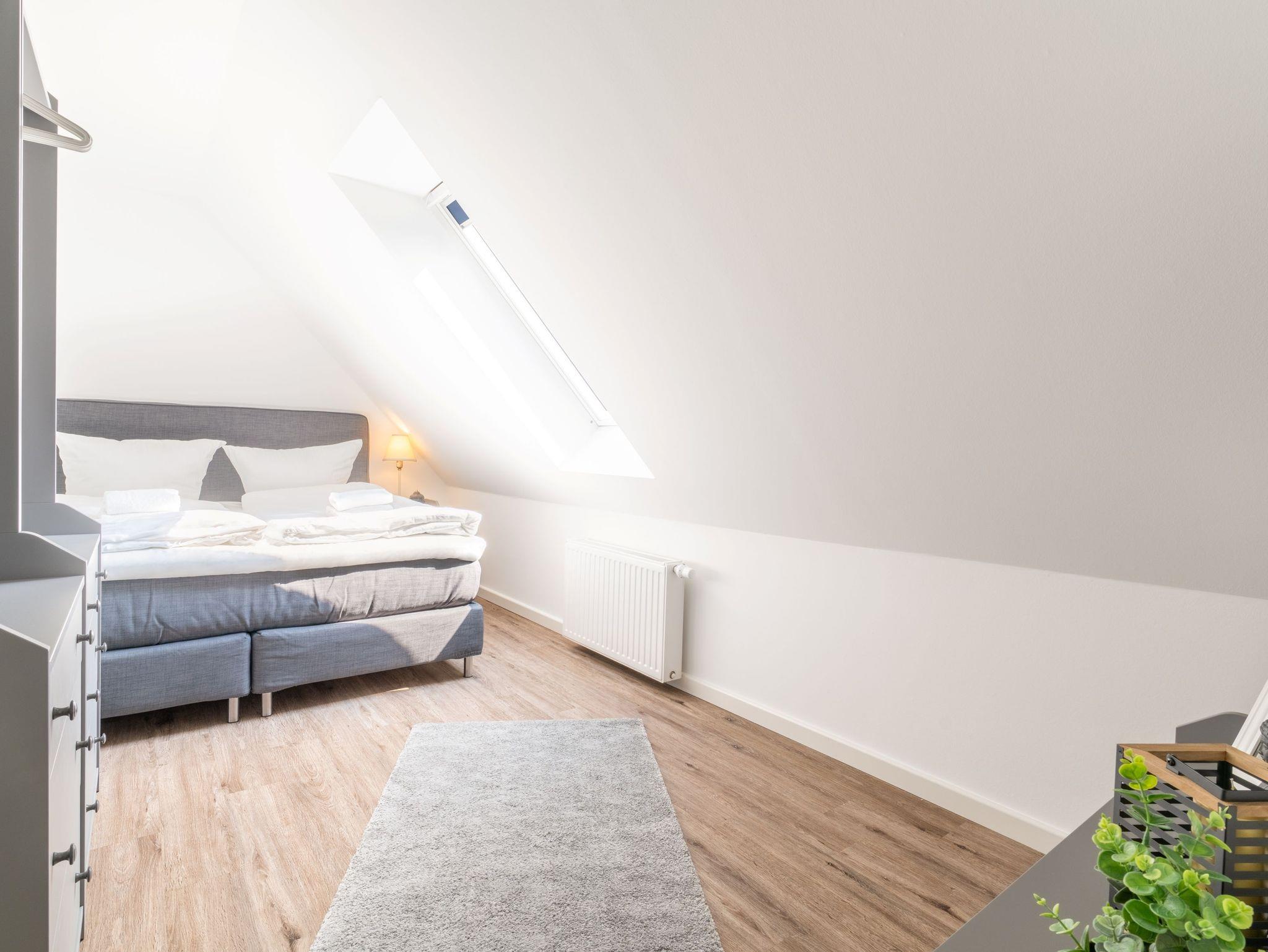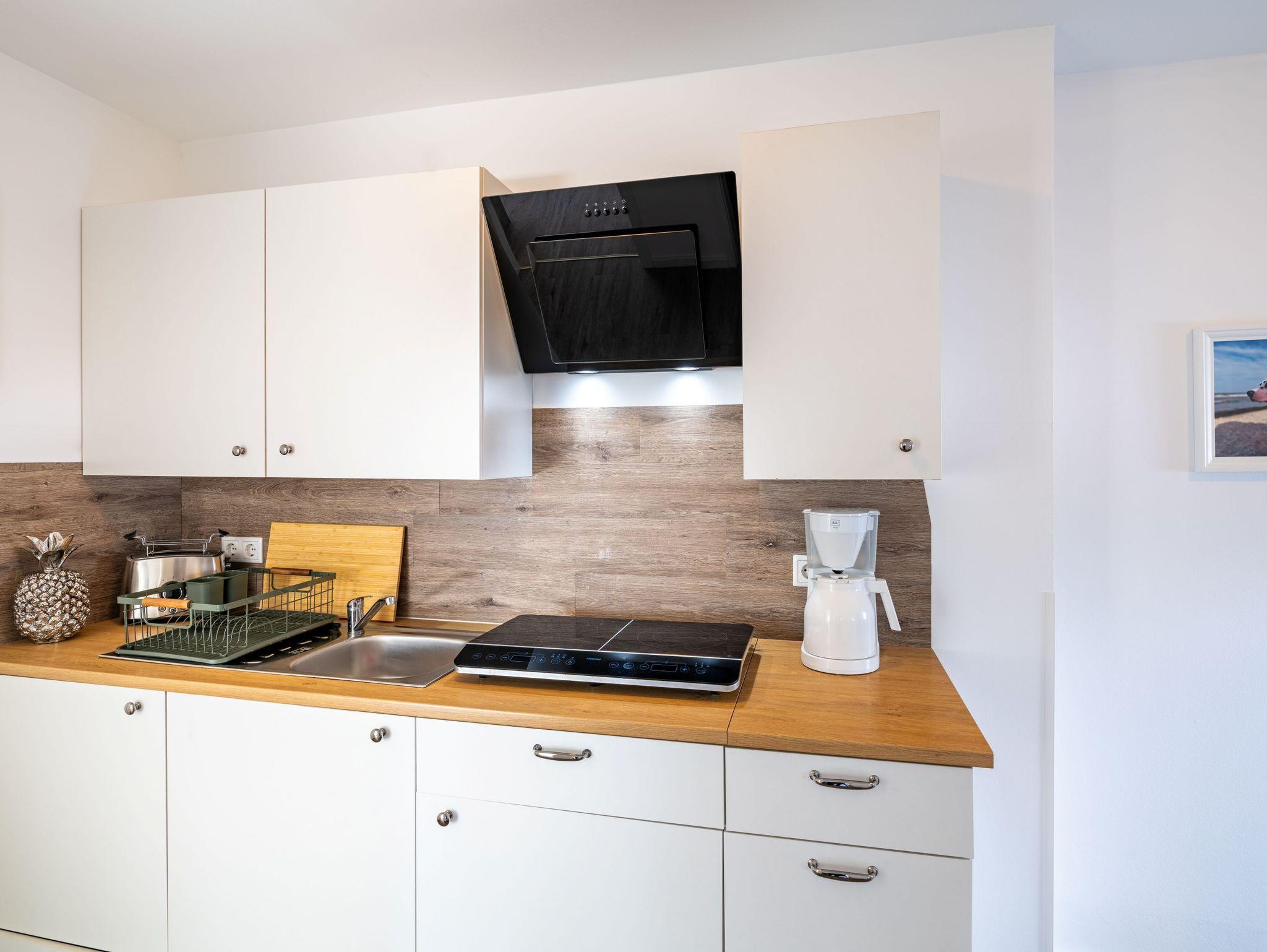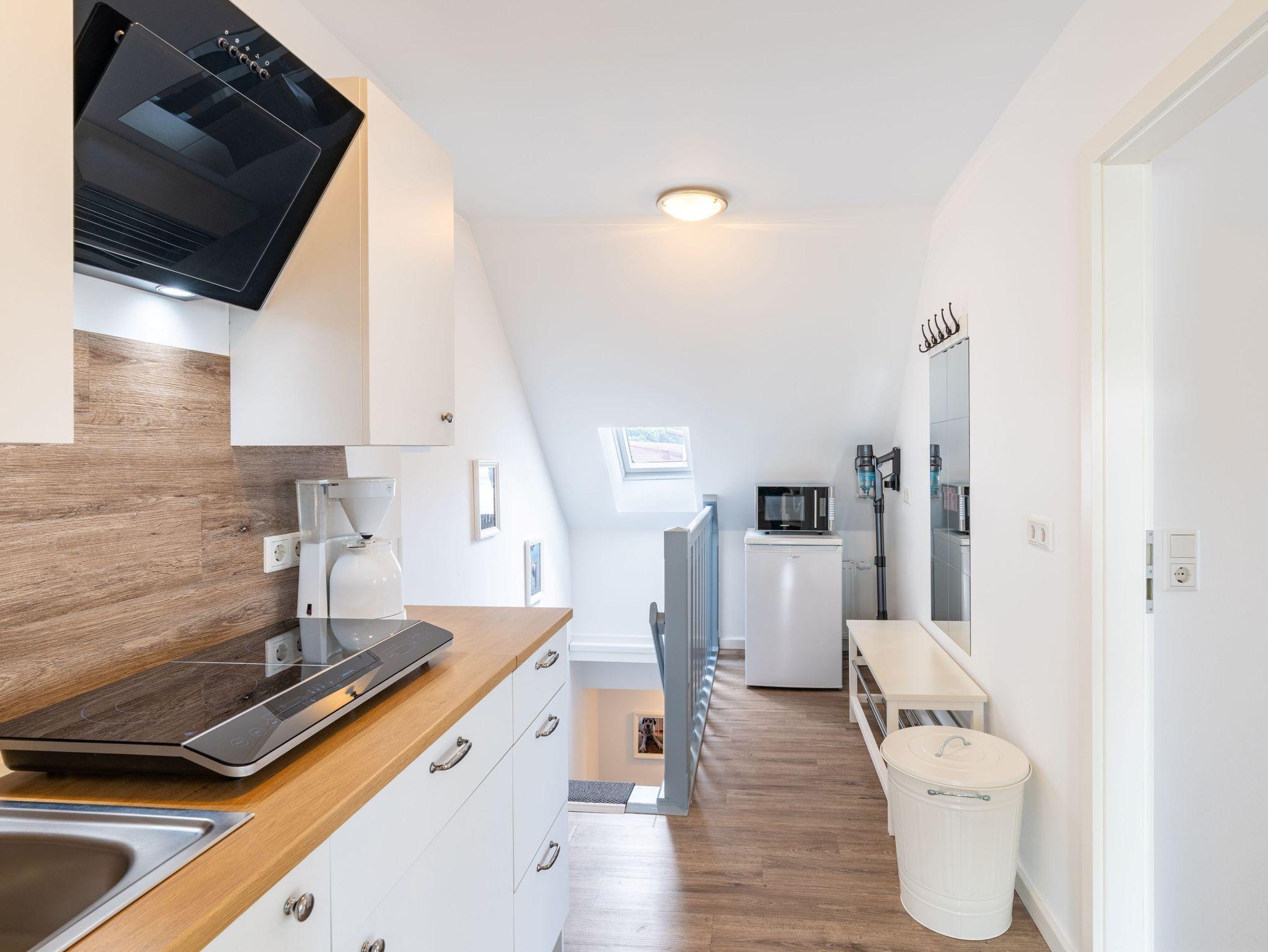 Die ca 55 qm große Ferienwohnung befindet sich im ersten Obergeschoss und ist modern eingerichtet. Sie verfügt über ein Wohnzimmer mit Sofa (Schlafmöglichkeit für eine Person), ein Schlafzimmer mit Doppelbett und TV, ein Bad mit Dusche/WC. Die kleine Küchenzeile ist mit einem zwei-Plattenherd, Mikrowelle, Kühlschrank, Kaffeemaschine, Toaster, Wasserkocher etc. ausgestattet. Eine Sitzgelegenheit vor dem Eingang steht ebenfalls zur Verfügung.