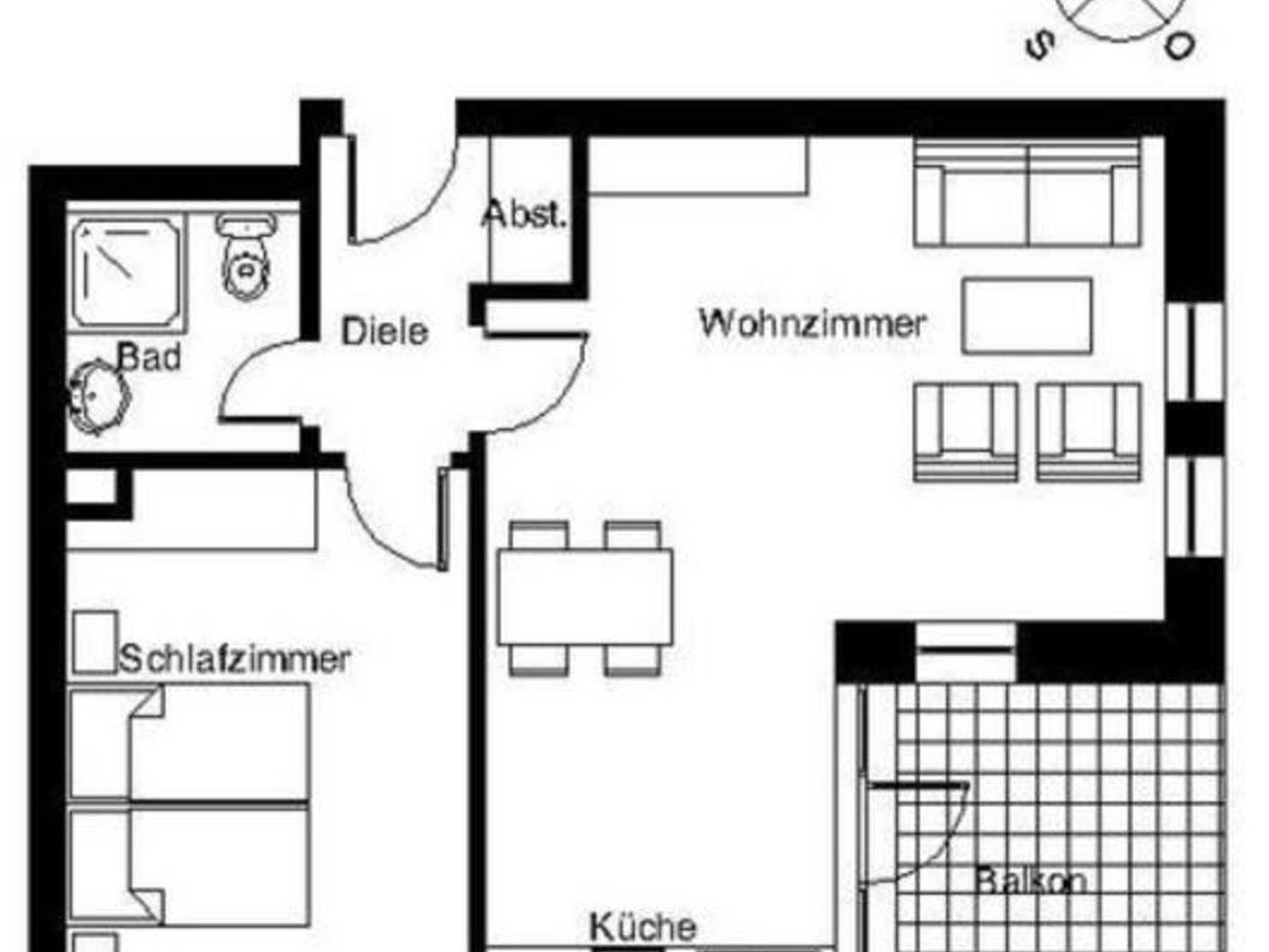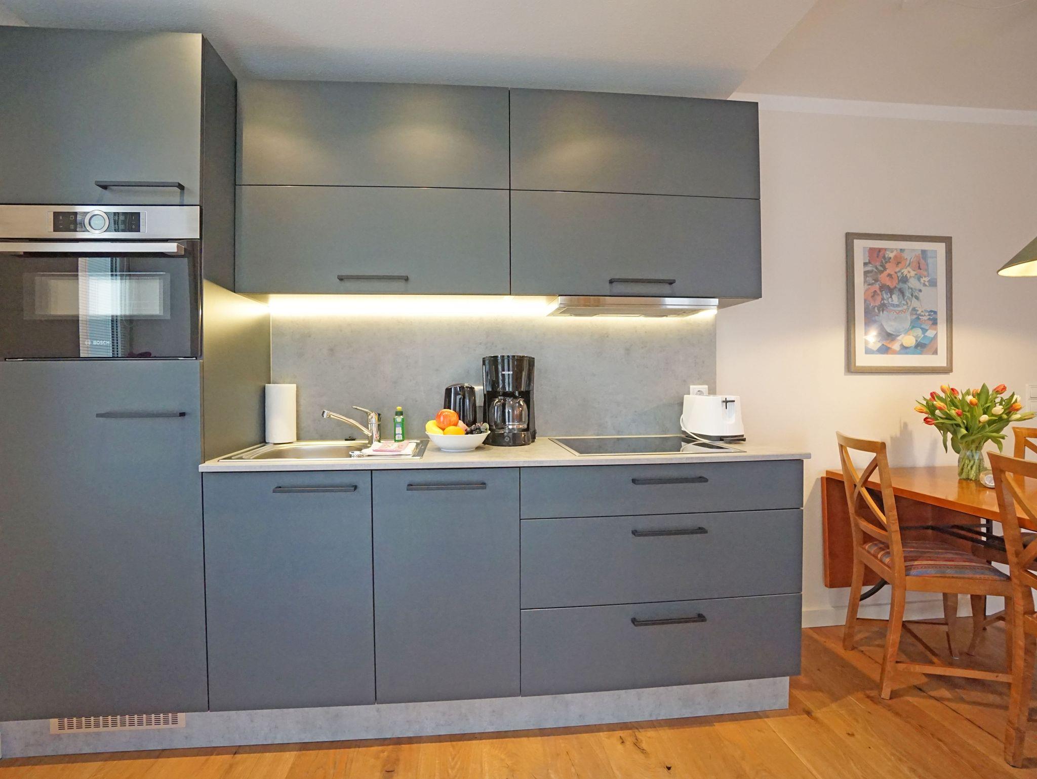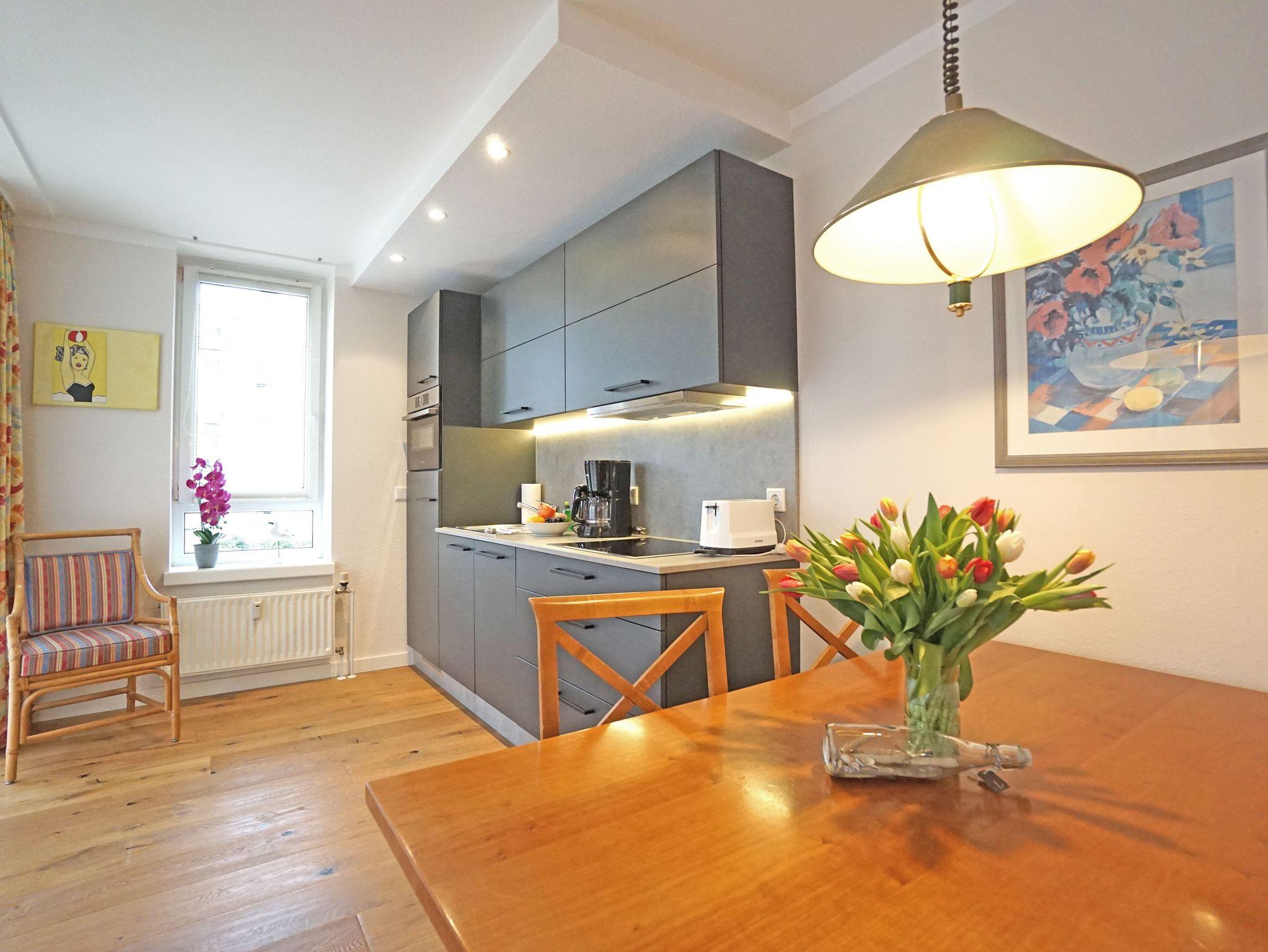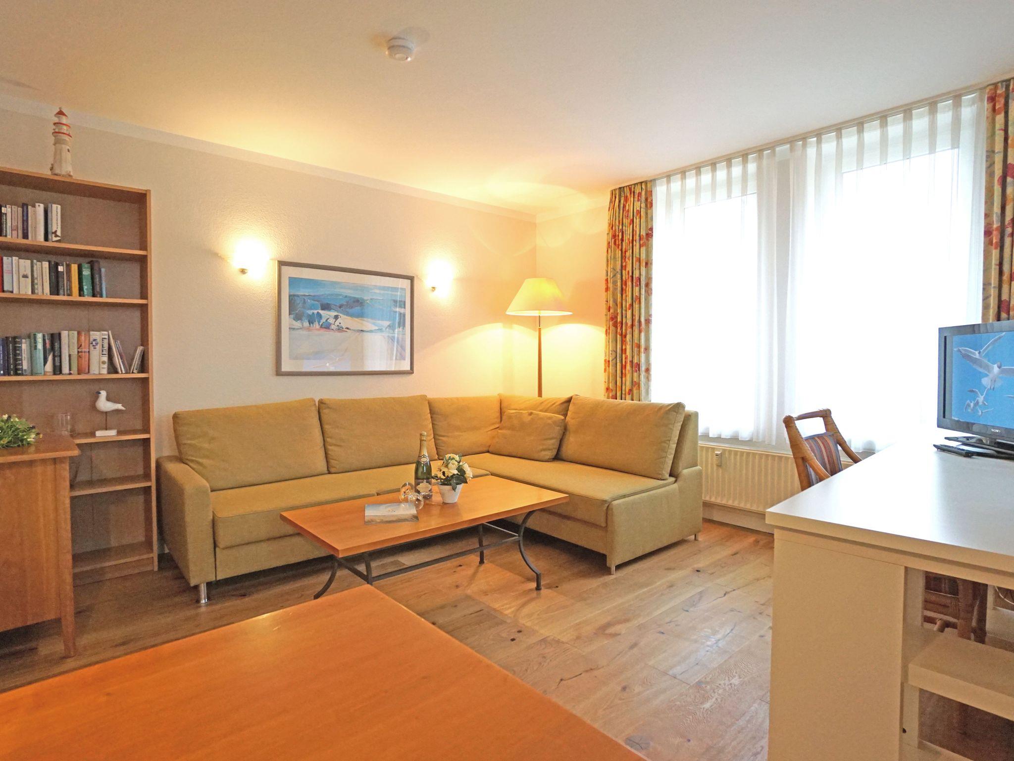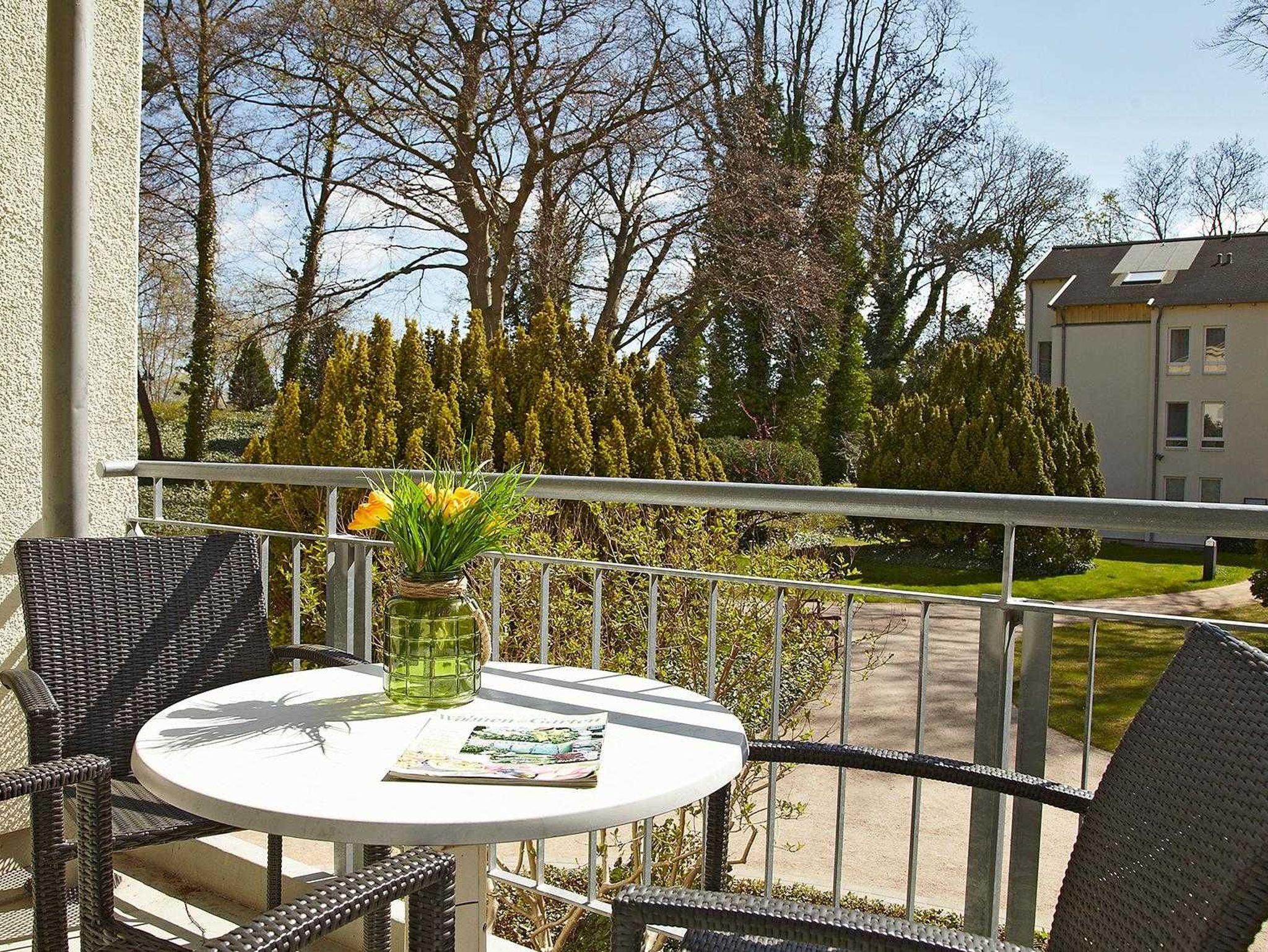 Freundliche,sehr helle Zweizimmer Ferienwohnung (45qm) für 2 - 4 Personen mit Balkon, direkt an der Promenade in gepflegtem Park mit altem Baumbestand gelegen. Die Wohnung hat neben dem Wohn- und Essbereich eine offene Küche mit Mikrowelle, Herd und Backofen. Das Schlafzimmer verfügt über ein Doppelbett, die Doppelschlafcouch im Wohnbereich ist für die 3. und 4. Person.