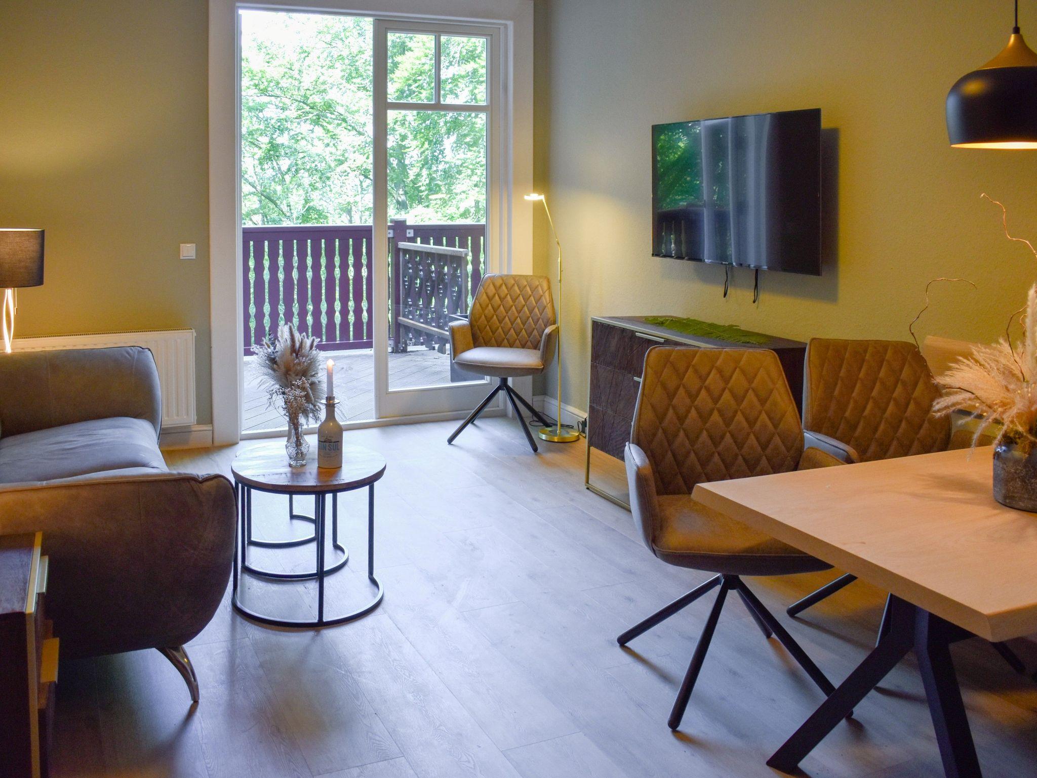 Eine Obergeschoss Wohnung (Größe folgt) mit 2 Schlafzimmern für 4 Personen; Ein Schlafzimmer mit einer Bettengröße von 160er (Blick Lindemannstraße/Hauptstaße/Wald); Ein Schlafzimmer mit einer Bettengröße von 180er mit einem Balkon (Blick in den Wald); Bad mit Dusche, WC und 2 Waschbecken; Küche auf dem Flur; Wohnzimmer mit 1 Sofa, 2 Sessel, Esstisch, 4 Stühlen und Balkon; Der Balkon kann von Schlafzimmer sowie Wohnzimmer betreten werden