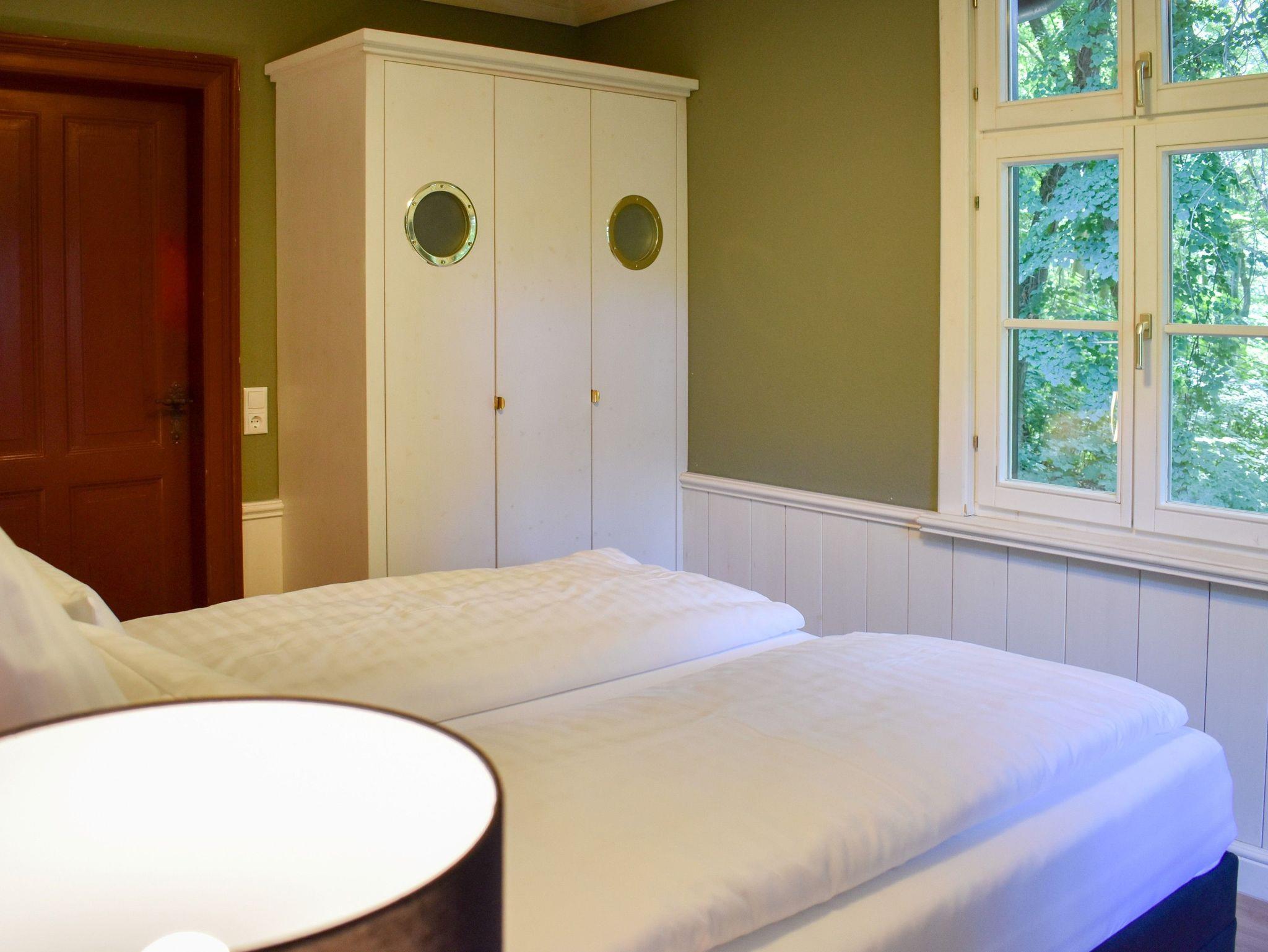 Eine Erdgeschoss Wohnung 37m² mit 2 Schlafzimmern für 4 Personen; Ein Schlafzimmer mit einer Bettengröße von 160er (Blick Hauptstaße/Lindemannstraße/Wald); Ein Schlafzimmer mit einer Bettengröße von 180er (Blick in den Wald); Bad mit Dusche, WC und 2 Waschbecken; Küche auf dem Flur