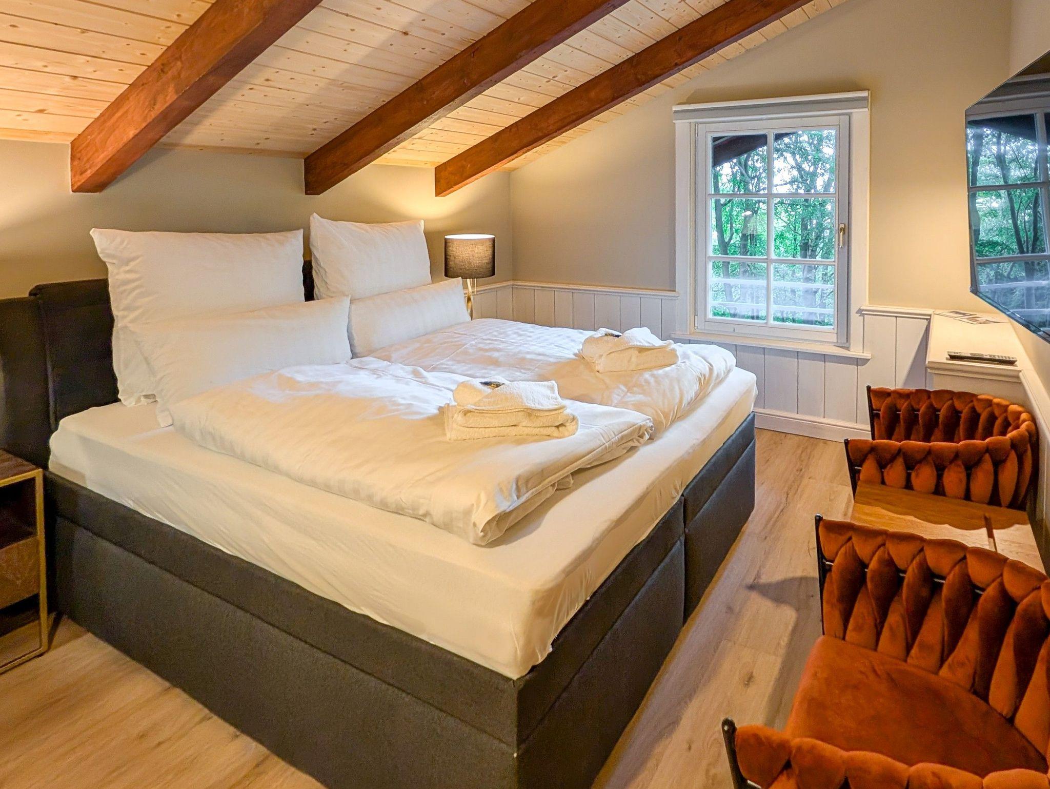 Eine Dachgeschoss Wohnung mit 1 Schlafzimmer für 2 Personen; Ein Schlafzimmer mit einer Bettengröße von 160er (Blick Hauptstraße/Wald); Bad mit Badewanne, WC und Waschbecken