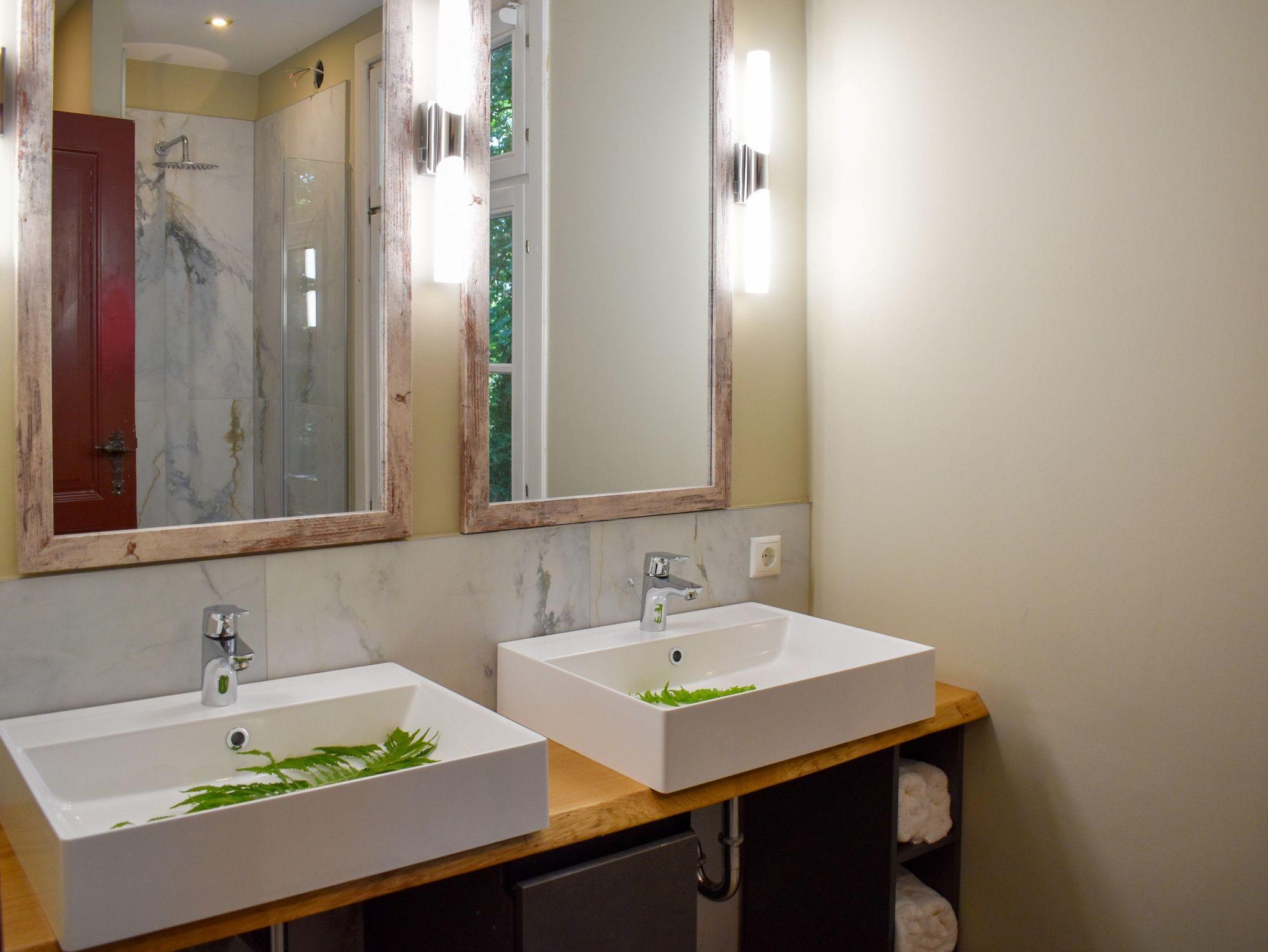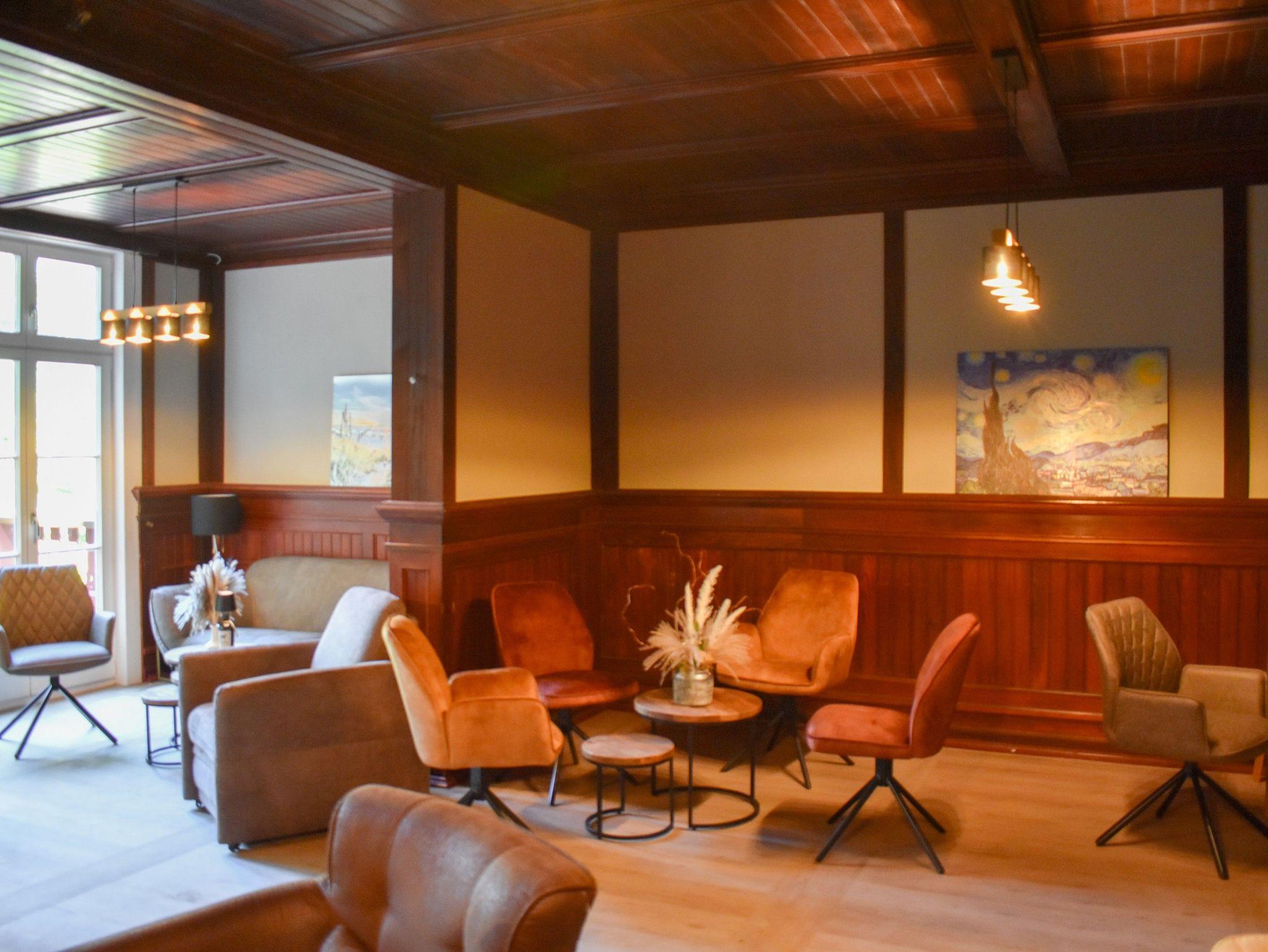 Kleine Wohnung 18 m² mit 1 Schlafzimmer für 2 Personen (Blick Kavaliersweg/Wald); Bad mit Dusche; Großer Essbereich 50 m² mit Tisch für 14 Personen, Tisch für 6 Personen, Bar mit 5 Barhockern, 7 Sesseln; Terrasse mit 2 Tischen für je 6 Personen; Küche 12 m² mit Herd, Spüle, Geschirrspüler, Kühlschrank, Anrichte