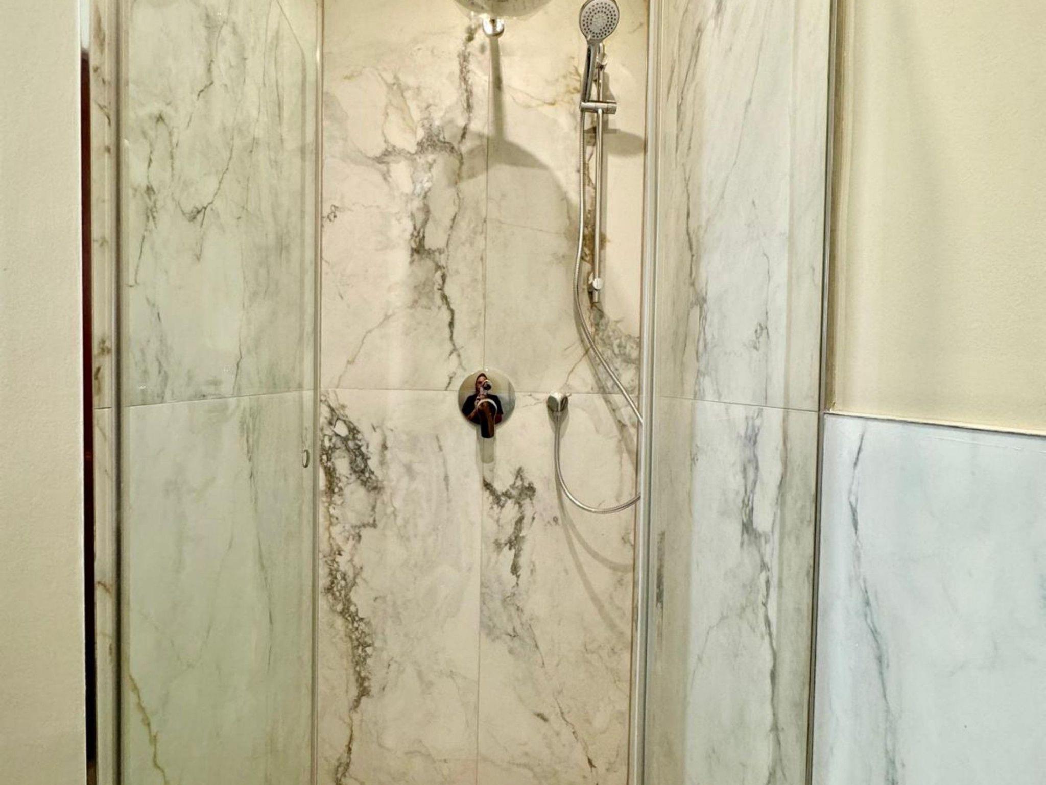 Eine Erdgeschoss Wohnung 37m² mit 2 Schlafzimmern für 4 Personen; Ein Schlafzimmer mit einer Bettengröße von 160er mit einem begehbaren Kleiderschrank (Blick Hauptstaße/Wald); Ein Schlafzimmer mit einer Bettengröße von 180er (Blick in den Wald); Bad mit Dusche, WC und 2 Waschbecken; Küche auf dem Flur