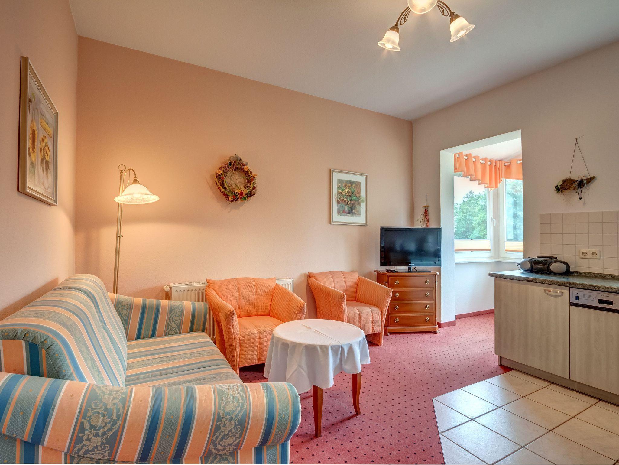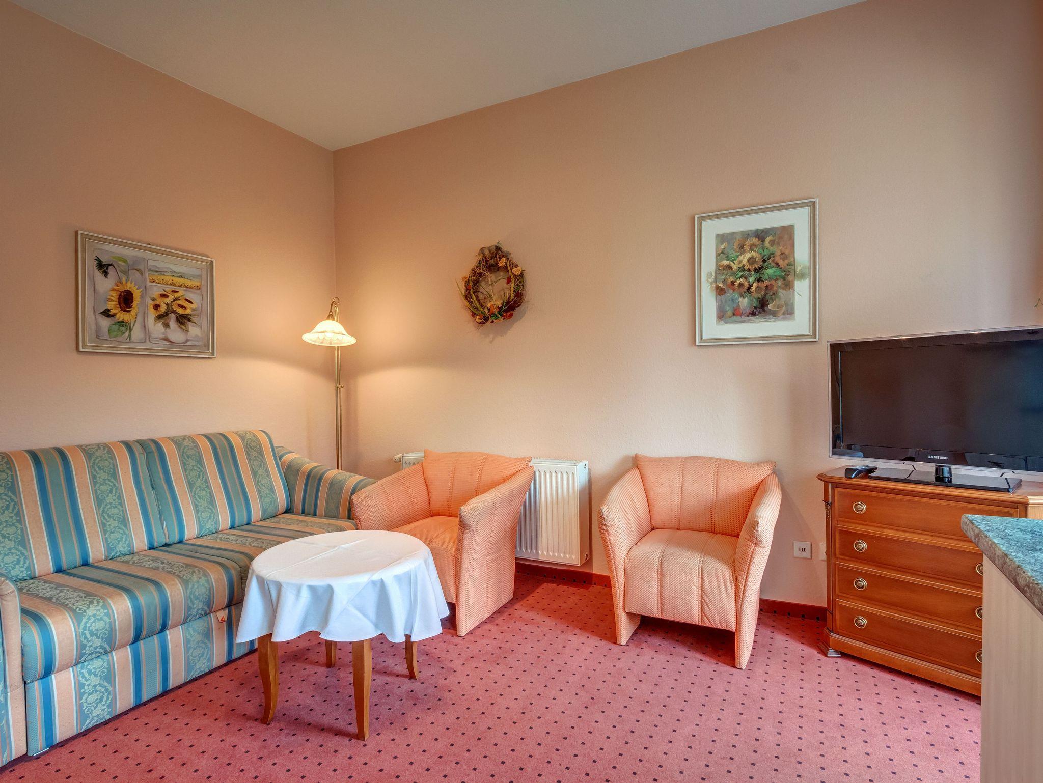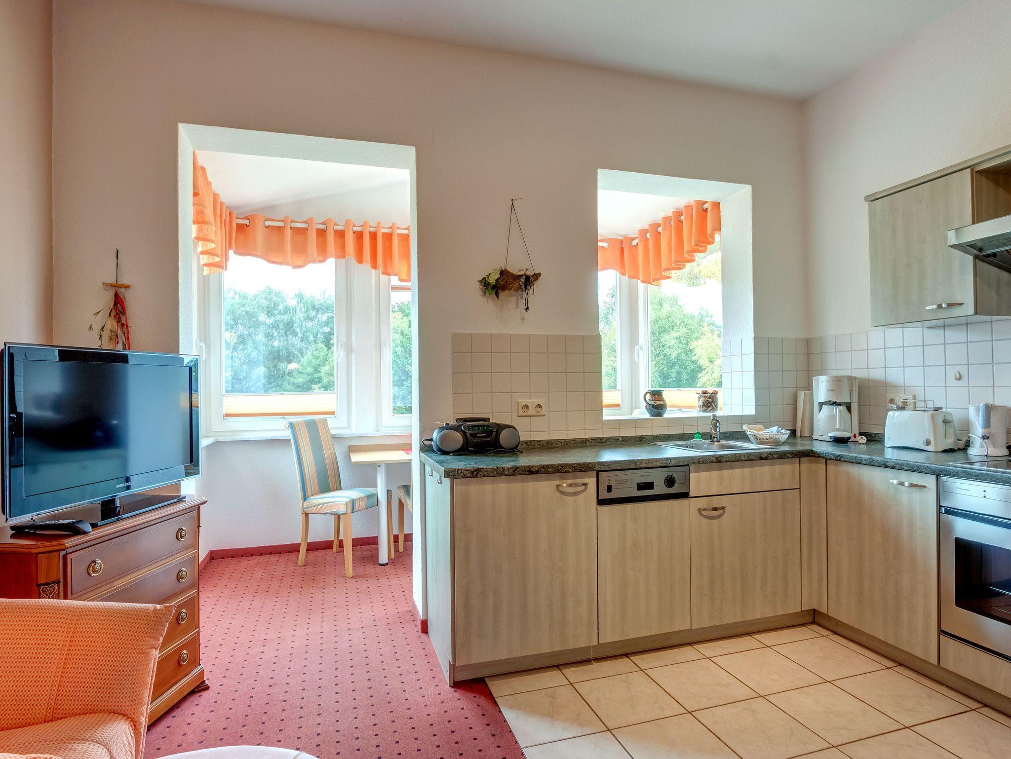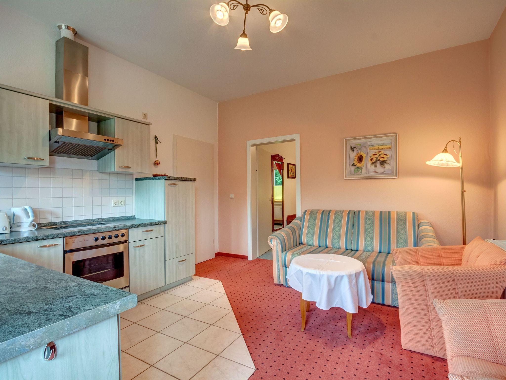 Geräumige 2-Raumwohnung mit separaten Schlafzimmer, Wohnraum mit offener Küche und verglaster Veranda. Ein Schlafsofa bietet die Möglichkeit zur Aufbettung für eine weitere Person. Das Badezimmer mit Fenster, Dusche und WC bietet genügend Platz für alle.