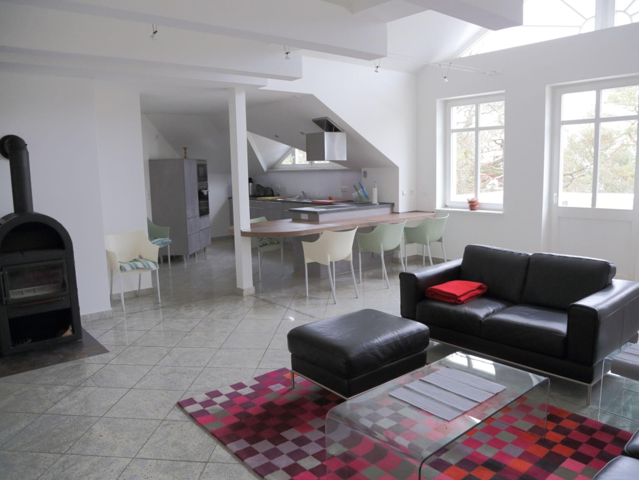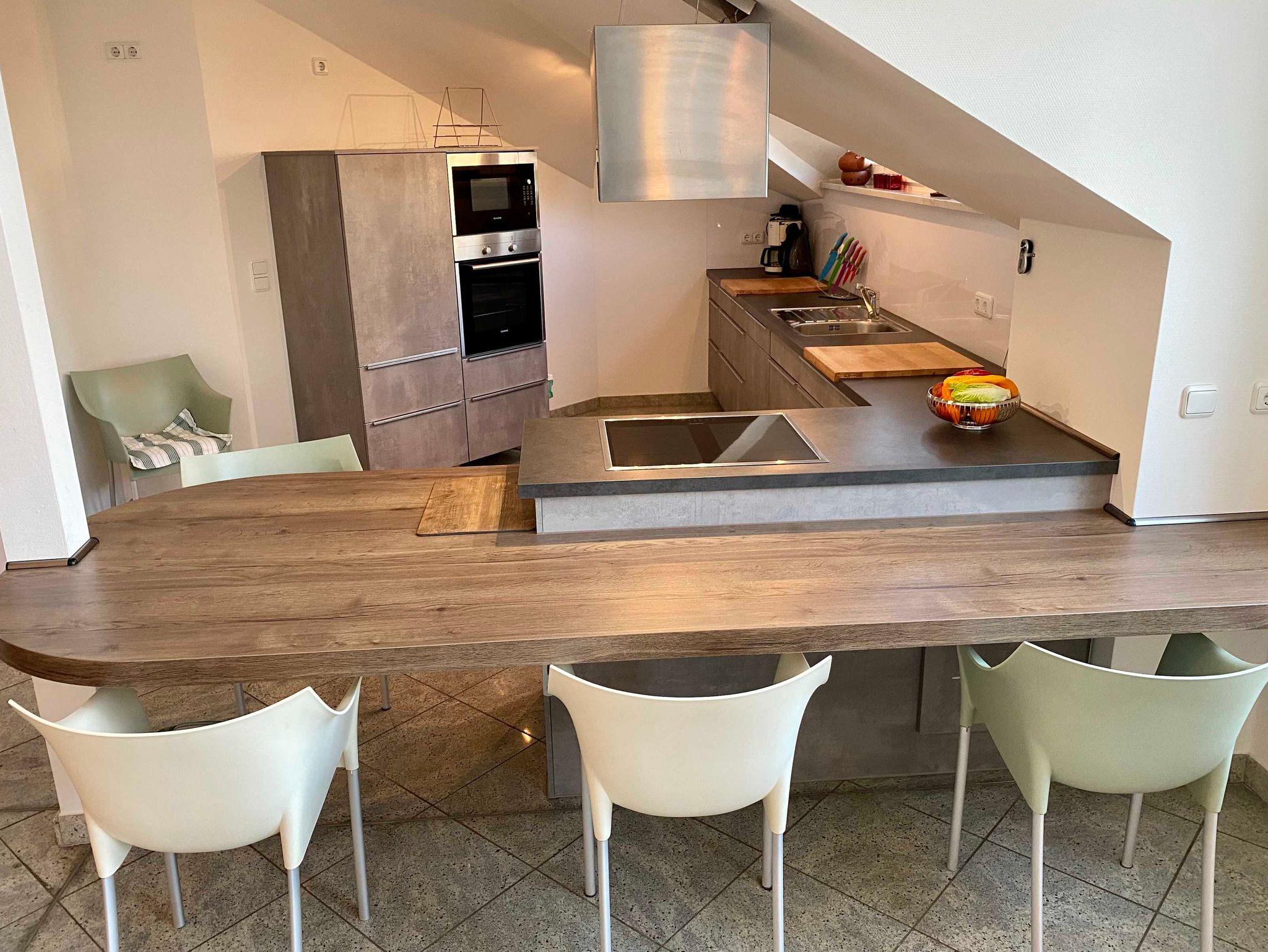 Dreiraumwohnung mit Fußbodenheizung im 3. Obergeschoss mit großem, modern und komfortabel möblierten Wohnbereich. Zwei Ledercouchen und ein gemütlicher Relaxsessel bieten Platz für die ganze Familie. Ein Kaminofen schaftt Gemütlichkeit zu jeder Jahreszeit. Das Mediencenter verschwindet im Einbauschrank. Ausgebaute Dachschrägen vermittel ein Gefühl von Freiheit . Am Küchen- Thresen könne Groß und Klein gemeinsam sitzen. Die neue Küche lässt keine Wünsche offen ( Geschirrspüler, Mikrowelle, Backofen, Induktionsfeld ) und genügend Platz als Arbeitsfläche.