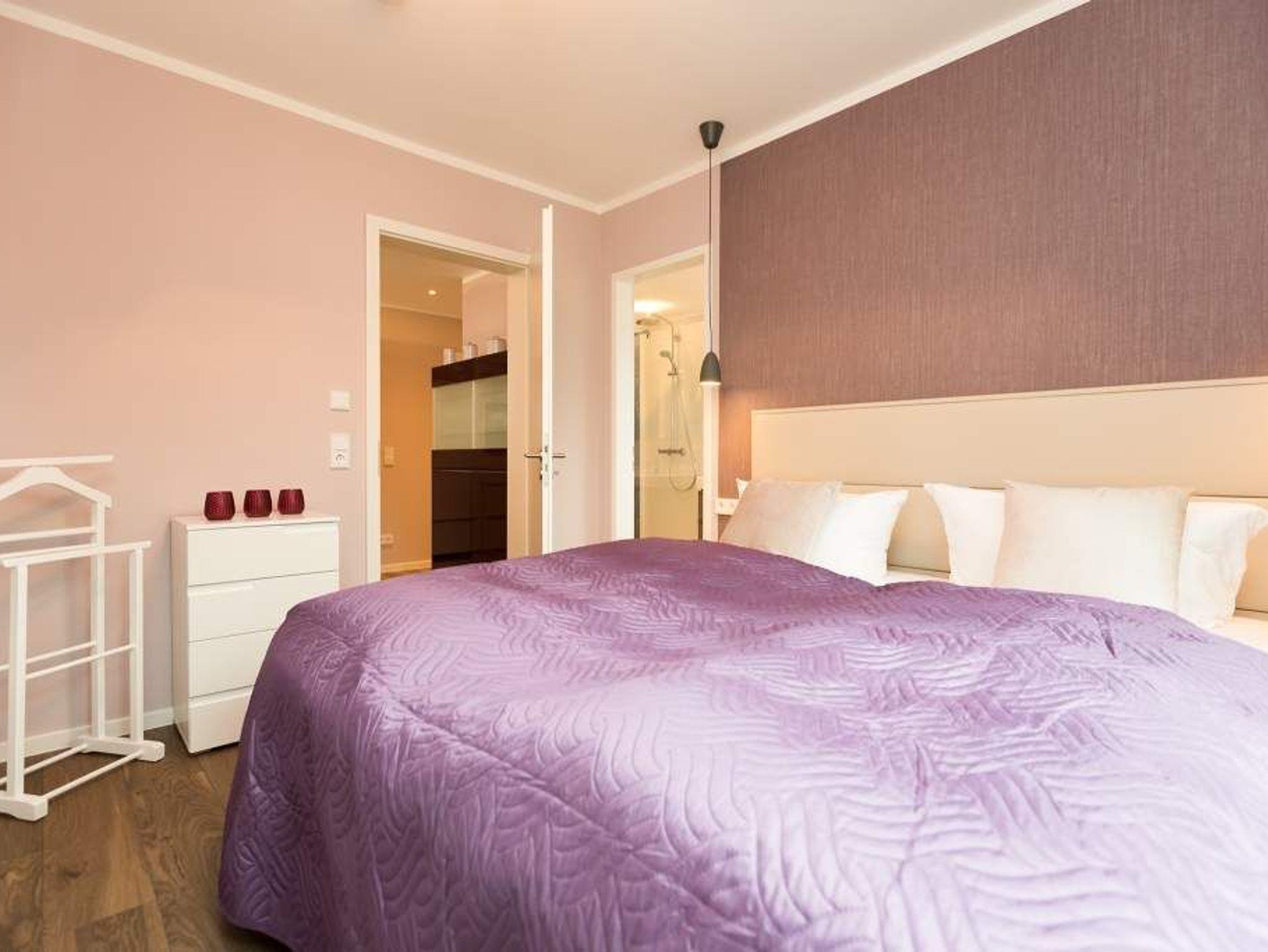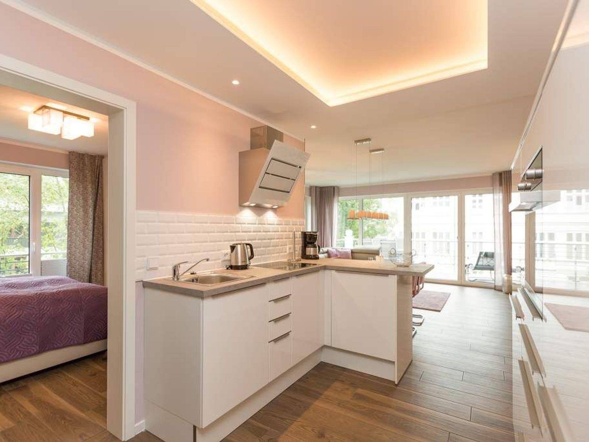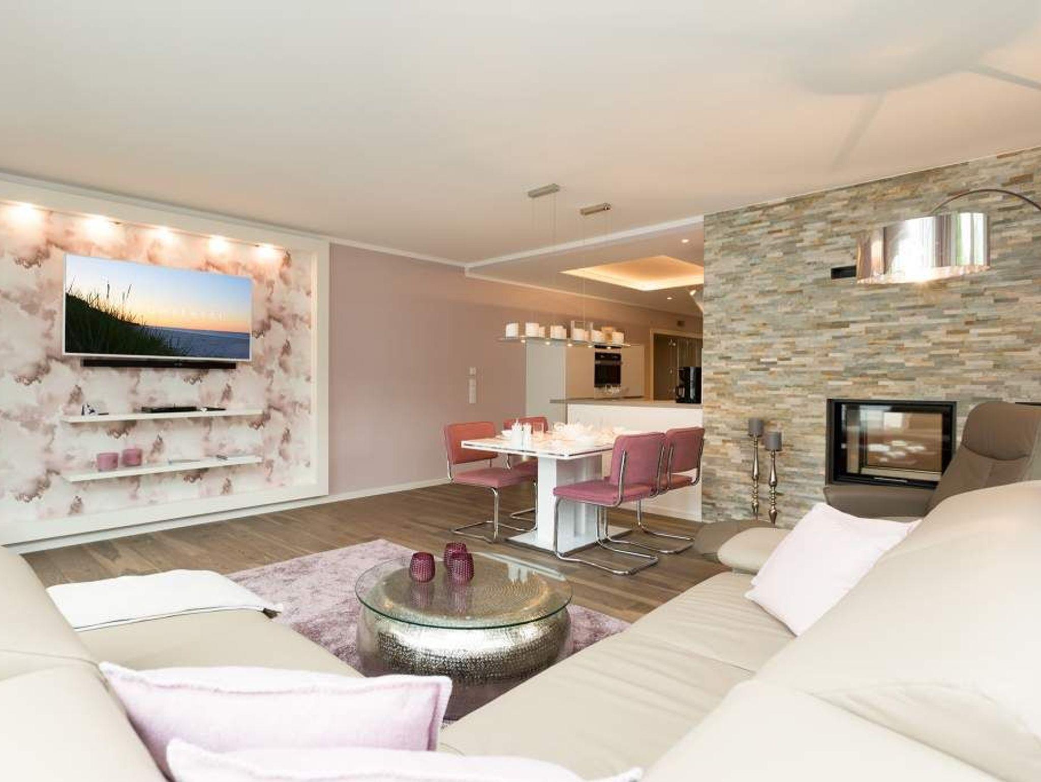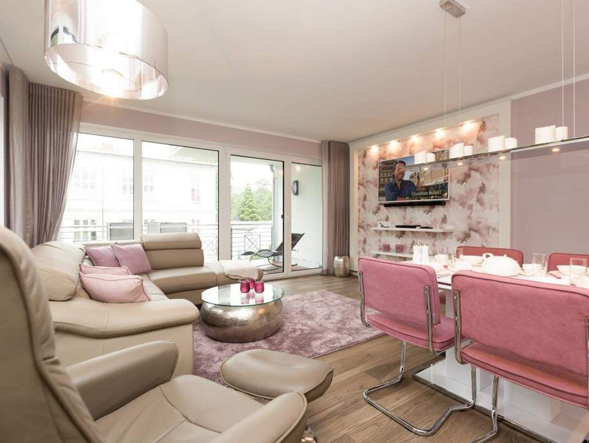 Der perfekte Urlaub beginnt mit dem perfekten Aufwachen in einer Wohnung, in der man sich rundum wohlfühlt. Eingekuschelt in die weißen Laken, noch einmal räkeln und ausstrecken in den herrlich bequemen Doppelboxspringbetten (1,80 m x 2,00 m) der beiden wunderbar lichtdurchfluteten Schlafzimmer ? schöner kann der Start in den Urlaubstag nicht sein. Die 87 Quadratmeter große Wohlfühlwelt der Wohnung Nummer 9 im zweiten Obergeschoss der Villa Strandgrün bietet in ihren drei Räumen Platz für vier Personen und ein Kleinkind im Kinderreisebett. Großzügig, hell und in zarten Rosé- und Violett-Tönen gehalten, strahlt das Appartement Eleganz und Leichtigkeit aus. Ob auf der komfortablen Sofalandschaft, dem gemütlichen Lesesessel oder am stylischen Designer-Esstisch ? hier kann man es sich gut gehen lassen. Ein absolut außergewöhnliches Highlight ist der Kaminofen, dessen romantisches Flackern sowohl vom Wohnzimmer als auch von einem der beiden Schlafzimmer aus genossen werden kann. Flat-TVs gibt es in jedem der drei Zimmer. Vom Wohnzimmer aus geht es auf den großen Südbalkon mit Gartenmöbeln, Sonnenliege und Blick auf den begrünten Garten und die umliegenden Bädervillen. Die offene Küche mit Metrofliesen ist mit hochwertigen Geräten und Design-Geschirr ausgestattet. Jedes Schlafzimmer verfügt über Einbauschränke und ein eigenes Bad mit Dusche, Waschtisch und WC. Natürlich können die Schlafzimmer verdunkelt werden. Eine geräumige Panorama-Sauna auf dem Flur lädt zum wohligen Abschalten an kühlen Tagen und Abenden ein. Ein kleiner Hauswirtschaftsraum bietet Stauraum. Damit Sie sich so richtig entspannen können, sind die Betten bezogen und Handtücher liegen für Sie bereit. In der Tiefgarage ist ein Stellplatz reserviert. Im wohnungseigenen Kellerraum ist Platz für maximal 2 Fahrräder.
