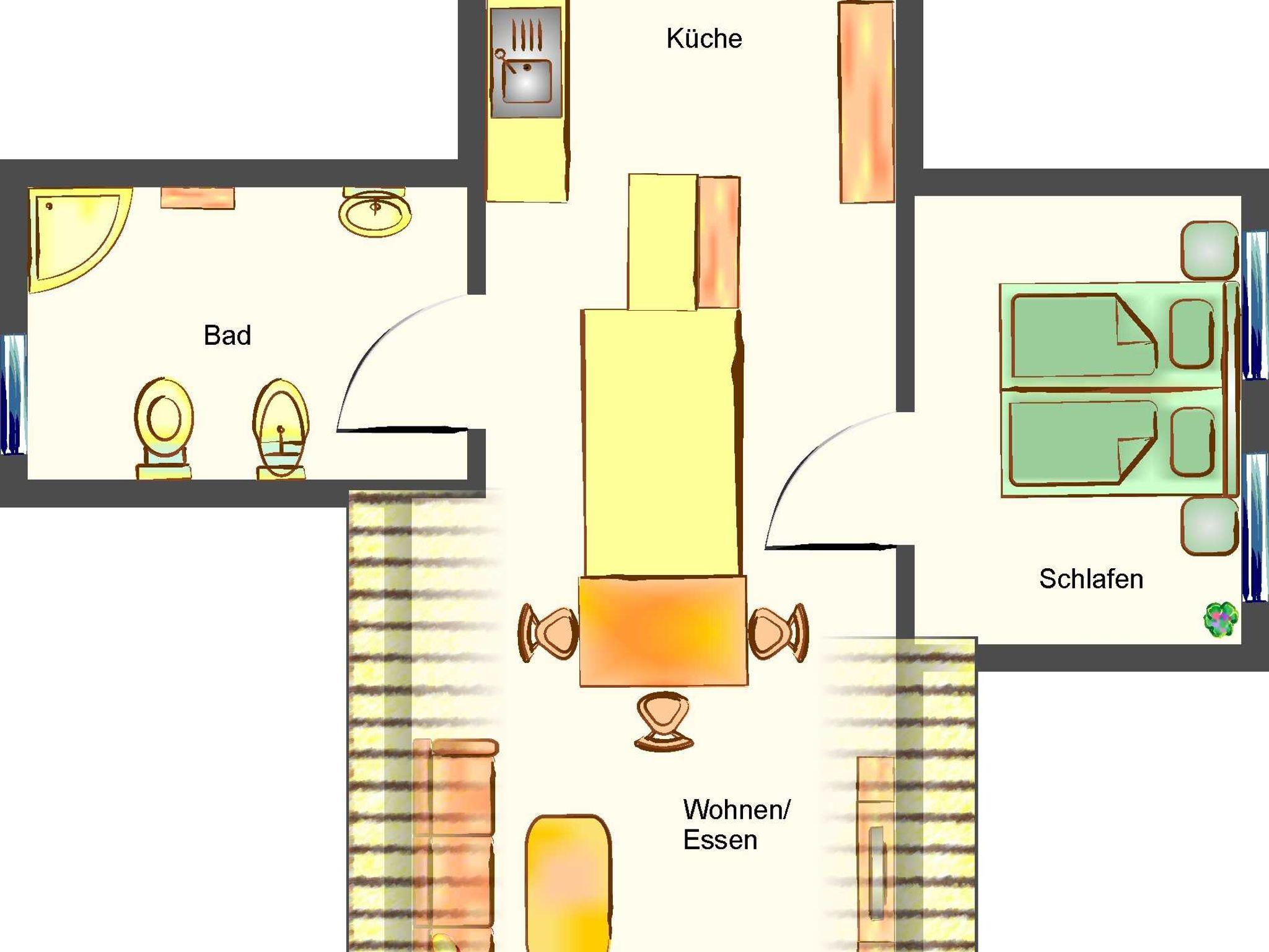 Im Dachgeschoss gelegen, unterteilt sich die Wohnung in ein Schlafzimmer mit einem großen Doppelbett, einen offenen Wohn-, Koch-, und Essbereich und ein Duschbad mit Handwaschbecken, Bidet und WC. Im Schlafzimmer finden Sie Komfort und Funktionalität im großzügigen Ehebett mit zwei Nachttischen und einem geräumigen Kleiderschrank mit Spiegeltüren.