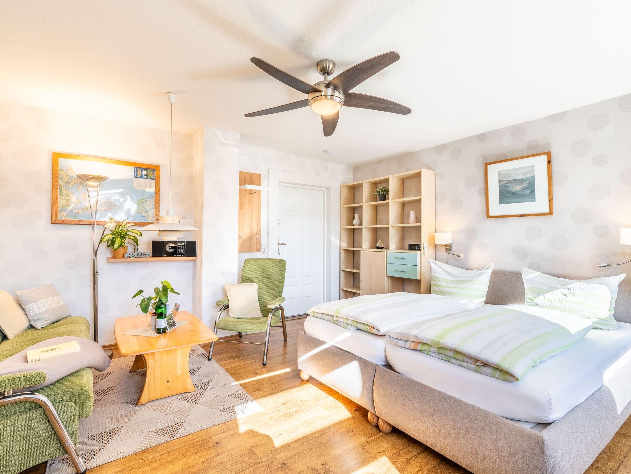 Das Ferienzimmer Nr. 5 im 1. Obergeschoss ist das ideale Urlaubsdomizil für verliebte Pärchen - oder auch für reisefreudige Singles. Der kombinierte Wohn- und Schlafbereich des 30 qm großen Ferienzimmers bietet Ihnen eine Relaxecke mit Couch, Polstersessel und Flat-TV sowie ein bequemes Doppelbett (180 x 200cm / zwei getrennte Matratzen) von dem Sie ebenfalls fernsehen können. Dank eines Ventilators haben Sie auch zur Sommerzeit eine angenehme Raumtemperatur.