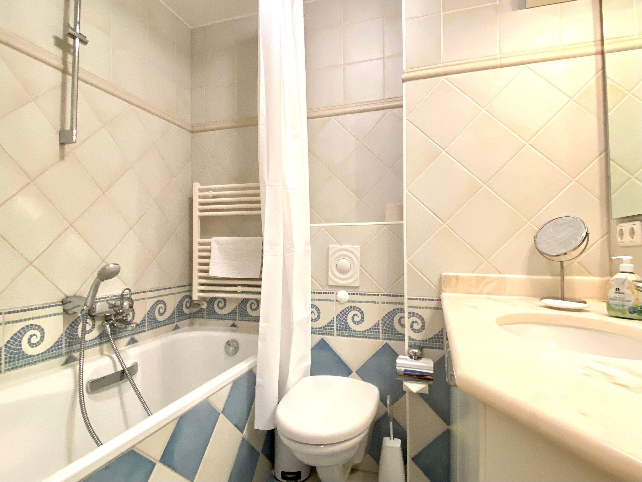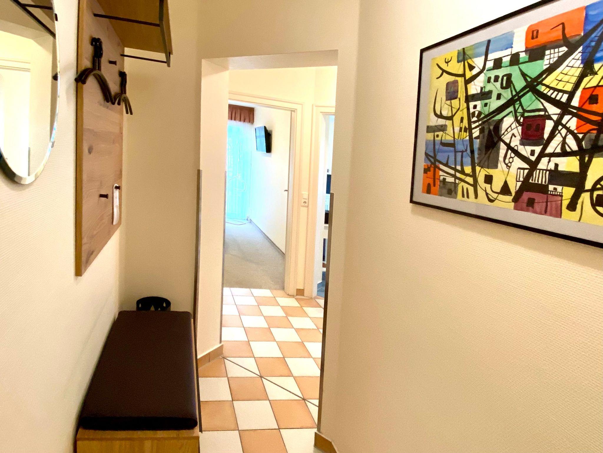 Zur Ferienwohnung gehört ein großer Balkon in Richtung Park der Residenz. Genießen Sie hier den Blick ins Grüne. Die Schlafzimmer sind mit Teppichboden ausgelegt und verfügen beide über Doppelbetten. Die Ferienwohnung 15 hat ein Badezimmer mit Badewanne. Internet und Sky (ausgewählte Programme) inklusive.