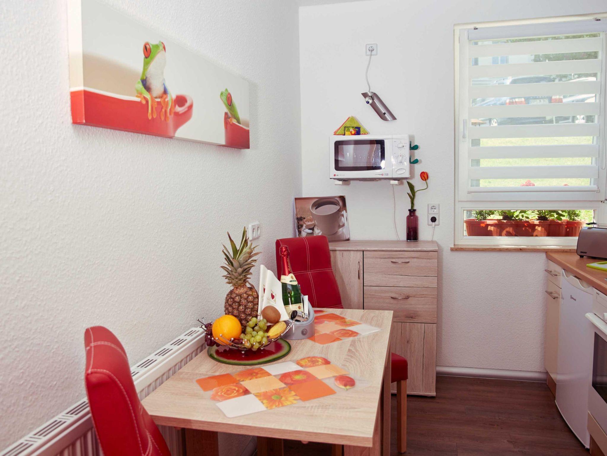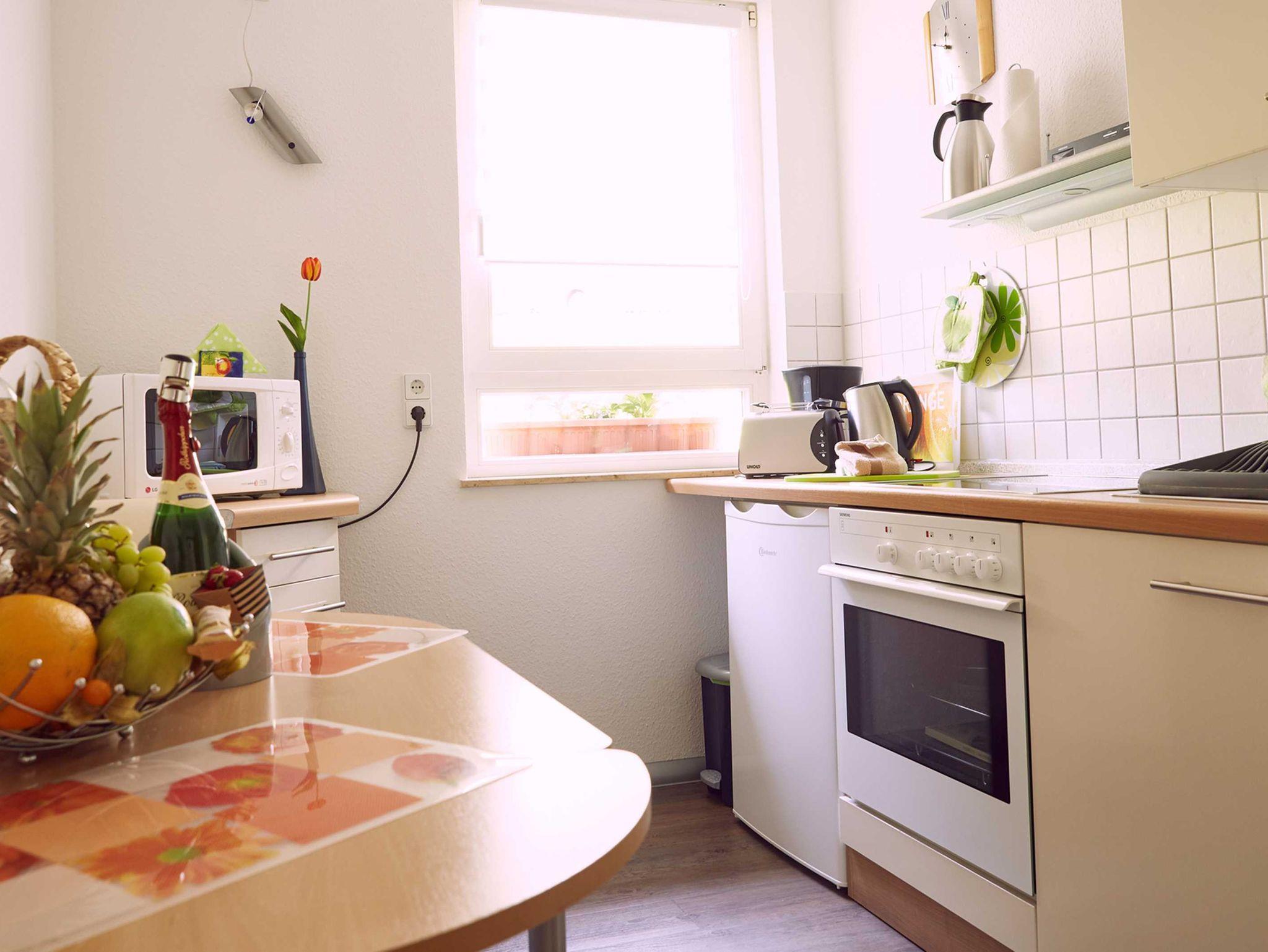Mit insgesamt 43qm bietet die Ferienwohnung neben einem Wohnzimmer mit Couch, Relax-Sessel und TV auch eine voll ausgestattete Küche mit Backofen, Spülmaschine, Mikrowelle, Herd sowie Essbereich. Ein geräumiges Schlafzimmer mit Doppelbett, Kleiderschrank und TV sowie ein Bad mit Dusche/WC runden den Komfort der Wohnung ab. Im Sommer haben Sie zudem die Möglichkeit auf der Terrasse zu grillen (Elektrogrill) und den Tag so entspannt ausklingen zu lassen. WLAN steht Ihnen ebenfalls in der gesamten Wohnung kostenfrei zur Verfügung.