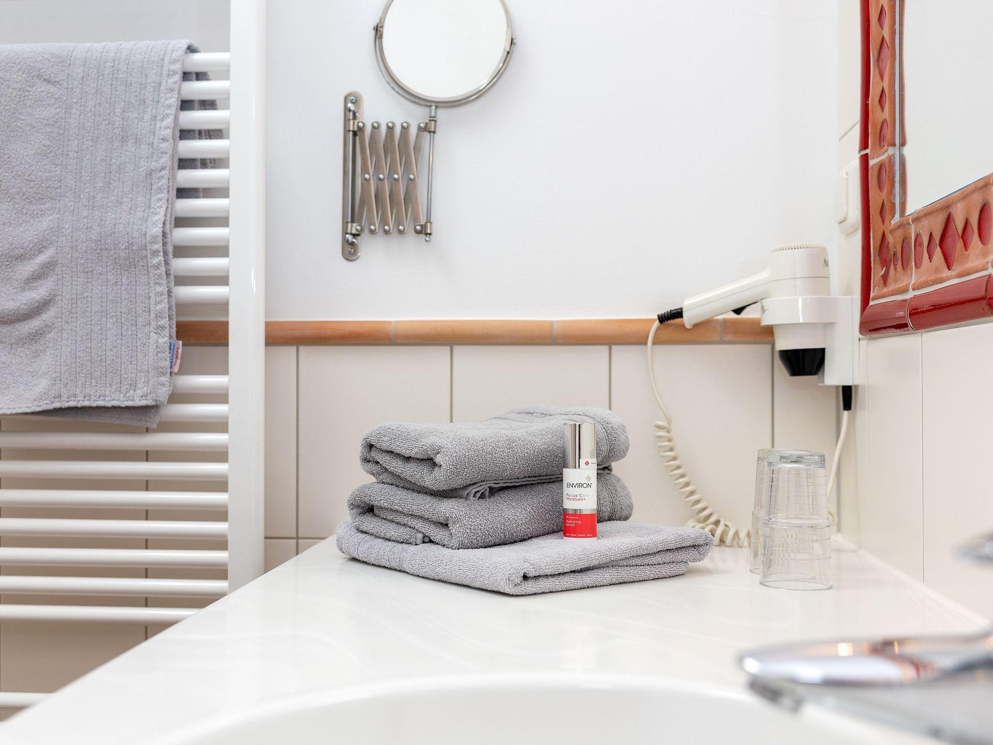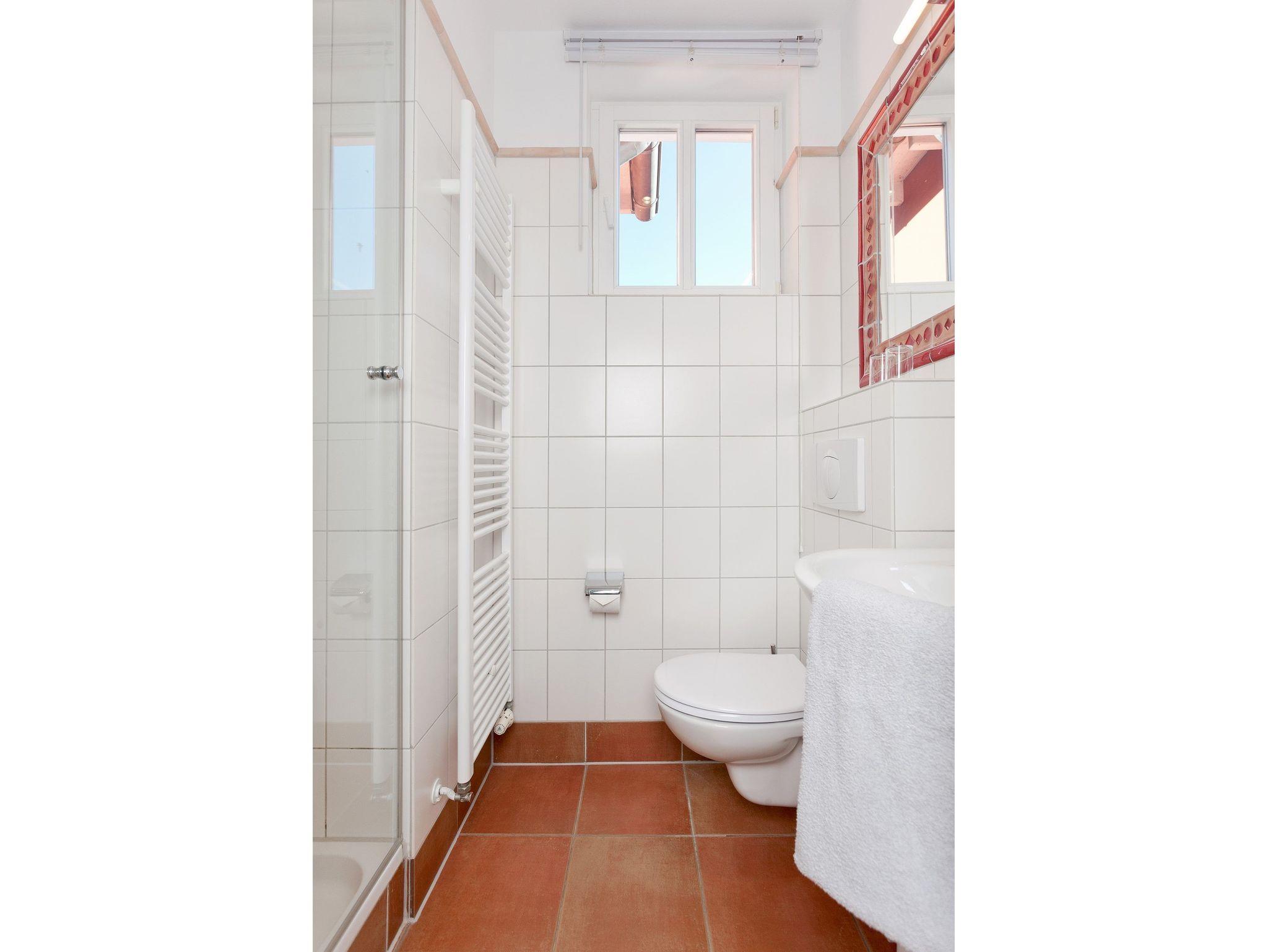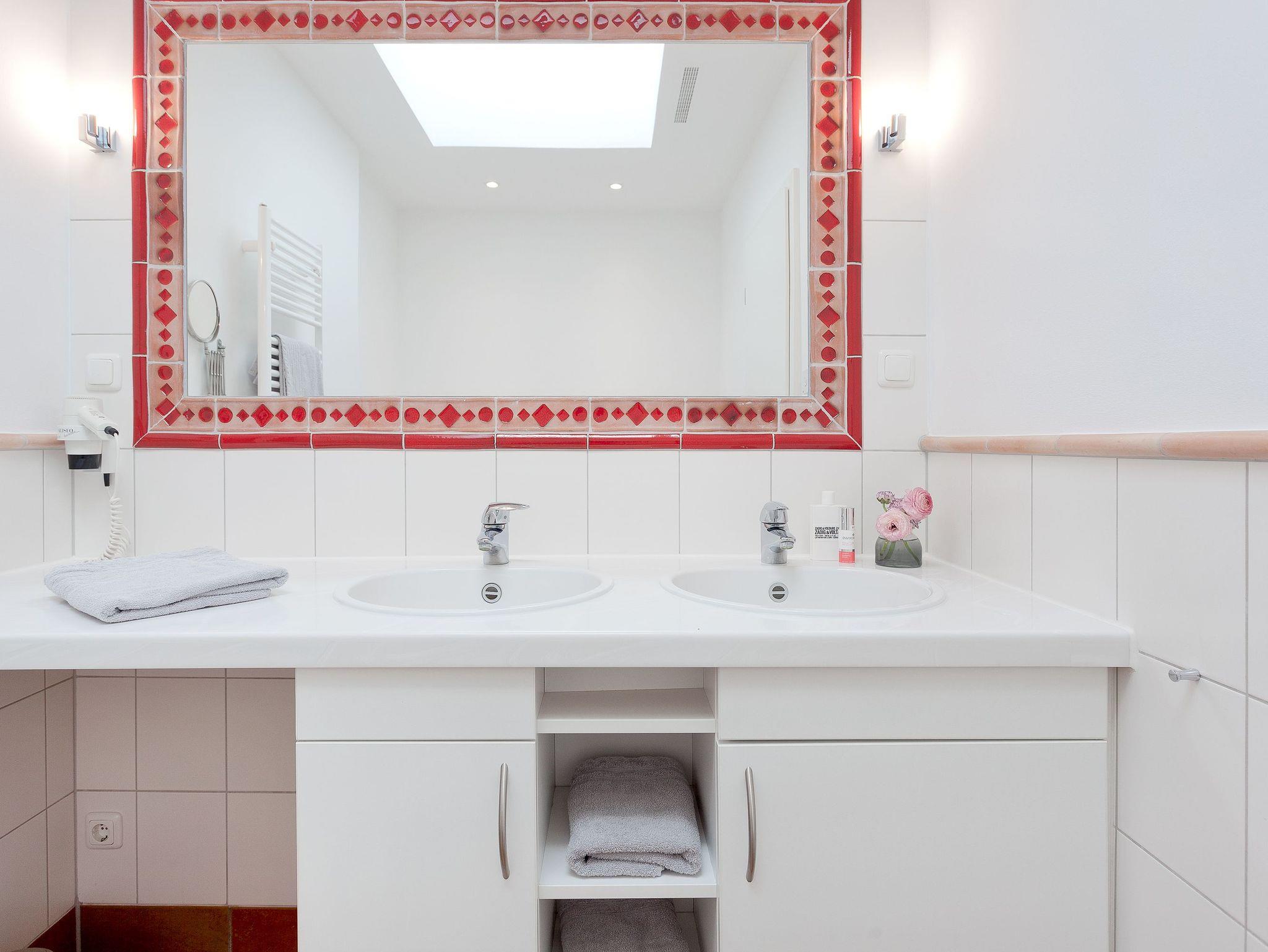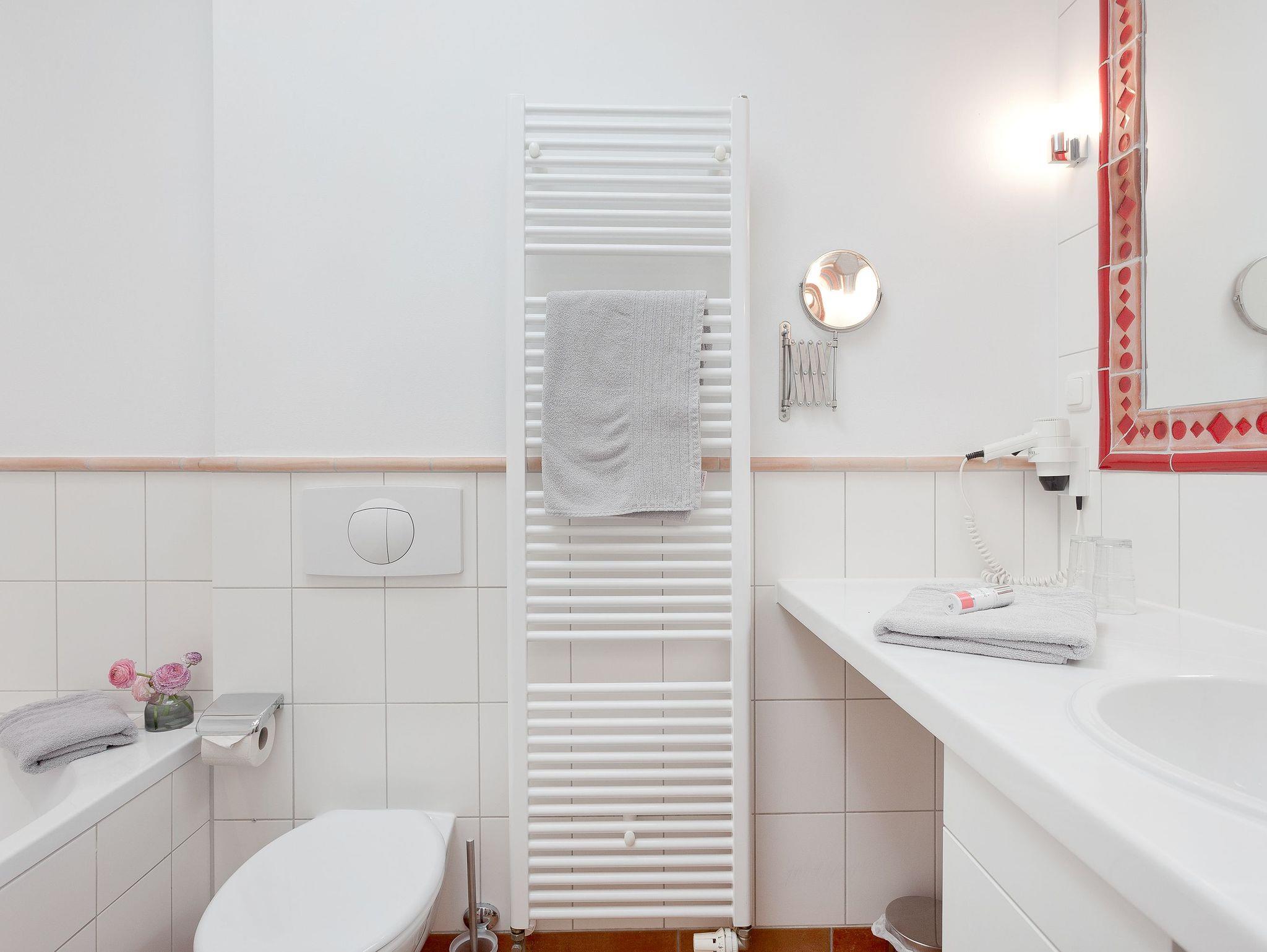 Zwei Tageslichtbäder sorgen für zusätzlichen Komfort. Badezimmer 1 ist mit Badewanne, WC, Waschtisch, Handtuchheizung, Haartrockner und einem Kosmetikspiegel ausgestattet, während Badezimmer 2 über eine Dusche, WC, Waschbecken, Handtuchheizung und einen Haartrockner verfügt.