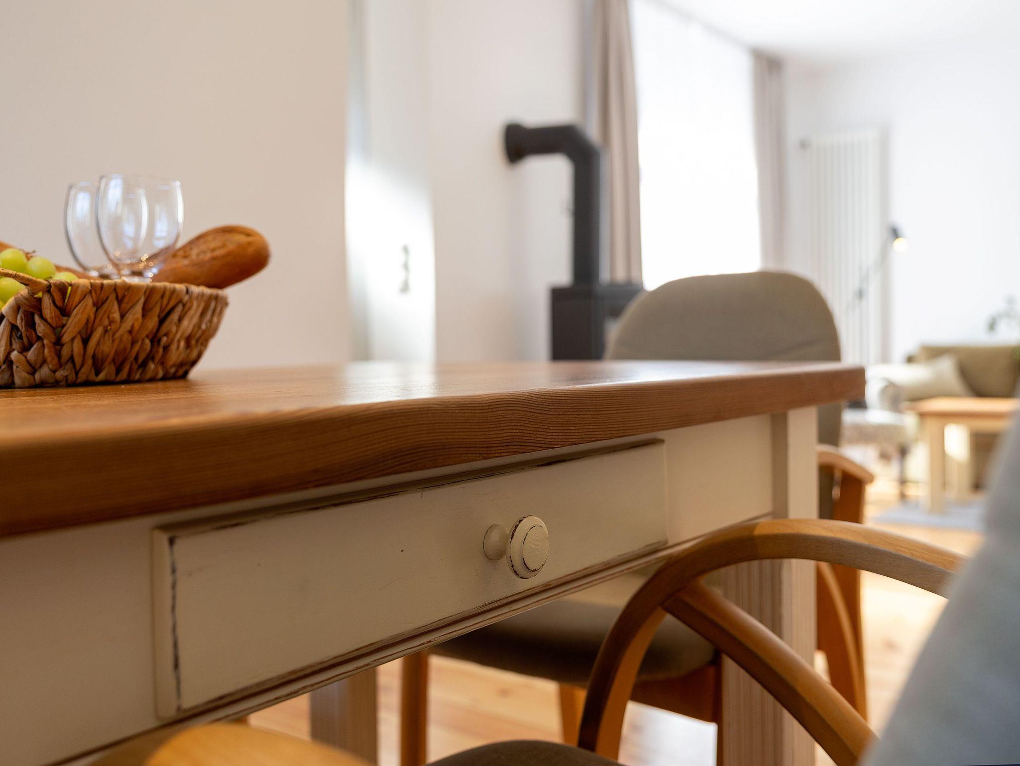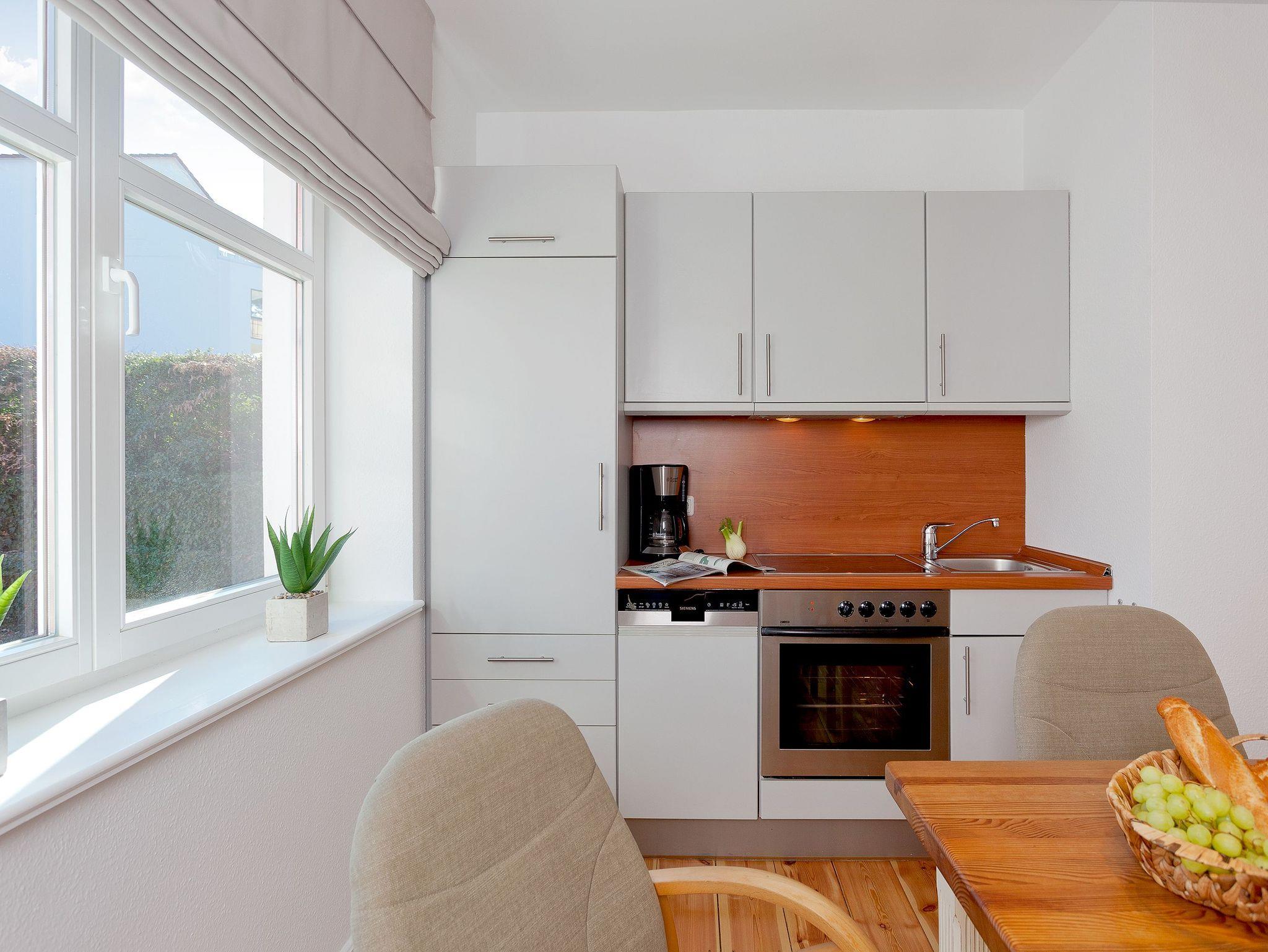 Unser Appartement 4 wurde im Winter 2024 - 25 in Teilen renoviert. Als ehemalige Einliegerwohnung mit separatem Eingang, den Sie über die Außentreppe neben der Garage erreichen, bietet das Appartement auf ca. 71 qm alles, was es für einen erholsamen Aufenthalt mit bis zu 4 Personen benötigt. Die integrierte Küchenzeile ist vollausgestattet mit Cerankochfeld, Kühlschrank mit Gefrierfach, Backofen, Geschirrspülmaschine, Kaffeemaschine, Wasserkocher und Toaster.