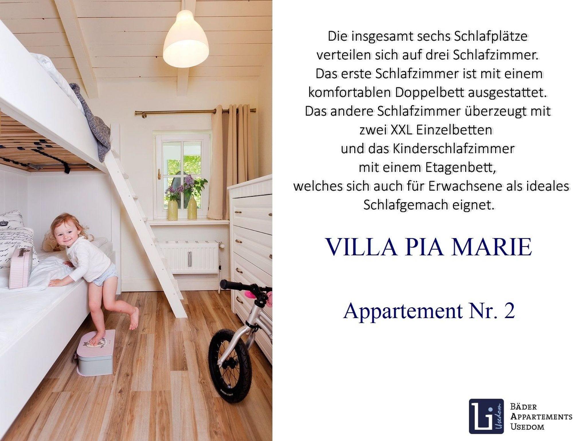 Herzlich Willkommen im Meerestraum Nr. 2 in unserer historischen Villa Pia Marie im schönen Kaiserbad Heringsdorf. Das 4-Raum-Appartement im modernen und gemütlichen Landhausstil befindet sich im Dachgeschoss, hat eine Größe von 85 Quadratmetern und ist für bis zu 6 Personen das ideale Urlaubsdomizil.
