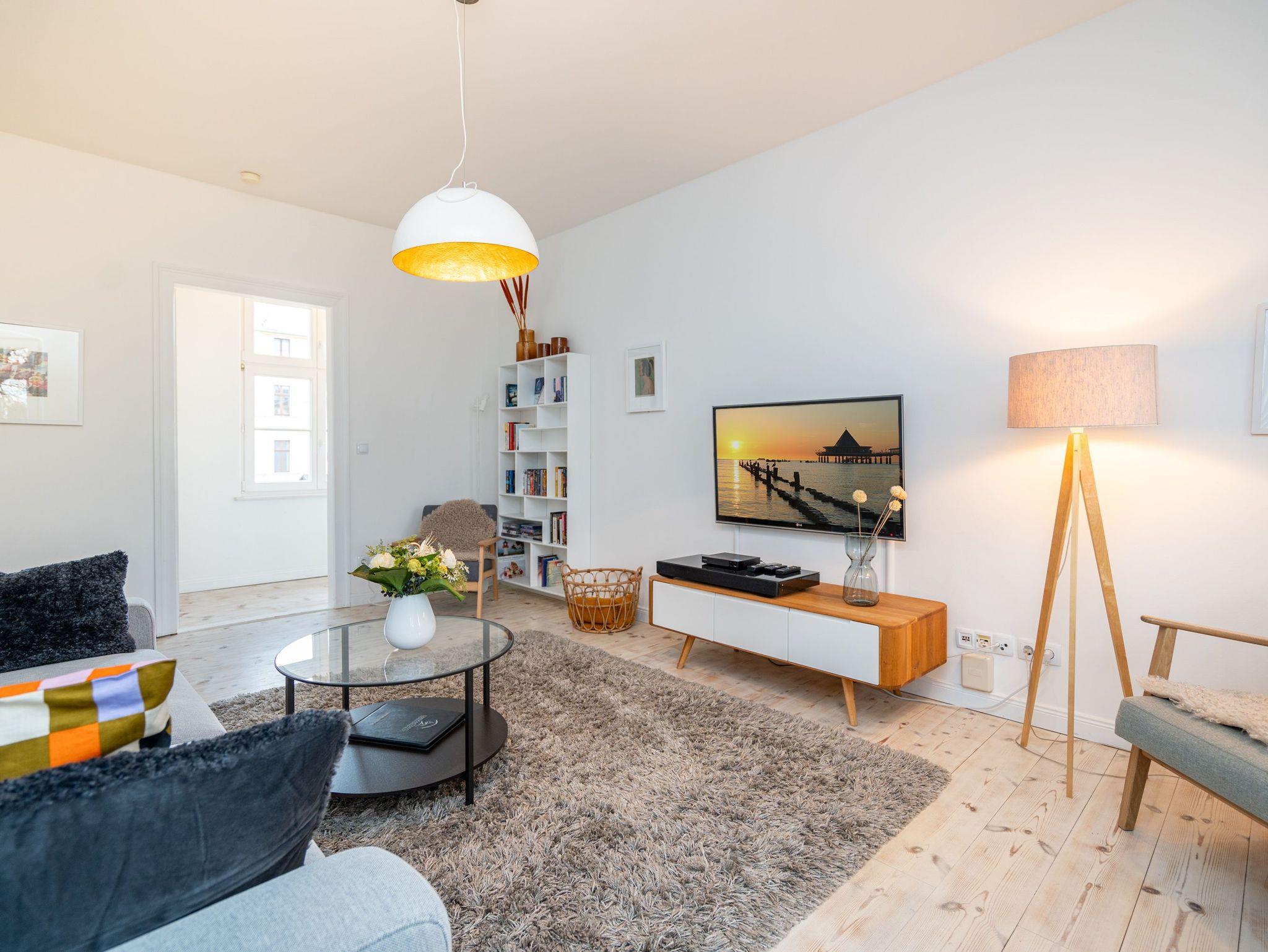 Moderner Lifestyle vom Feinsten: Erfrischend, pur, clean und entspannt macht das Interieur-Design dieses Ferienparadieses Freude und gibt ihm das gewisse Etwas. Hell und licht und mit viel Weiß lädt das Appartement 2 im Obergeschoss der Villa Diehl zum Ausspannen und Wohlfühlen ein. Bis zu 4 Personen haben in den großzügig geschnittenen 102 Quadratmetern dieser Wohnung jede Menge Platz. Ein wunderschöner Wohnbereich mit weiß gekälktem Echtholzdielenboden, flauschigem Hochflorteppich, einer stylischen Design-Sitzgruppe aus Sofa und Sesseln, dem gemütlichen Gas-Kamin und großem Flat-TV mit Blue-Ray-Player machen die Auszeit zu etwas Besonderem. Von hier aus geht es auf die sonnenüberflutete, offene Loggia mit Blick auf die begrünte Anlage hinaus. Lässt es sich schöner frühstücken als hier, wo die Ostsee sanft ins Ohr rauscht? Auch die beiden Schlafzimmer mit bequemen Doppelboxspringbetten und großen Schränken haben jeweils eigene Balkone. Die Küche ist mit hochwertigen Geräten voll ausgestattet. Nehmen Sie Platz am großen Esstisch und lassen Sie es sich schmecken. Highlight des geräumigen Badezimmers ist neben Waschtisch, WC und Echtglas-Dusche die kleine Infrarot-Sauna für zwei Personen. Hier wird es an kühlen Tagen und Abenden so richtig muschelig warm. Zur Wohnung gehört ein separates Gäste-WC. Damit Sie sich in Ihrem Urlaub wirklich um nichts kümmern müssen, liegen Handtücher für Sie bereit und die Betten sind bezogen. Sie haben im Appartement einen kostenfreien WLAN-Zugang. Auf dem Hof ist ein Pkw-Stellplatz für Sie reserviert.