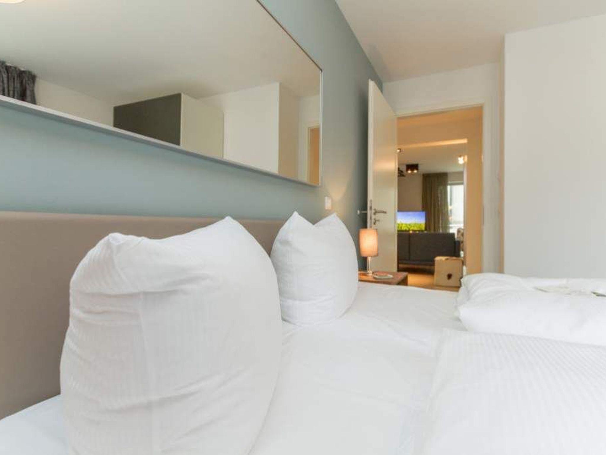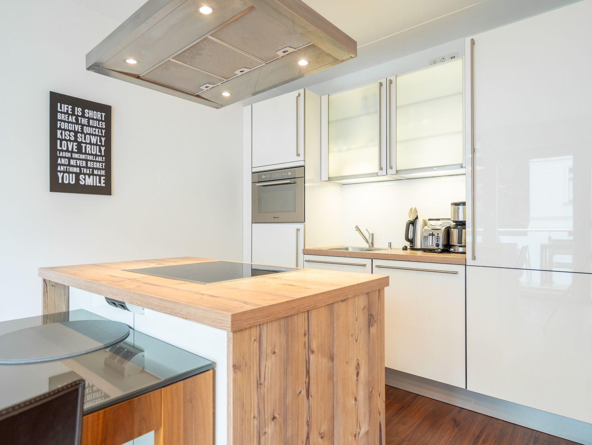 Stil gepaart mit wertigen Materialien und einer hochwertigen Ausstattung - willkommen in der Ferienwohnung 4. Im 1. Obergeschoss des Hauses, erwartet Sie ein modernes 3-Raum-Appartement (65 qm) für bis zu 4 Personen. Von einer Innenarchitektin designt, finden Sie hier einen gemütlichen Wohnbereich mit Sitzgruppe und Flat-TV, an den sich die offene, komplett ausgestattete Küche mit Essplatz anschließt. Zwei Schlafzimmer mit bequemen Boxspringbetten (1,80m x 2,00m) und jeweils eigenem Flat-TV sorgen für erholsamen Schlaf. Ein modernes Duschbad und ein Gäste-WC ergänzen die Wohnung. Ein besonderes Highlight ist der Kamin im Wohnbereich, der nicht nur im Winter für eine heimelige Atmosphäre sorgt. Auch der schöne, großzügige Süd-Balkon mit Gartenmöbel lädt zum Relaxen ein. In der Tiefgarage (Stellplatz 4) steht ein Pkw-Stellplatz zur Verfügung. Das WLAN-Netz im Haus kann kostenfrei genutzt werden.