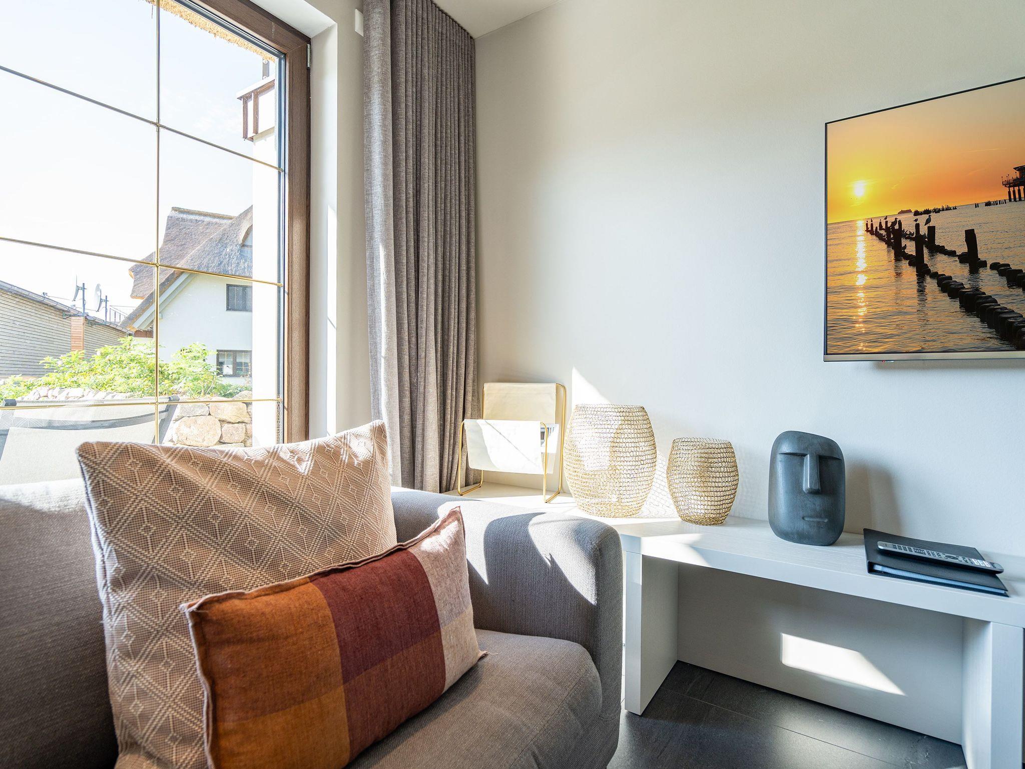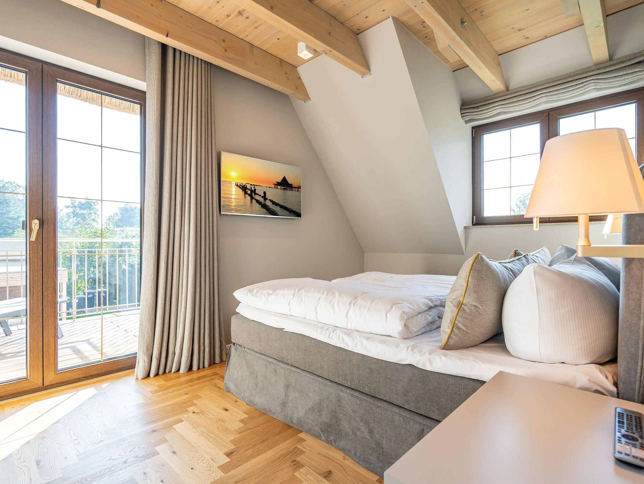 Gemütlich, stilvoll und großzügig - sind die richtigen Attribute für das Ferienhaus Reet [&] Meer N° 4. Auf den insgesamt 129 Quadratmetern und drei Etagen haben bis zu 8 Personen Platz für einen erholsamen Urlaub auf der Sonneninsel Usedom. Die Sonne können Sie auch von Ihrer großzügigen Terrasse oder vom Garten aus genießen. Hierfür stehen Ihnen zwei Sonnenliegen zur Verfügung. Ein großer Esstisch mit Sitzmöglichkeiten für bis zu 8 Personen befindet sich hier ebenfalls und lässt ein Frühstück unter freiem Himmel wahr werden. Die von Innenarchitekten konzipierte Einrichtung zieht sich wie ein roter Faden durch alle Etagen. Ein besonderes Augenmerk wurde auf die Gemütlichkeit gelegt. Der Wohn-Essbereich mit seinen komfortablen Sitzlandschaften und einer zusätzlichen Bank laden zum gemeinsamen Verweilen mit der Familie oder Freunden ein. Ein Flat-TV sowie ein Holzkamin bringen auch an kühleren Abenden Abwechslung in Ihren Urlaub. Keine Wünsche beim Zubereiten Ihrer Speisen lässt die angrenzende Küche offen. Bei einem gemeinsamen Glas Wein lässt es sich ganz wunderbar miteinander Kochen. Für lange Spieleabende oder Gesprächsrunden eignet sich der große Holztisch mit seiner Sitzbank und den bequemen Armlehnstühlen. Selbstverständlich haben Sie von hier aus einen Zugang zum Außengelände. Ein Masterbad mit Finnischer Sauna darf im Erdgeschoss ebenfalls nicht fehlen. Mit Dusche, Waschtisch und WC ausgestattet, können Sie hier nicht nur im Winter wohlige Stunden verbringen. Eine Etage höher befinden sich drei von insgesamt vier Schlafzimmern, die alle mit Boxspringbetten (1,80m x 2,00m) ausgestattet sind. Erholsamer Schlaf garantiert. Besonderen Charme versprühen die offen gehaltenen Dachbalken und der schöne Parkettboden mit Fischgrätmuster. Zwei Schlafzimmer verfügen zusätzlich über einen Flat-TV und einen gemeinsamen Zugang zu einem kleinen Balkon. Ausreichend Schrankraum (beleuchtet) für Ihre Urlaubsgarderobe steht Ihnen in allen Zimmern zur Verfügung. Ein weiteres Badezimmer mit begehbarer Dusche, Waschtisch und WC rundet diese Etage ab. Unter dem Dach geht es ebenfalls gemütlich her: Ein Schlafzimmer mit Boxspringbett (1,60m x 2,00m) sowie ein Flat-TV und ein separates Gäste-WC stehen Ihnen unter dem Dach zur Verfügung. Ein Gaubenfenster (aktuell noch ohne Verdunklungsmöglichkeit) rundet das vierte Schlafzimmer ab. Für Ihren Komfort sind die Betten bei Anreise bezogen und Handtücher liegen für Sie bereit. Zudem befinden sich unter dem Carport zwei PKW-Stellplätze am Haus N° 4 sowie ein Schuppen für Ihre Fahrräder. Ein Waschtrockner sowie kostenfreies W-Lan runden dieses Urlaubsdomizil ab.