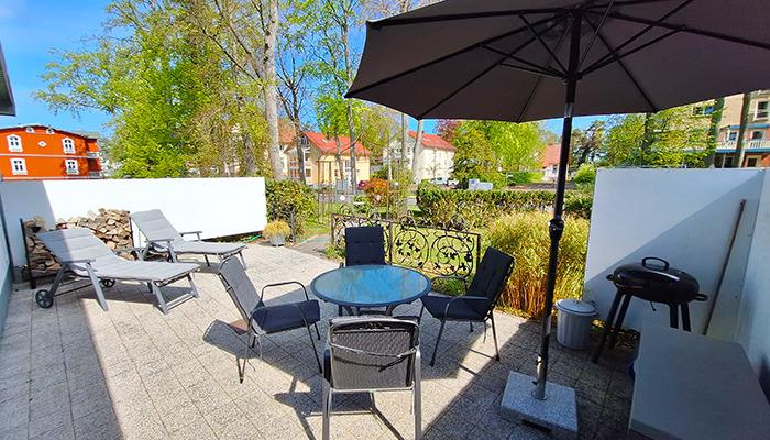 - mit Zugang auf die eigene Terrasse mit Garten, Grill, Sonnenliegen und Sitzgarnitur