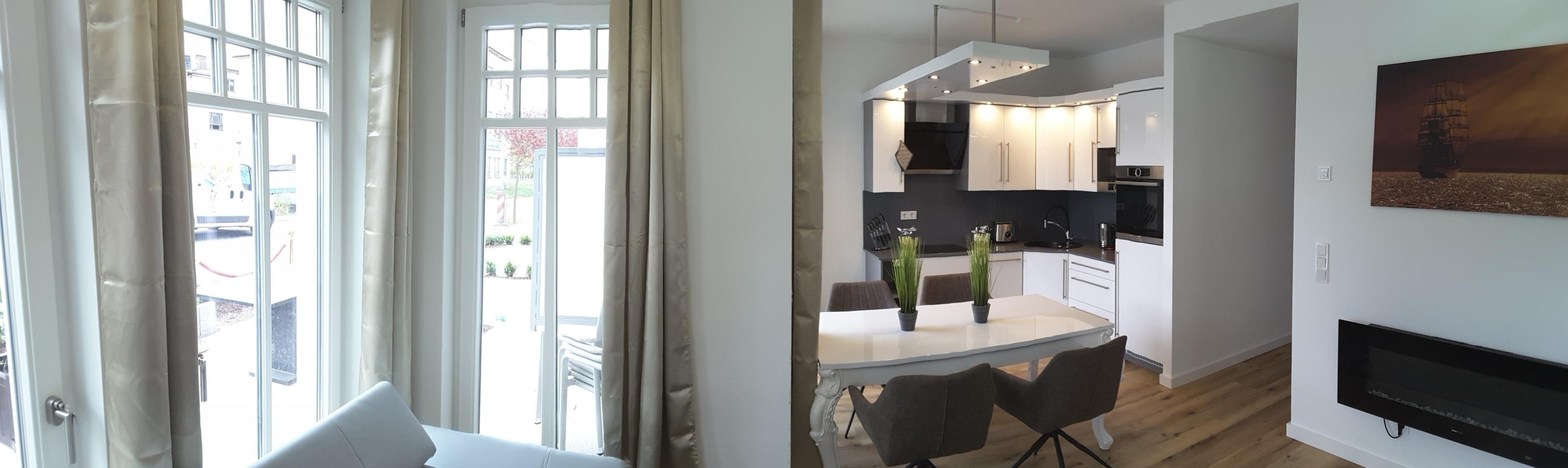 Die Wohnung 5 befindet sich im ersten Obergeschoss des Westendpalais und hat einen Balkon. Zwei Schlaf- und Badezimmer (mit Dusche) ermöglichen einen stressfreien Urlaub für vier Personen. Die vollausgestattete Küche ist in Sichtweite des offenen Wohn-Essbereiches gelegen und verspricht gemütliche Abende mit Meerblick.Westendpalais