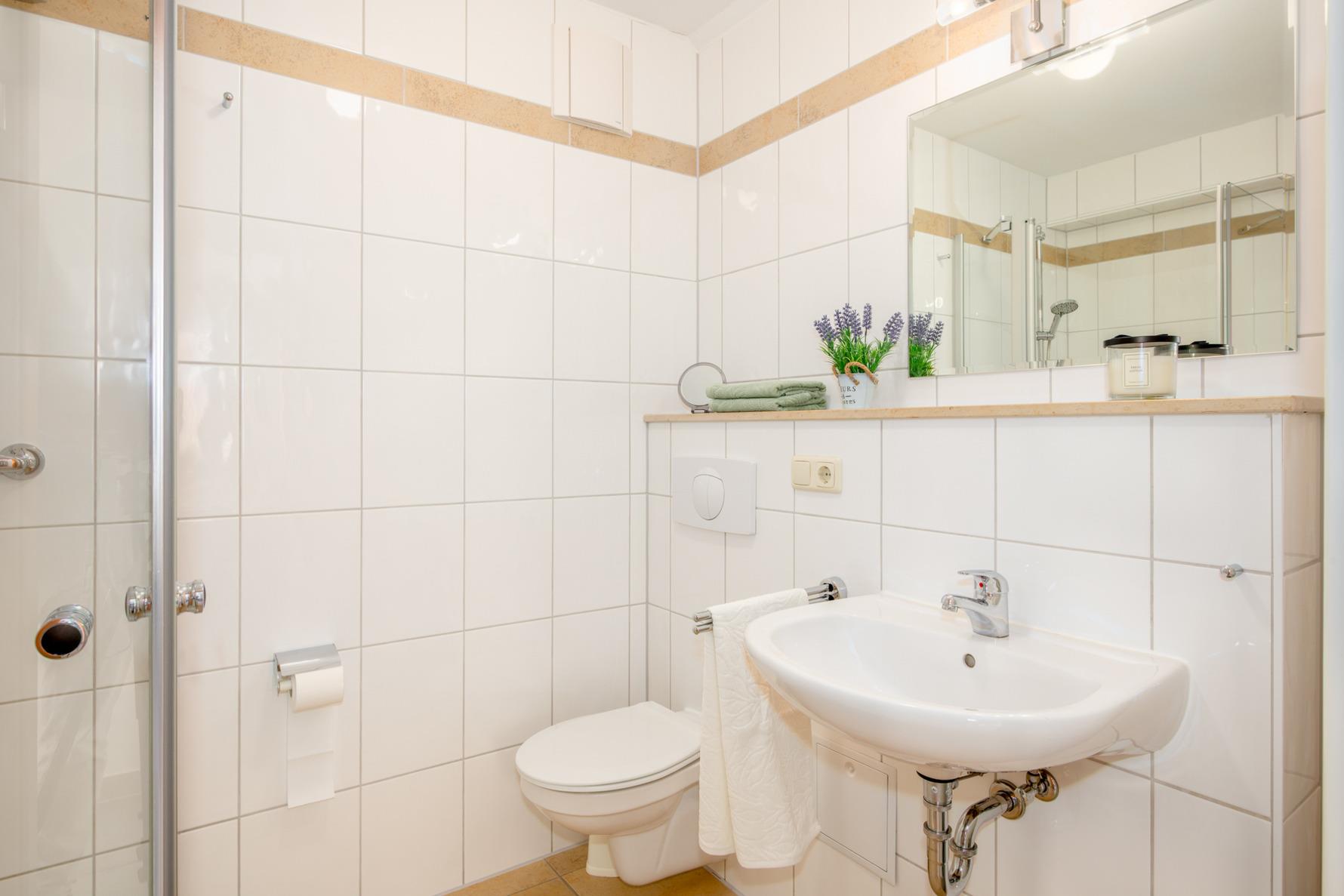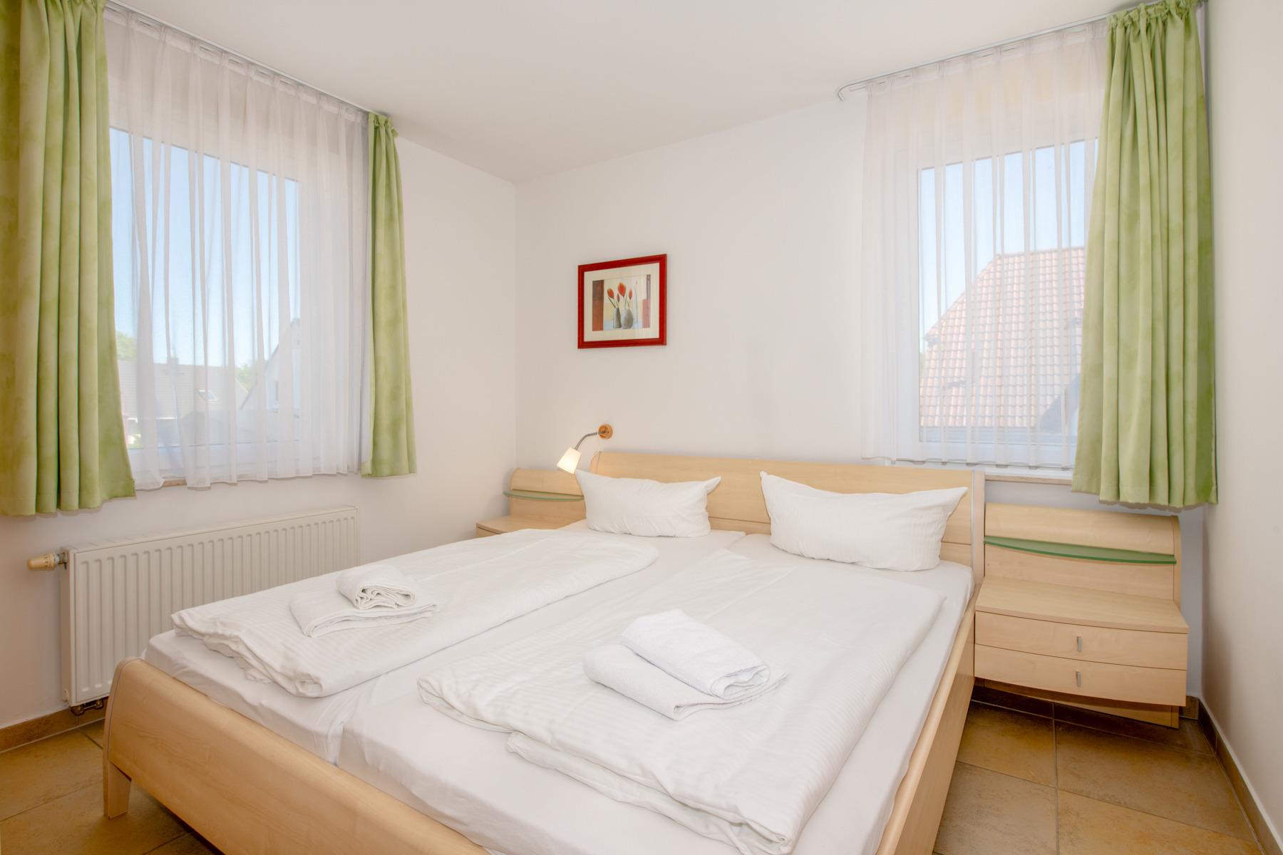 Die Wohnungen im Obergeschoss sind mit einem Balkon ausgestattet und haben eine Größe von 65 m². Jede Wohnung verfügt über zwei separate Schlafzimmer, wovon eines mit einem Doppelbett und das andere mit zwei Einzelbetten eingerichtet ist. Des Weiteren befindet sich in jeder Wohnung ein Badezimmer mit einer Dusche und einem WC. Eine voll ausgestattete Küche mit einem Ess- und Wohnbereich ist ebenfalls vorhanden.