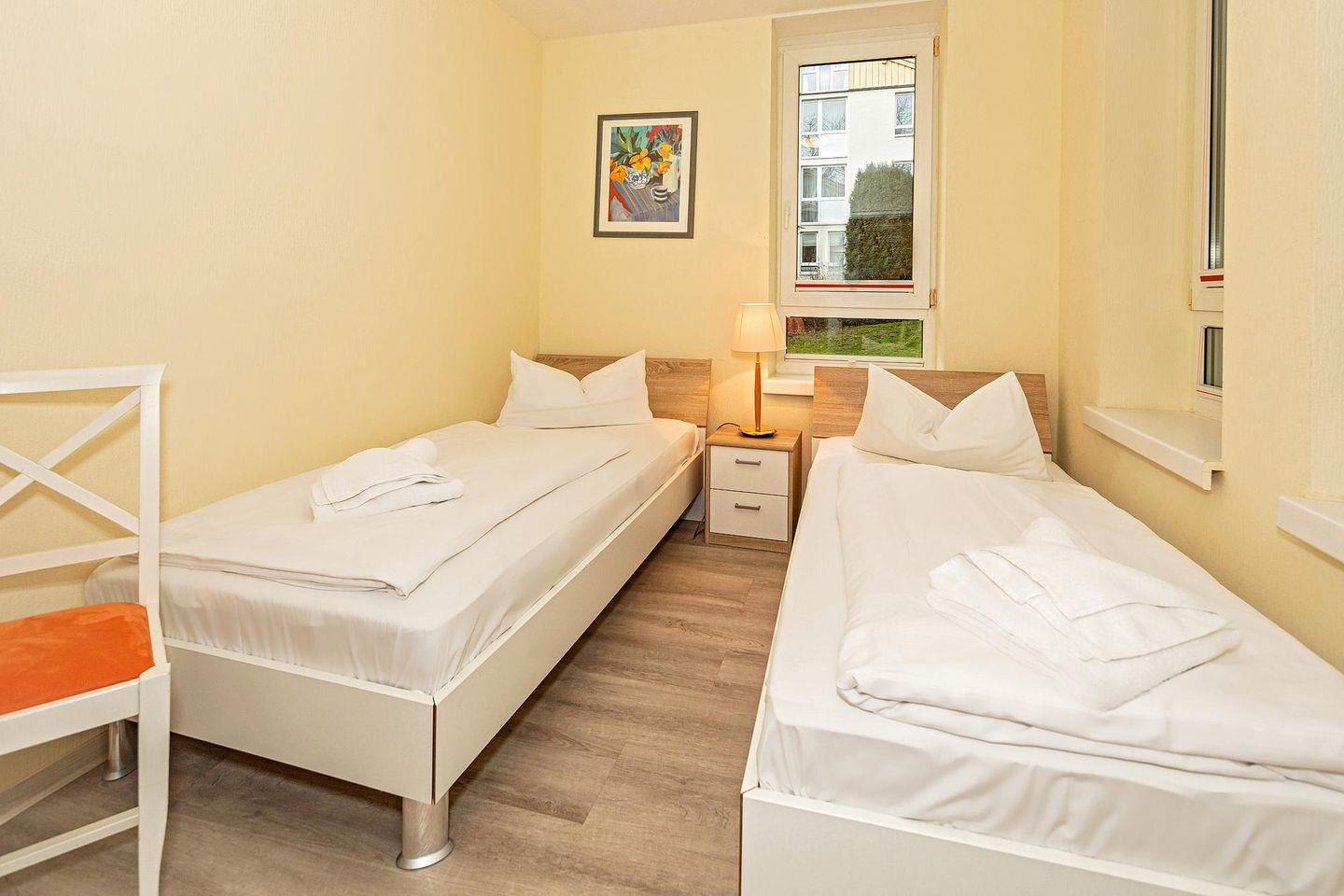Das helle Apartment verfügt über kostenfreies WLAN. Die offene Küche mit Essbereich bietet euch Geschirrspüler, Kühlschrank mit Gefrierfach, Kaffeemaschine, Toaster, Wasserkocher, Backofen und Mikrowelle. Im modernen Badezimmer befinden sich eine Dusche sowie ein Waschtisch mit Föhn und Kosmetikspiegel. Eines der beiden Schlafzimmer verfügt über ein Doppelbett (1,80 m x 2,00 m), das zweite über zwei getrennte Einzelbetten (0,90 m x 2,00 m). Im Wohnzimmer steht euch ein Flatscreen-TV zur Verfügung. Die Wohnung verfügt über ein zustellbares Kinderreisebett und auf Wunsch könnt ihr auch gerne einen Hochstuhl hinzubuchen. Die Terrasse mit Gartenzugang macht den Ostsee-Urlaub hier perfekt.