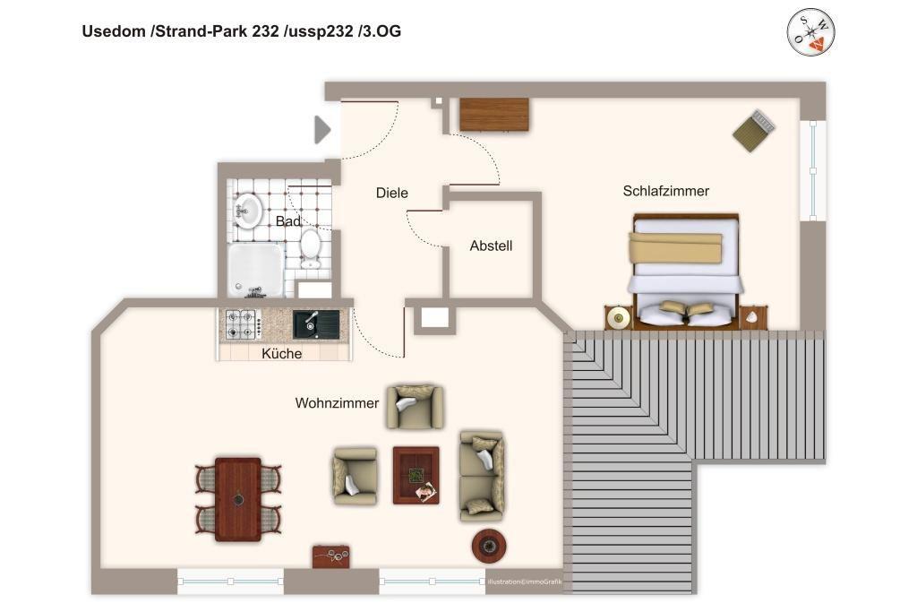 Der „Strand-Park“ hat direkten Zugang zur Strandpromenade von Heringsdorf. Die 57 qm große 2-Zimmer-Dachwohnung mit Blick ins Grüne und zur Promenade bietet Platz für bis zu 4 Personen.
