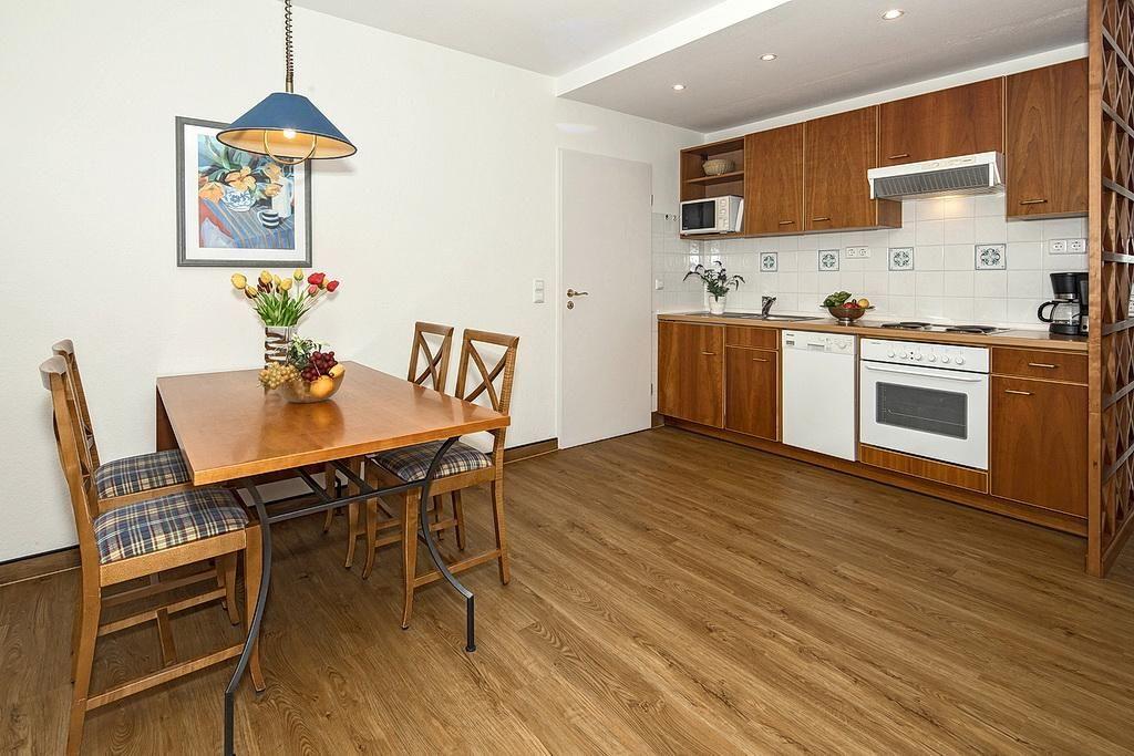Das Apartment bietet euch eine voll ausgestattete offene Küche mit Wasserkocher, Kaffeemaschine, Toaster, Herd mit Backofen, Geschirrspüler, Mikrowelle und Kühlschrank mit Tiefkühlfach.