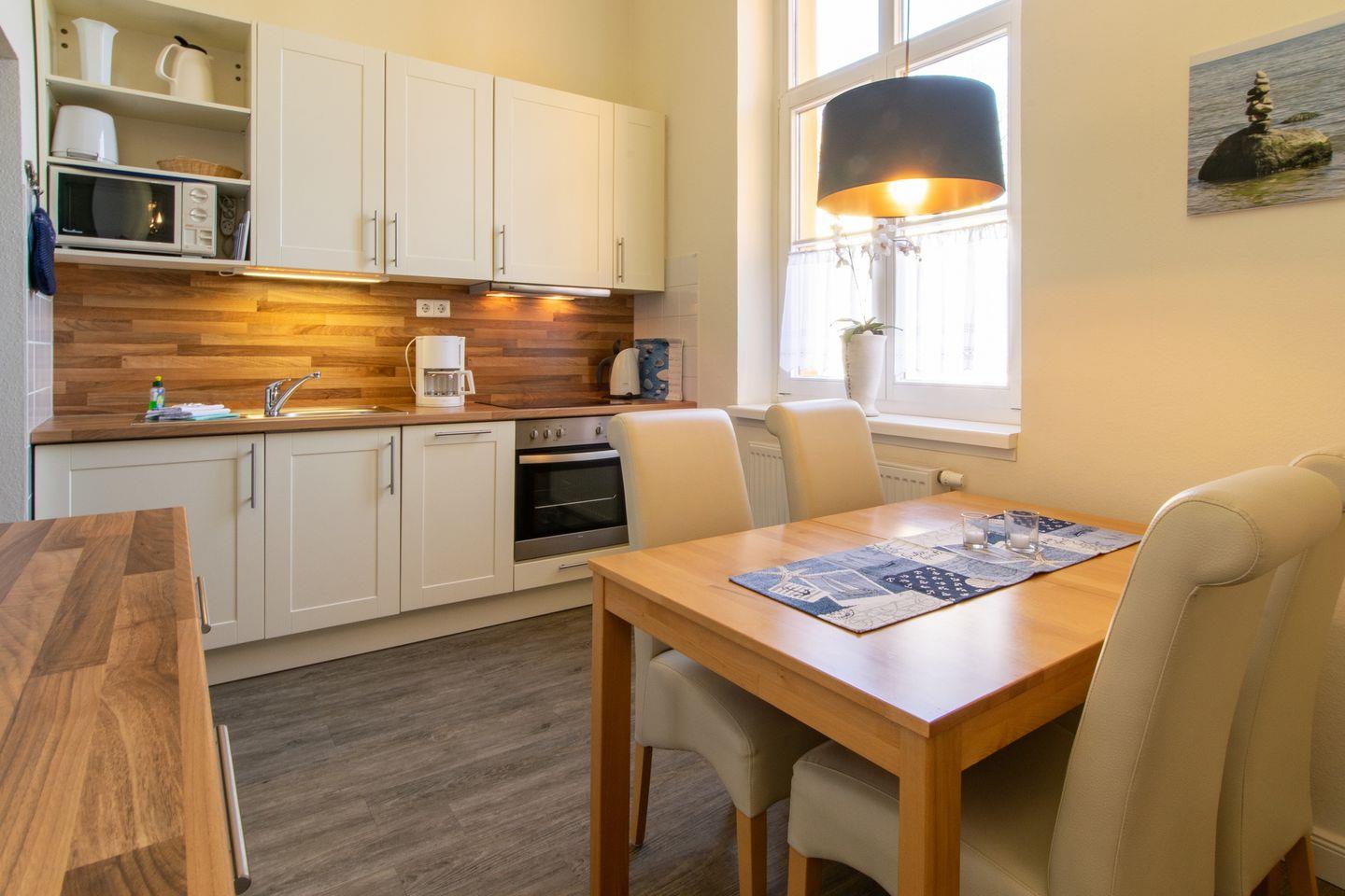 Die Nichtraucher-Ferienwohnung mit Duschbad verfügt über kostenfreies WLAN und besteht aus einem Schlafzimmer mit Doppelbett sowie dem Wohnbereich mit Doppelschlafcouch, Flatscreen-TV und HiFi-Anlage. Eine wunderschöne Loggia mit Rundbogen und Freitreppe mit Blick in den Park gehören ebenso zur Wohnung, wie die voll ausgestattete offene Küche mit Wasserkocher, Kaffeemaschine, Toaster, Herd mit Backofen, Geschirrspüler, Mikrowelle und einem Kühlschrank mit Gefrierfach.