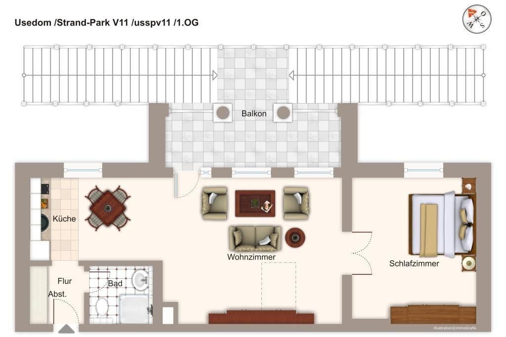Die Ferienanlage „Strand-Park“ liegt direkt an der Strandpromenade von Heringsdorf. Das 57 qm große 2-Zimmer-Apartment mit Loggia und Blick in die grüne Parkanlage ist für bis zu 4 Personen geeignet.