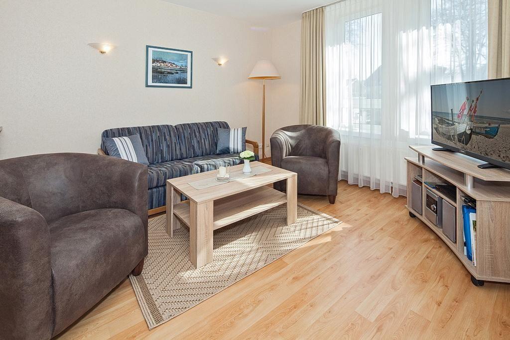 Die Ferienwohnung mit Duschbad verfügt über ein Schlafzimmer mit Doppelbett. Der Wohnbereich besteht aus einer Doppelschlafcouch mit zwei Sesseln, Flatscreen-TV, Blu-ray Player und einer HiFi-Anlage, einem angeschlossenen gemütlichen Essbereich und einem sonnigen Balkon mit Blick in die gepflegte Parkanlage.