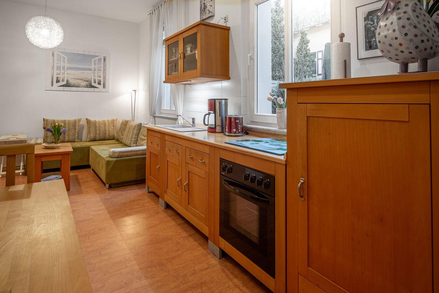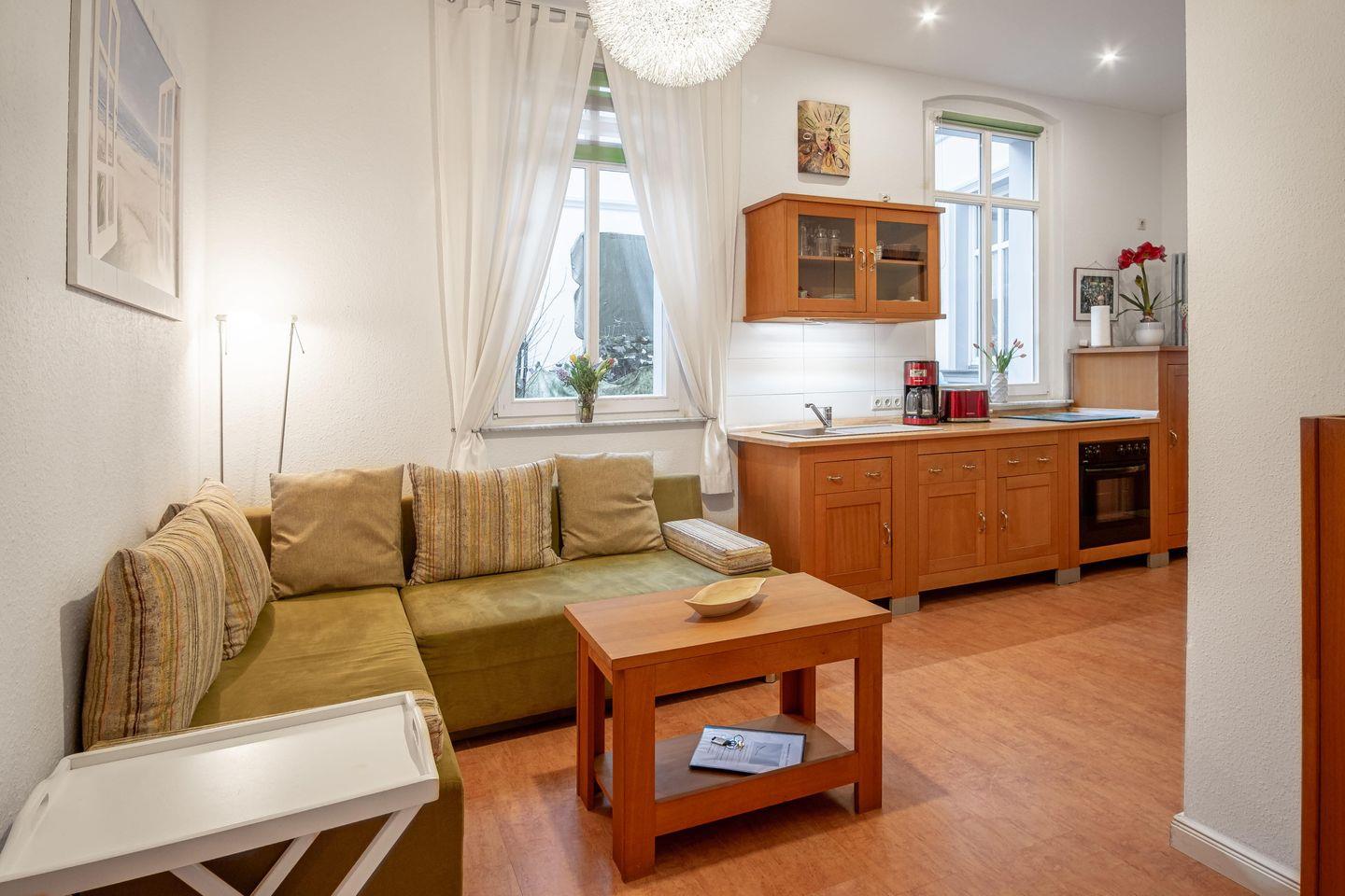 Ferienwohnung "Strand" in Heringsdorf: Ideal für zwei Erwachsene und ein Kind. Kurze Wege zu Fußgängerzone und Strand, nahe Kur- und Erholungswald. Ausstattung: Queen-size Bett, Schlafsofa, TV, Bücher, Brettspiele, voll ausgestattete Küche. Außenbereich zum Entspannen. Kostenfreier Parkplatz inklusive. Haustiere willkommen (max. ein Tier, eigenes Bett/Decke mitbringen). Ideal für entspannten Usedom-Urlaub.