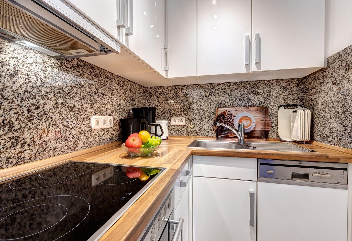 Willkommen in unserer charmanten Wohnung GP02 im Herzen der Wohnanlage, zertifiziert mit 5 DTV-Sternen und gelegen im ersten Stock. Diese elegante Unterkunft bietet Platz für bis zu drei Personen und besticht durch eine hochwertige Ausstattung sowie modernes Design. Der Wohnbereich verfügt über ein komfortables Schlafsofa mit einer großzügigen Länge von 1,70 Metern, perfekt für erholsame Nächte. Durchgehend mit hochwertigem Natursteinboden ausgestattet, strahlt die Wohnung eine zeitlose Eleganz aus.