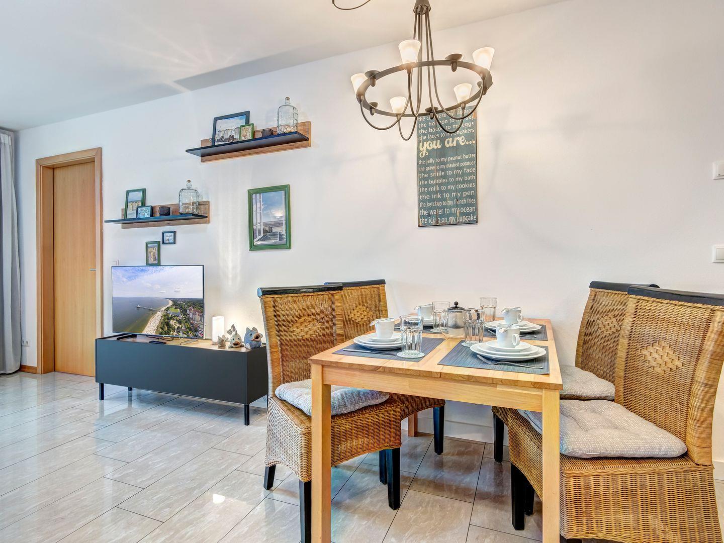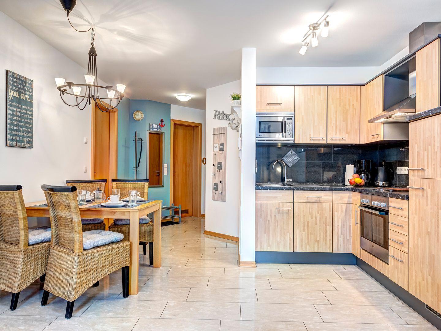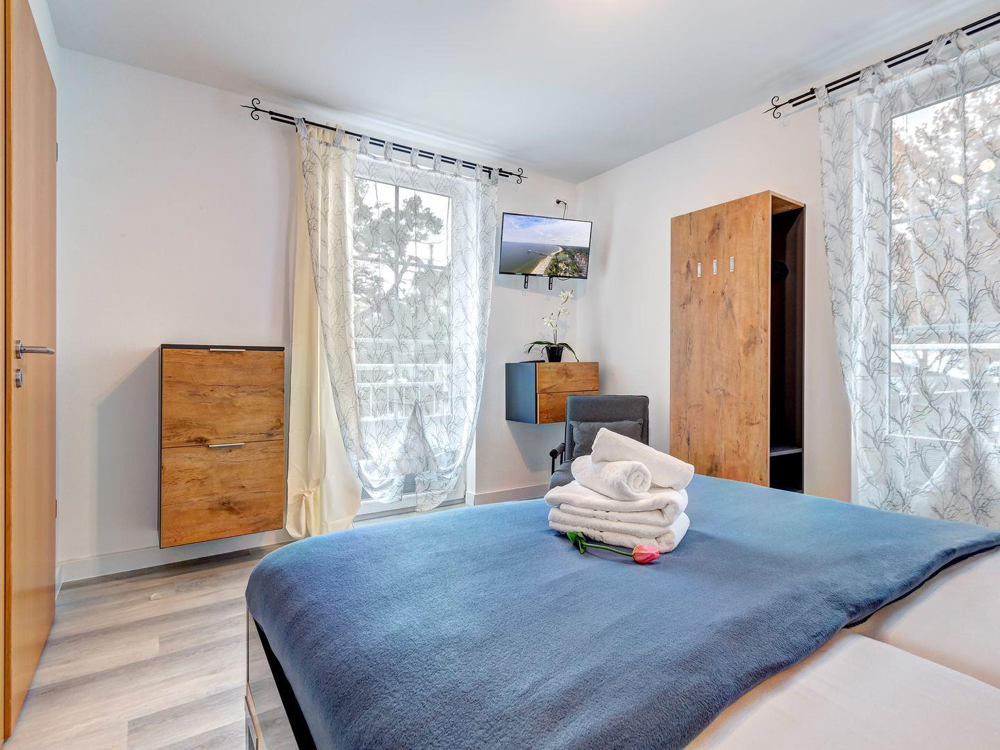 Die im 1. Obergeschoss der Ostseeresidenz gelegene Wohnung verfügt über eine hochwertige Ausstattung und bietet mit 2 separaten Schlafzimmern und einen großzügigen Wohn-/Essbereich Platz für bis zu 4 Personen. Die mit den 5-DTV-Sternen zertifizierte Wohnung ist modern und exklusiv zugleich eingerichtet. Der Fußboden beheizt und aus hochwertigem Naturstein bietet das Gefühl für mehr Komfort. Selbstverständlich stehen unseren Gästen auch ein Badezimmer mit Dusche, sowie ein Gäste-WC zur Verfügung.