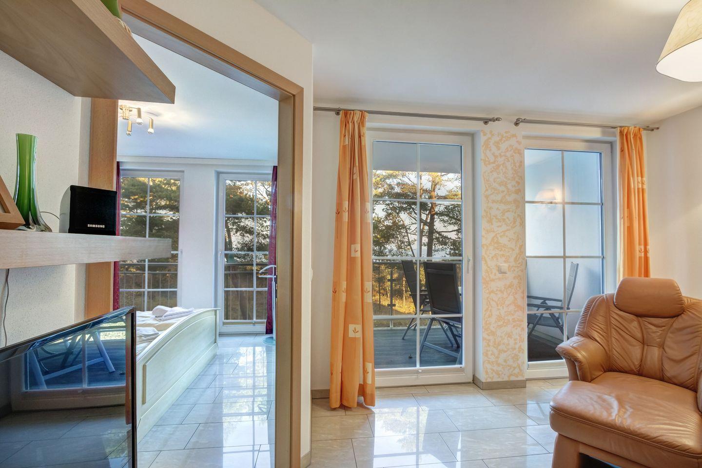 Die im 2. Obergeschoss einer eleganten Wohnanlage gelegene, mit 5 DTV-Sternen ausgezeichnete Ferienwohnung bietet Platz für bis zu 2 Personen und überzeugt mit hochwertiger Ausstattung. Ein durchgängiger, edler Marmorboden und das moderne Interieur verleihen der Wohnung ein stilvolles Ambiente. Sowohl der helle Wohnbereich als auch das separate Schlafzimmer bieten Ihnen einen wunderbaren Ausblick auf die Ostsee. Der geschützte Balkon lädt auch bei windigem Wetter dazu ein, den Tag entspannt zu beginnen oder die frische Meeresbrise zu genießen.