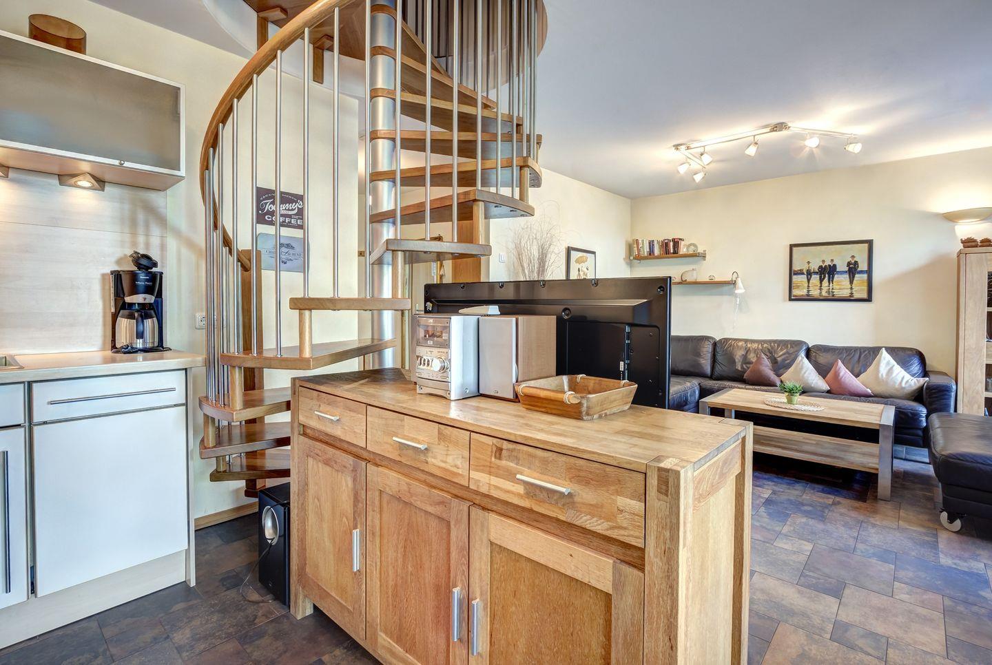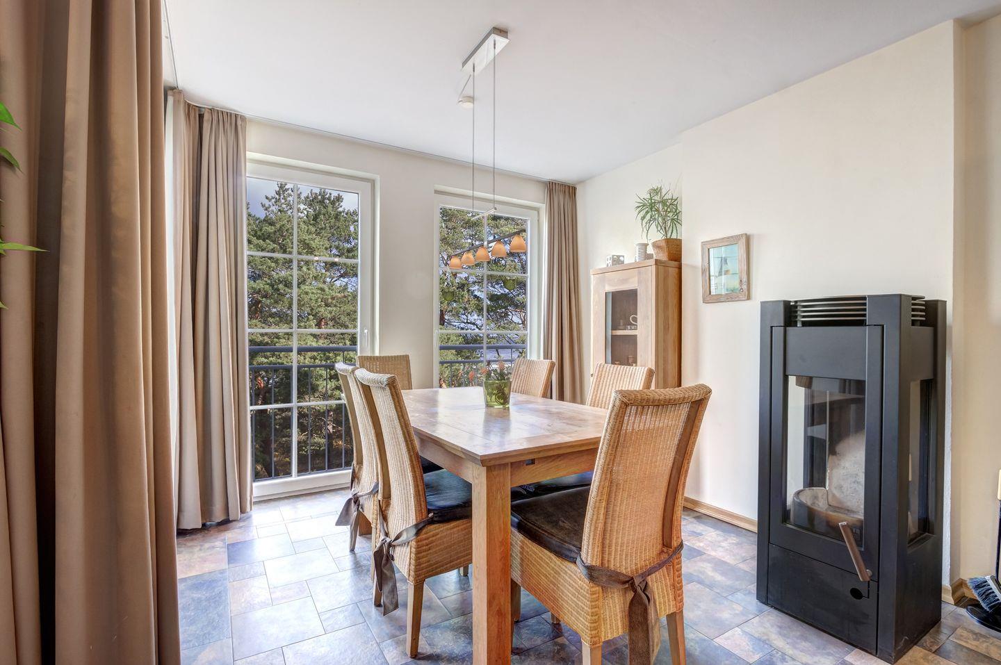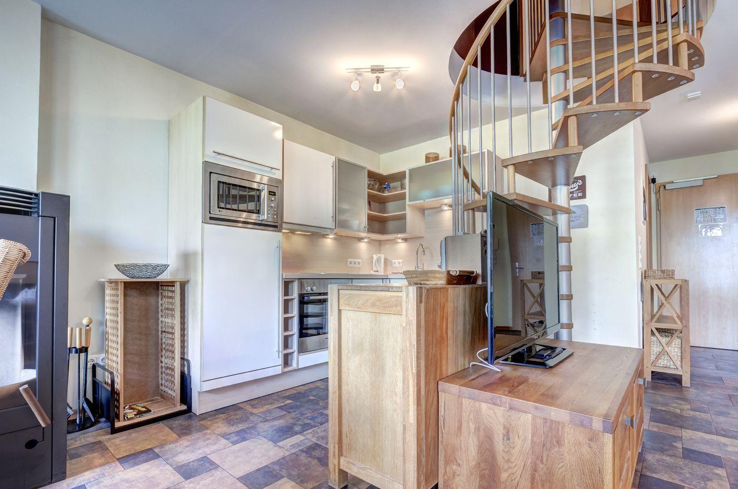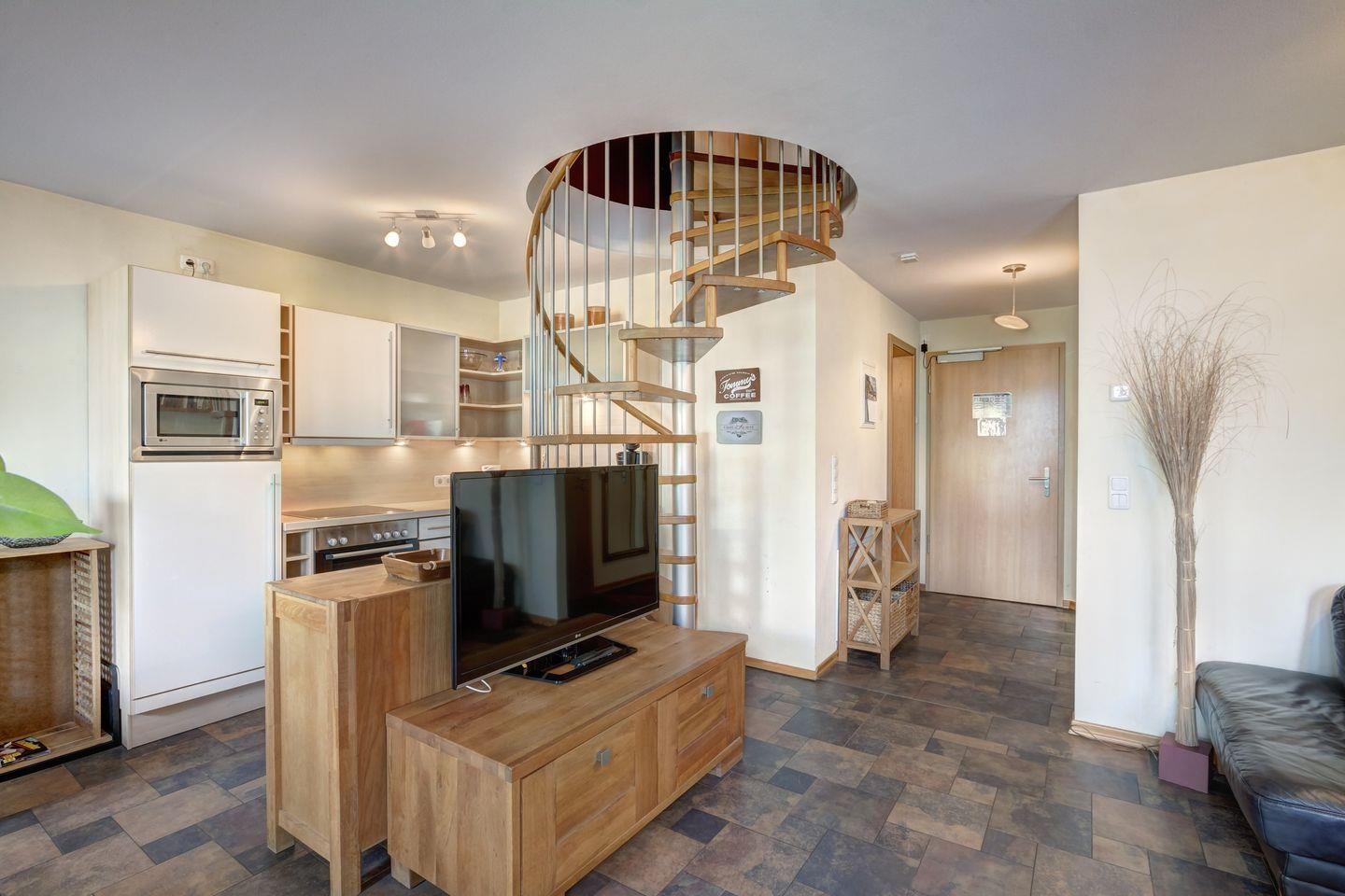 Die luxuriöse 5-Sterne-Maisonette-Wohnung GP18 erstreckt sich über das 3. Ober- und Dachgeschoss und besticht durch eine großzügige Raumaufteilung sowie einen spektakulären Ostseeblick aus dem Wohnzimmer. Das Schlafzimmer bietet durch ein großes Panoramafenster einen unvergesslichen Blick auf das Meer. Eine Wendeltreppe führt in die zweite Wohnebene, wo zwei weitere Schlafzimmer und ein zusätzliches Badezimmer auf Sie warten. Die Wohnung bietet Platz für bis zu vier Personen und ist mit eleganten Natursteinböden ausgestattet. Der offene Kamin sorgt für eine behagliche Atmosphäre an kalten Abenden.