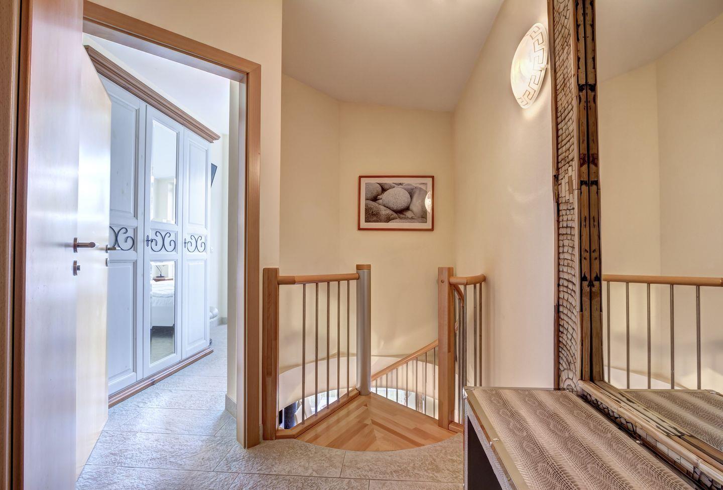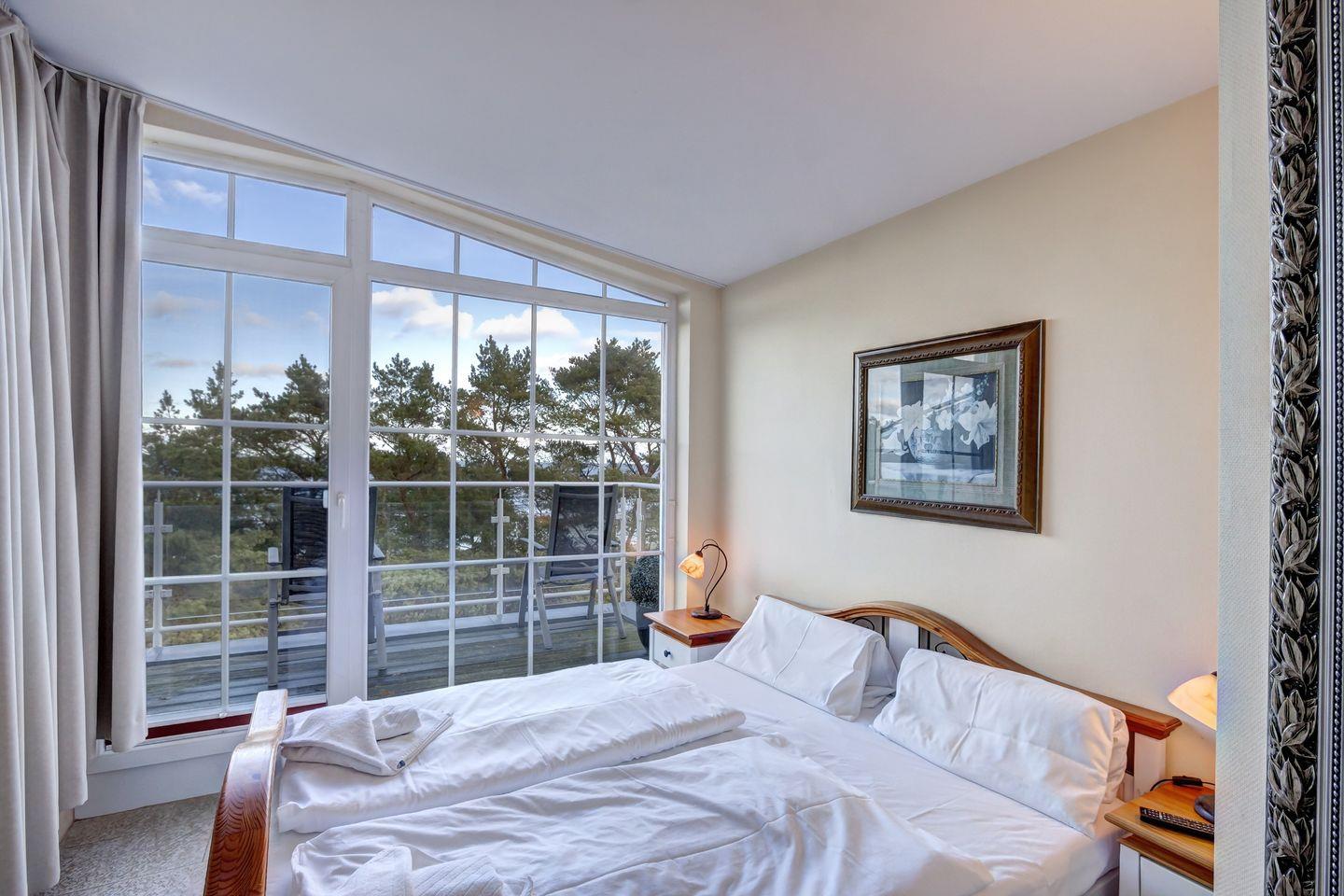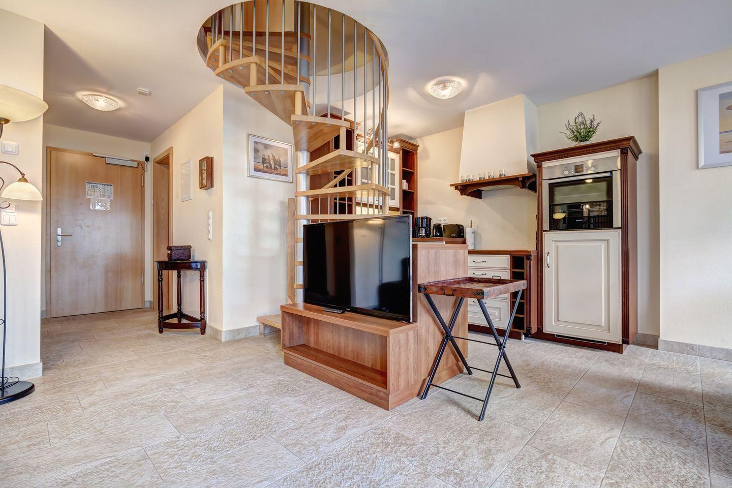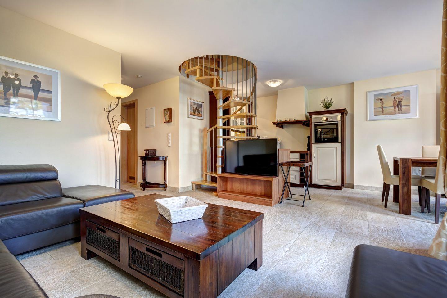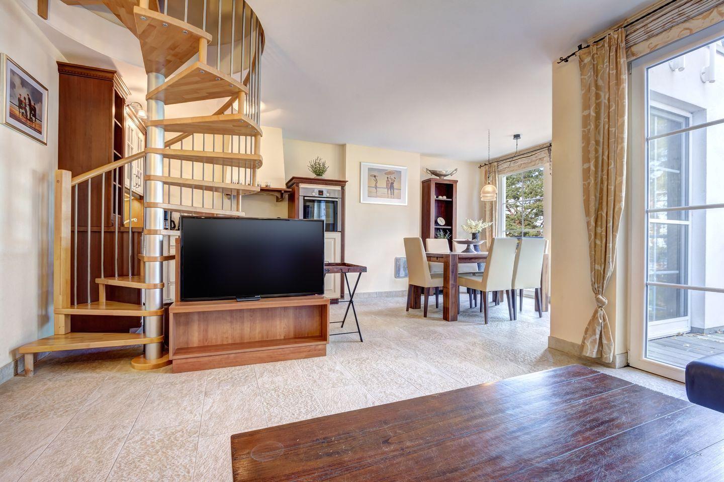 Vom Wohnzimmer führt eine Wendeltreppe in die zweite Wohnebene, die ein großes Kinderzimmer, ein Elternschlafzimmer sowie ein weiteres Badezimmer umfasst. Durch das überdimensionale Panoramafenster im Schlafzimmer genießen Sie einen unvergleichlichen Ausblick auf die Ostsee. Die Wohnung bietet ausreichend Platz für bis zu 4 Personen.