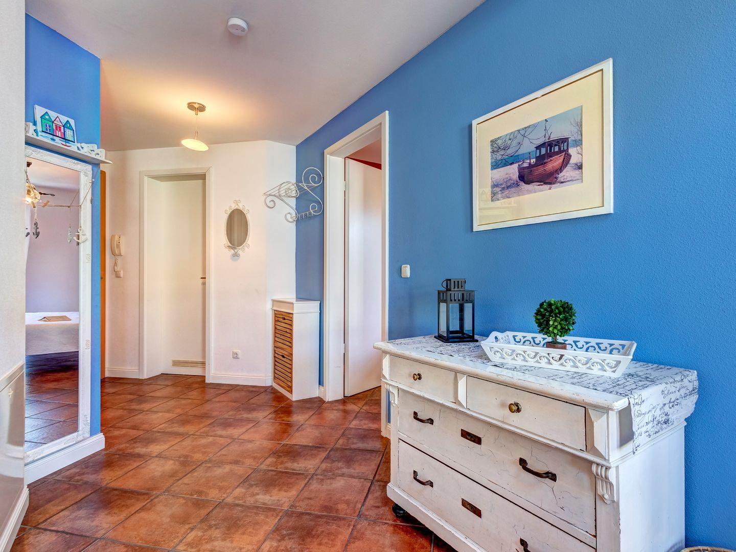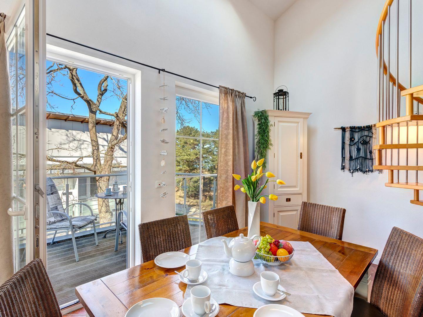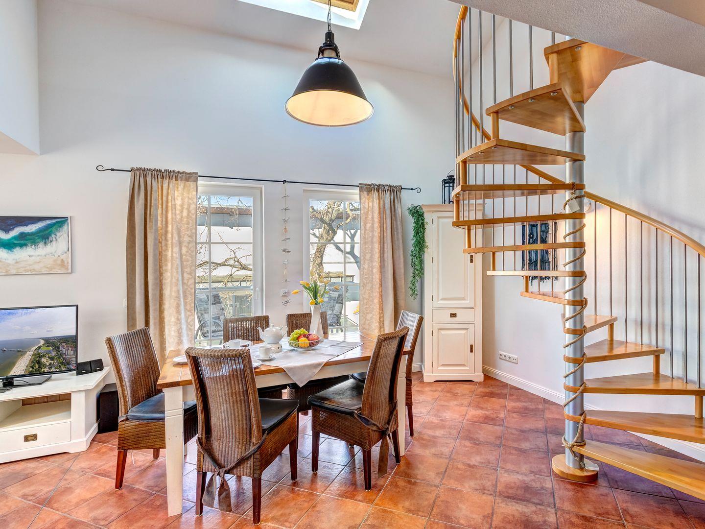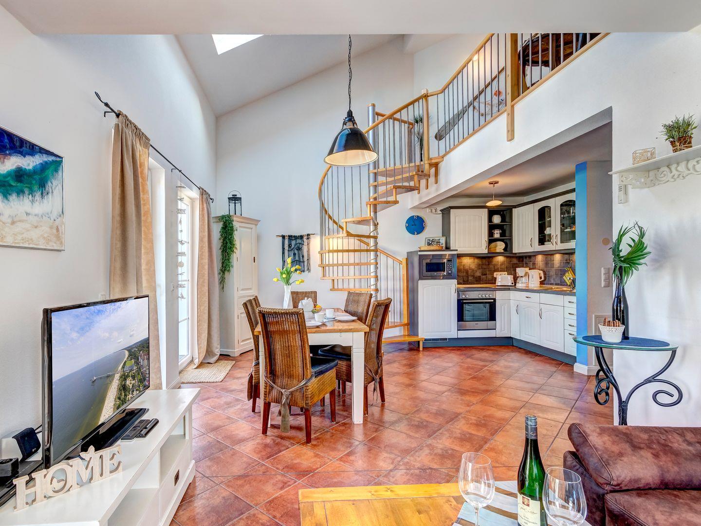 Die im 3. Obergeschoss und Dachgeschoss einer Wohnanlage gelegene, mit 5-DTV-Sternen ausgezeichnete Ferienwohnung bietet exklusiven Komfort auf 103 m², verteilt auf 2 Wohnebenen mit Galerie. Mit 3 vollwertigen Schlafzimmern bietet sie Platz für bis zu 6 Personen – ideal für größere Familien oder Gruppen. Zwei südlich ausgerichtete Balkone laden zum Verweilen ein. Die zweite Wohnebene, erreichbar über eine Wendeltreppe, umfasst separate Schlafräume, ein eigenes Bad sowie einen eigenen Eingang. Terracottafußböden in den Wohnbereichen und hochwertiges Parkett in den Schlafzimmern schaffen ein südländisches Flair.