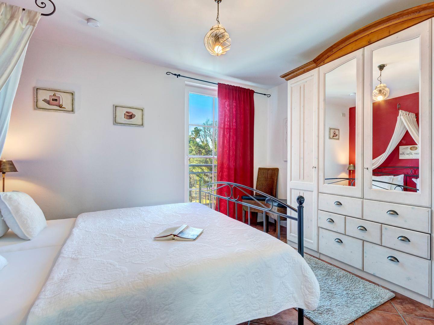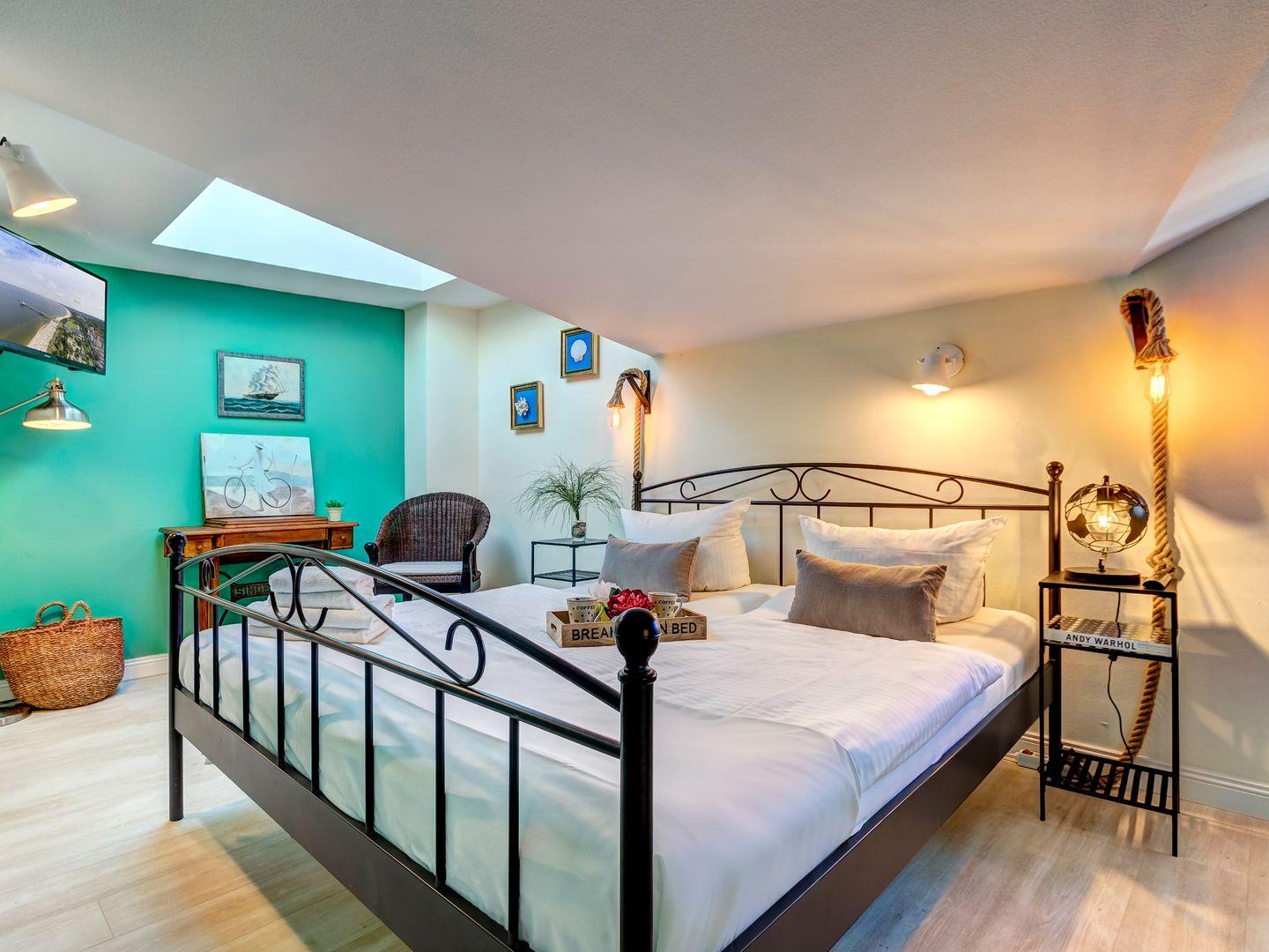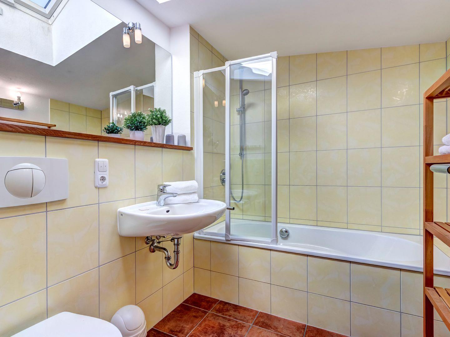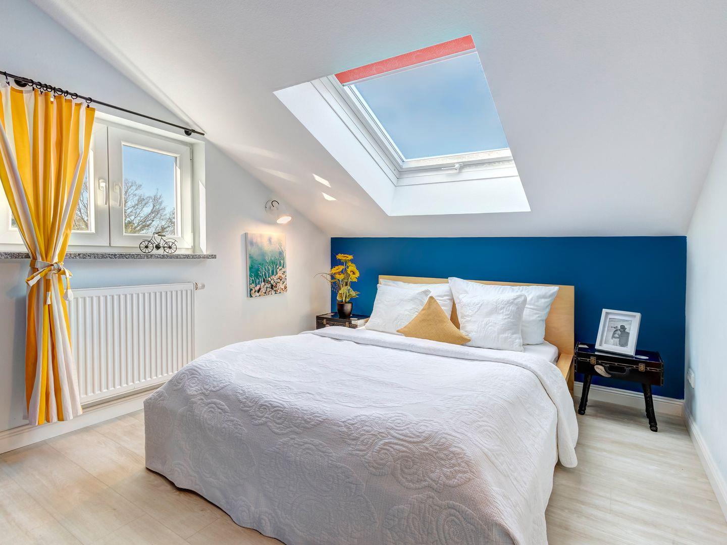 Die im 3. Obergeschoss und Dachgeschoss einer Wohnanlage gelegene, mit 5-DTV-Sternen ausgezeichnete Ferienwohnung bietet exklusiven Komfort auf 103 m², verteilt auf 2 Wohnebenen mit Galerie. Mit 3 vollwertigen Schlafzimmern bietet sie Platz für bis zu 6 Personen – ideal für größere Familien oder Gruppen. Zwei südlich ausgerichtete Balkone laden zum Verweilen ein. Die zweite Wohnebene, erreichbar über eine Wendeltreppe, umfasst separate Schlafräume, ein eigenes Bad sowie einen eigenen Eingang. Terracottafußböden in den Wohnbereichen und hochwertiges Parkett in den Schlafzimmern schaffen ein südländisches Flair.