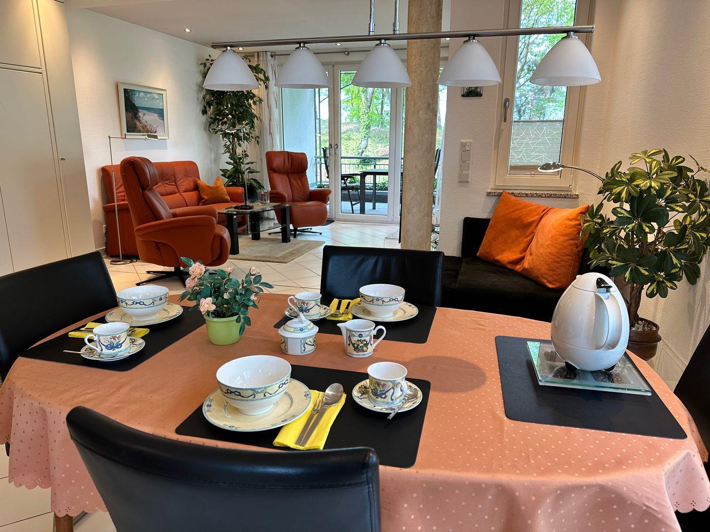 - ein großzügiger Esstisch trennt optisch den Wohnbereich von der Küche und bietet Platz für vier Personen.