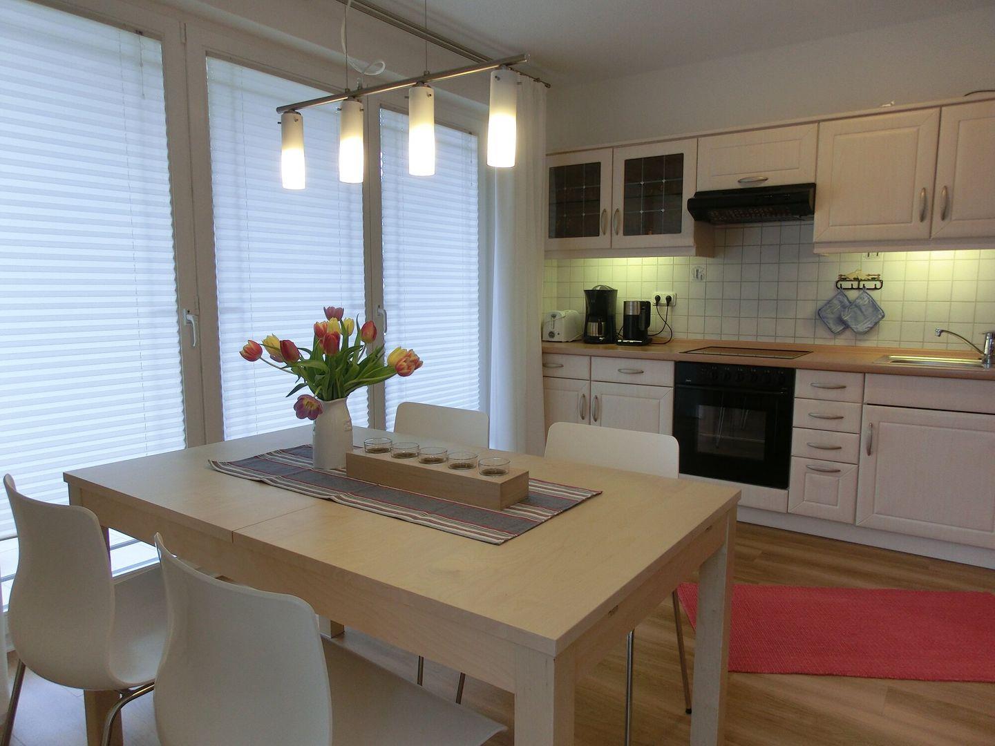 Sie erwartet eine liebevoll eingerichtete Wohnung im ersten Obergeschoss der Villa Strandoase. Das helle, offene Wohnzimmer führt direkt auf einen großzügigen Balkon, der zum Verweilen an der frischen Meeresluft einlädt. Die moderne, voll ausgestattete Küchenzeile mit Geschirrspüler ist stilvoll in den Wohnraum integriert und bietet alles, was Sie für einen komfortablen Aufenthalt benötigen. Flachbild-TV (2. Fernseher im Schlafzimmer), Radio, DVD-Player mit DVDs sowie kostenloses WLAN bieten Unterhaltung abends oder an verregneten Ferientagen.