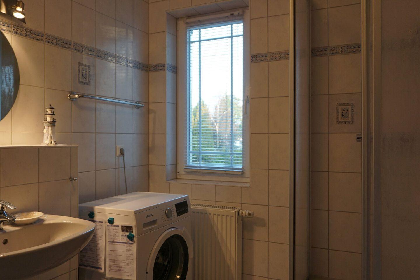 Das geräumige Tageslichtbad verfügt über eine Dusche und ist mit einer Waschmaschine ausgestattet – ideal für Ihren Komfort, auch bei längeren Aufenthalten.