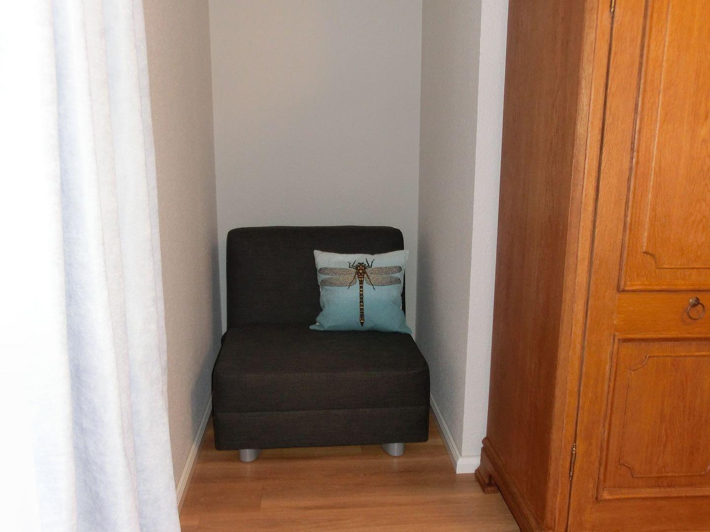 Im geschmackvoll eingerichteten Schlafzimmer erwartet Sie ein bequemes 1,80 m breites Doppelbett. Zusätzlich bietet das Wohnzimmer mit seinem komfortablen Schlafsofa (Matratze 1,60 m breit) Platz für zwei weitere Gäste. Alternativ kann für ein Kind ein Schlafsessel im Schlafzimmer genutzt werden. Ein praktischer Schreibtisch ermöglicht Ihnen, bei Bedarf auch während Ihres Urlaubs produktiv zu sein – ideal für eine Workation in entspannter Atmosphäre.