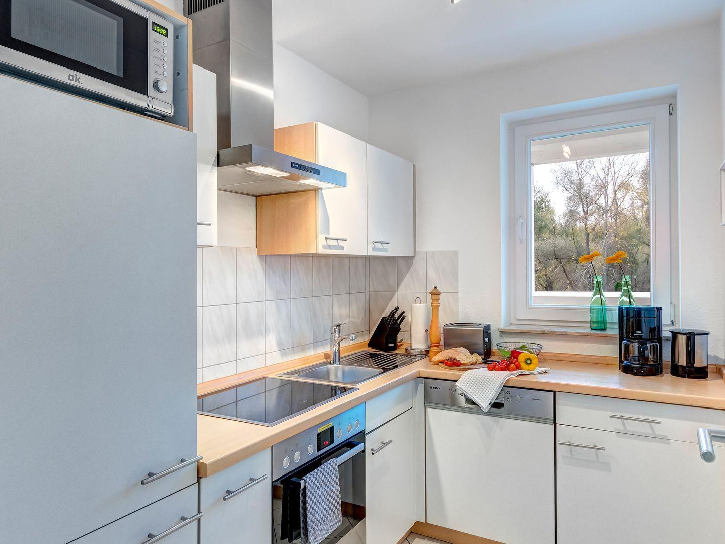 Die voll ausgestattete Küche ist als separater Raum gestaltet und bietet alle Möglichkeiten für kulinarischen Genuss. Zwei komfortable Schlafzimmer machen die Wohnung ideal für Familien mit Kindern oder kleine Reisegruppen bis zu vier Personen. Das geräumige Badezimmer mit Fenster ist mit einer modernen Dusche ausgestattet und bietet alles, was Sie für Ihre tägliche Pflege benötigen. Diese stilvolle Unterkunft verbindet höchsten Komfort mit der Nähe zur Natur.
