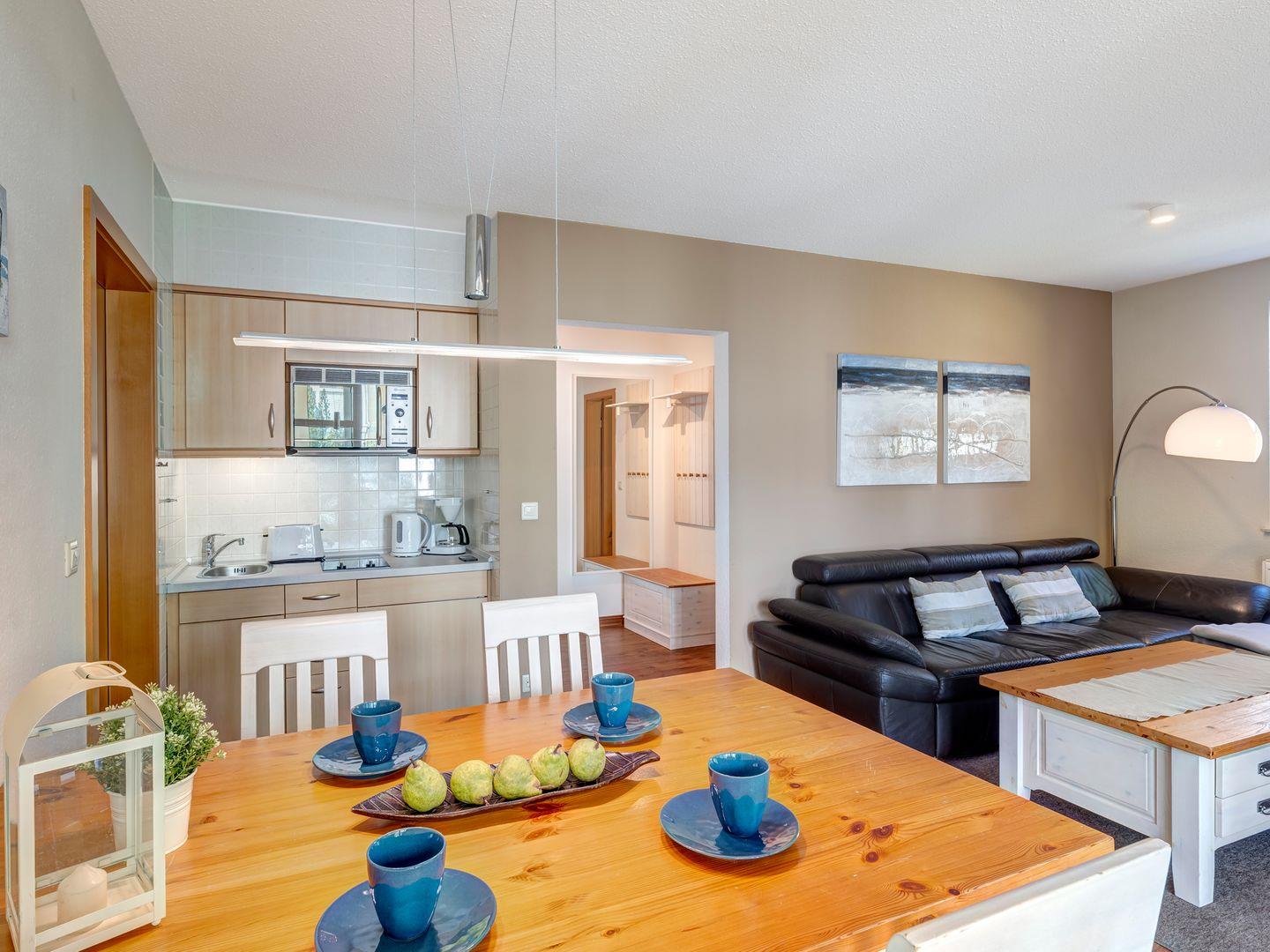 Das lichtdurchflutete Wohnzimmer lädt mit einer gemütlichen Sitzecke zum Entspannen ein und bietet Zugang zu einer integrierten, voll ausgestatteten Küche, die ideal für die Zubereitung von leckeren Urlaubsmahlzeiten ist. Im Schlafzimmer erwartet Sie ein großes Doppelbett, zusätzlich steht eine bequeme Schlafcouch im Wohnzimmer zur Verfügung, die weiteren zwei Erwachsenen eine Übernachtungsmöglichkeit bietet.