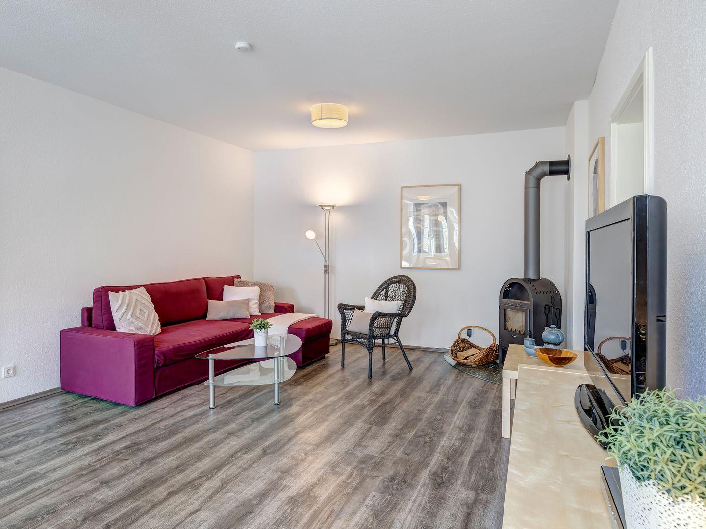 Die Ferienwohnung bietet Ihnen einen großzügigen, lichtdurchfluteten Wohn-Ess-Bereich, der keine Wünsche offenlässt. Eine bequeme Couchecke lädt zum Entspannen ein, der große Esstisch bietet Platz für gemeinsame Mahlzeiten, und die voll ausgestattete Küche macht das Kochen zum Vergnügen.