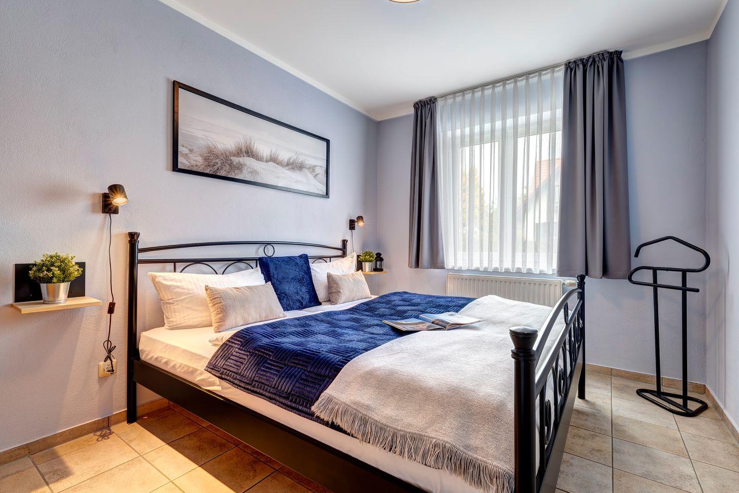 Das angrenzende Schlafzimmer ist mit einem hochwertigen Doppelbett, einem geräumigen Kleiderschrank sowie Verdunklungsmöglichkeiten ausgestattet und sorgt für erholsame Nächte.