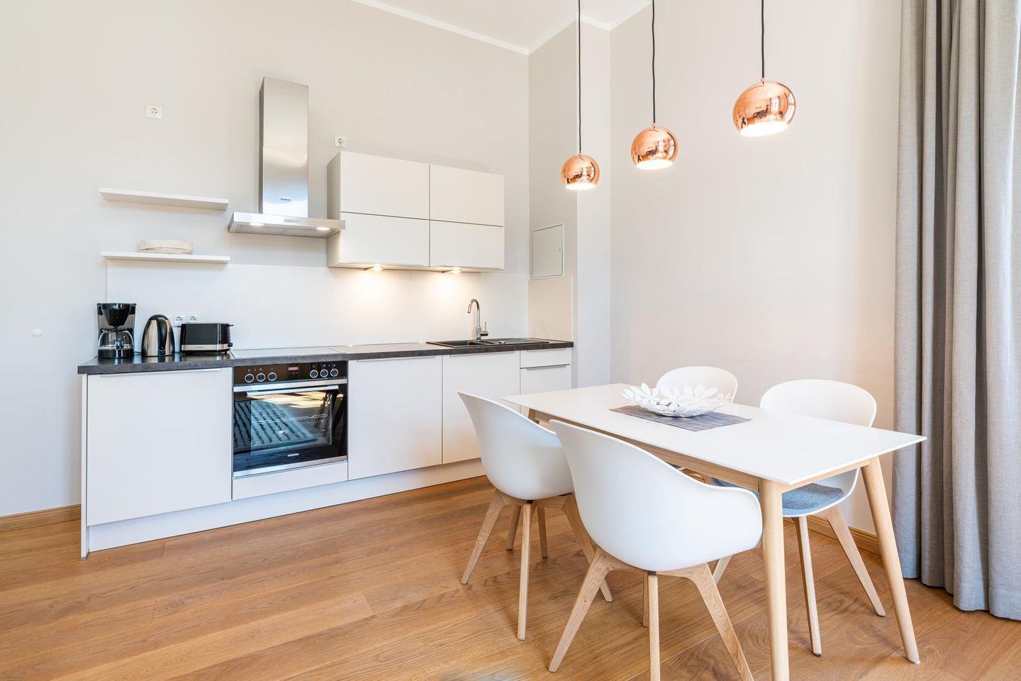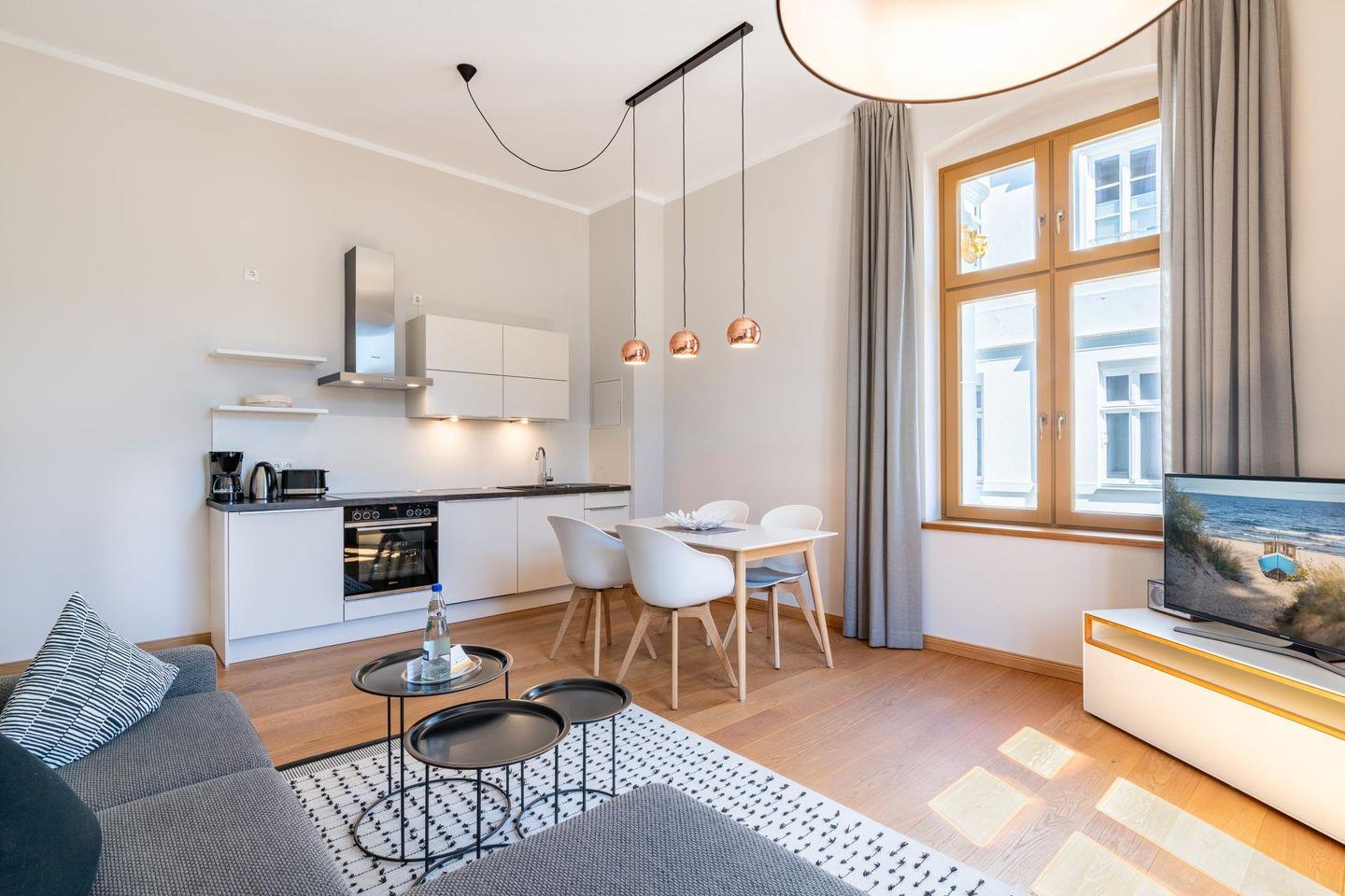 Auch auf dieser Etage sorgen die hohen, lichtdurchfluteten Räume für eine Wohnatmosphäre der ganz besonderen Art. In der Villa Marie wurde der Charakter des alten Hauses geschmackvoll kombiniert mit den modernen Ansprüchen von heute. Im großzügigen Wohnzimmer gibt es neben einer gemütlichen Sitzecke einen modernen Smart-TV, der ein vielfältiges Unterhaltungsprogramm garantiert. Eine Schlafcouch bietet Platz für einen dritten Übernachtungsgast. Die moderne Einbauküche ist mit hochwertigen Markengeräten ausgestattet und lässt kaum einen Wunsch offen. Ein schöner Essplatz befindet sich in unmittelbarer Reichweite.