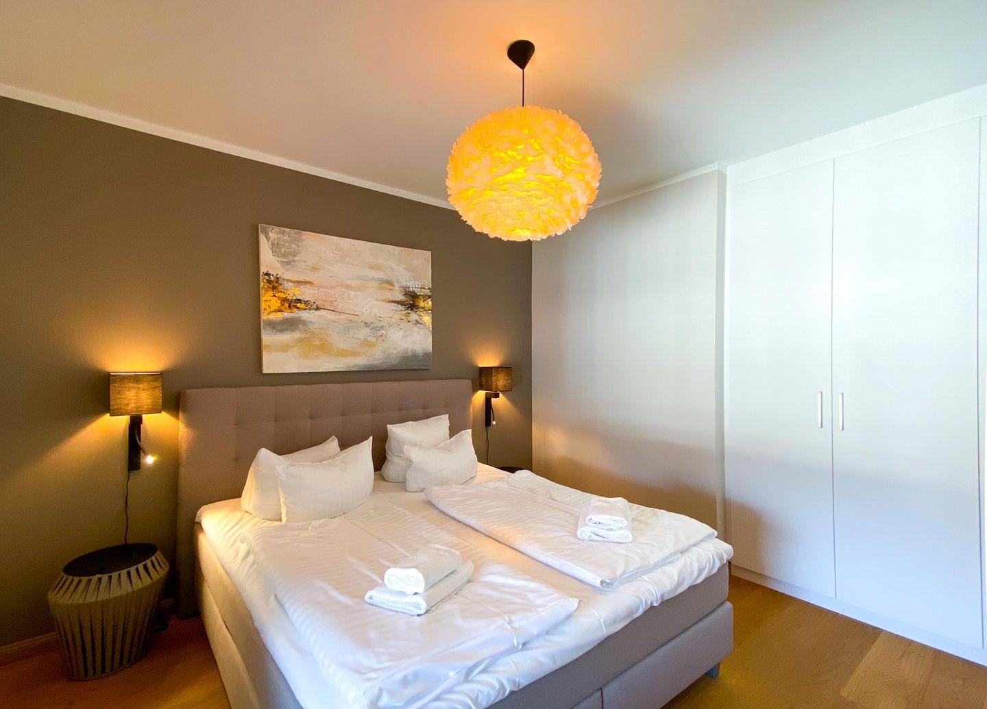 Auch hier gehört ein Smart-TV neben einem hochwertigen Box-Springbett und einem geräumigen Wandschrank zur Ausstattung.