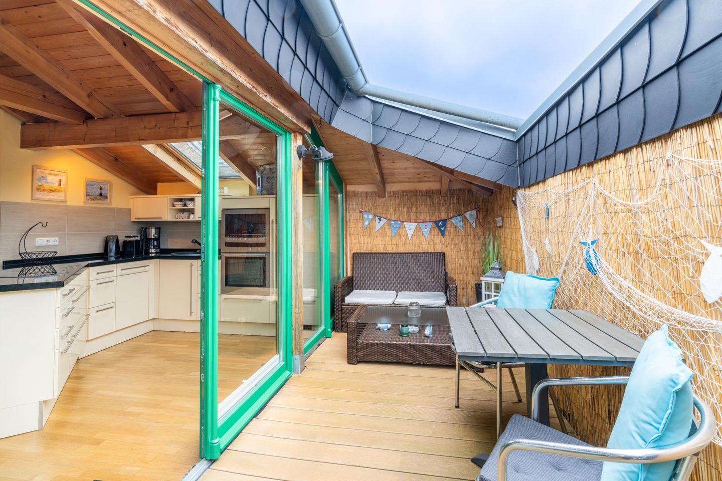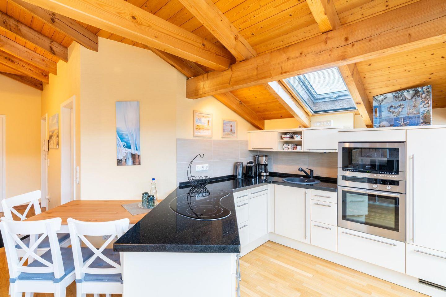 Der offene Wohnraum erstrahlt durch die große Fensterfront in hellem Licht. In der komfortablen Sitzecke lassen sich gemütliche Abendstunden verbringen. Die großzügige Wohnküche lädt zum Kochen und Backen ein. Am Tisch ist Platz für zwei Personen und für ausgedehnte Spielabende, das perfekte Urlaubsdinner oder den Laptop. Mit dieser Wohnung haben Sie außerdem Ihre eigene kleine Urlaubs-Oase gefunden: blick- und windgeschützt können Sie auf der Dachterrasse bis in den Herbst hinein viele Stunden im Freien verbringen.