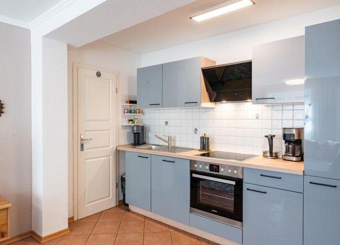 Die voll ausgestattete Küchenzeile ermöglicht ausgiebige Kochabende. Angrenzend an die Küche gibt es einen großzügigen Essplatz.