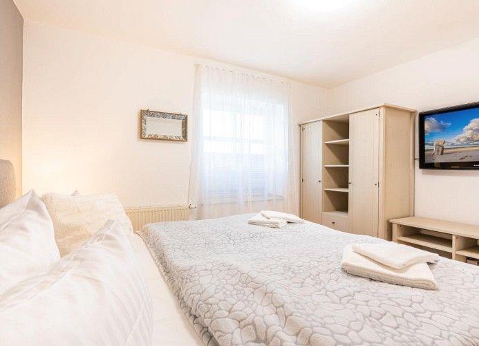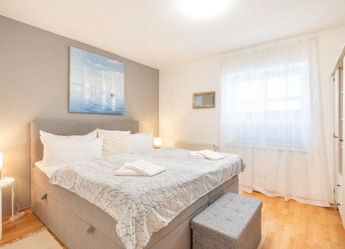 Im Schlafzimmer bietet das Boxspringbett Platz für erholsame Nächte. Hier stehen Ihnen ein zweiter Flachbild-Fernseher und ein Kleiderschrank zur Verfügung.